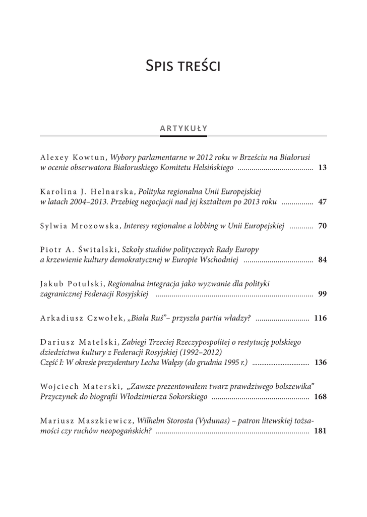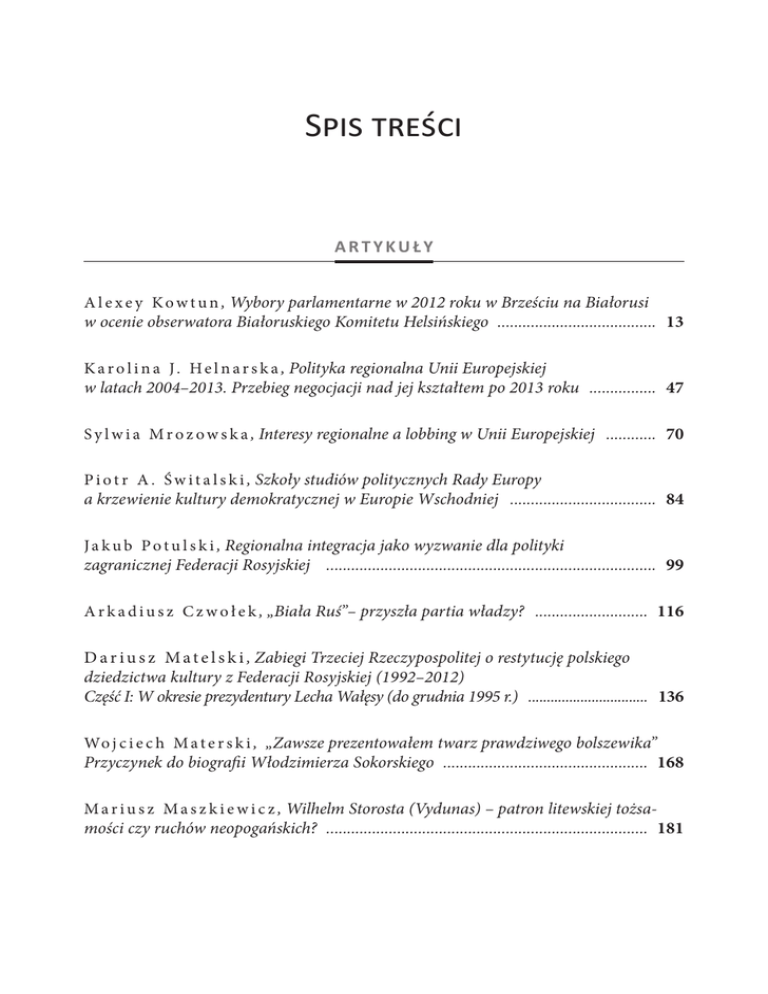 Spis treści Artykuły A l e x e y K o w t u n , Wybory parlamentarne w 2012 roku w Brześciu na Białorusi w ocenie obserwatora Białoruskiego Komitetu Helsińskiego ....................................... 13 K a r o l i n a J . H e l n a r s k a , Polityka regionalna Unii Europejskiej w latach 2004–2013. Przebieg negocjacji nad jej kształtem po 2013 roku ................. 47 S y l w i a M r o z o w s k a , Interesy regionalne a lobbing w Unii Europejskiej ............. 70 P i o t r A . Ś w i t a l s k i , Szkoły studiów politycznych Rady Europy a krzewienie kultury demokratycznej w Europie Wschodniej .................................... 84 J a k u b P o t u l s k i , Regionalna integracja jako wyzwanie dla polityki zagranicznej Federacji Rosyjskiej ................................................................................ 99 A r k a d i u s z C z w o ł e k , „Biała Ruś”– przyszła partia władzy? ............................ 116 D a r i u s z M a t e l s k i , Zabiegi Trzeciej Rzeczypospolitej o restytucję polskiego dziedzictwa kultury z Federacji Rosyjskiej (1992–2012) Część I: W okresie prezydentury Lecha Wałęsy (do grudnia 1995 r.) ................................. 136 Wo j c i e c h M a t e r s k i , „Zawsze prezentowałem twarz prawdziwego bolszewika” Przyczynek do biografii Włodzimierza Sokorskiego .................................................. 168 M a r i u s z M a s z k i e w i c z , Wilhelm Storosta (Vydunas) – patron litewskiej tożsamości czy ruchów neopogańskich? .............................................................................. 181 4 Spis treści М . М . Р е з о н т о в а , Восточно-Казахстанский областной архитектурно- этнографический и природно-ландшафтный музей-заповедник г. УстьКаменогорск, Казахстан ......................................................................................... 208 М а к е е в а М э э р и м , Проблемы формирования единой таможенной территории ......................................................................... 218 А н д р и й Х а р у к , Становление и развитие авиационной промышленности в Украине накануне и в годы Первой мировой войны (на примере фирмы «Анатра») .................................................................................................................. 230 M a c i e j S z c z u r o w s k i , Polityka bezpieczeństwa energetycznego Chińskiej Republiki Ludowej ...................................................................................... 248 S p r aw o z d a n i a M a r i u s z Wo ł o s , Sprawozdanie z III Międzynarodowego Kongresu pt. „Rosja i Polska: pamięć imperiów / imperia pamięci”, 26–28 kwietnia 2012 r. .................. 261 P a t r y k W i t c z a k , Sprawozdanie z XVI Międzynarodowej Konferencji Slawistycznej: „Literatury i języki wschodniosłowiańskie wobec swego czasu historycznego”, 21 maja 2013 r. Zielona Góra ............................................................................. 264 Recenzje Woj cie ch St an k ie w icz (re c.) , Barbara Curyło, Negocjacje w procesie rozsze- rzenia Unii Europejskiej na Wschód: uwarunkowania, aktorzy, przebieg, Toruń 2012 ............................................................................................................................. 269 R afał Czachor (re c.) , Andrew Wilson, Belarus. The Last European Dictator- ship, New York–London 2011 ..................................................................................... 275 Spis 5 treści Andrzej C ho dubsk i ( re c.) , Piotr Kwiatkiewicz, Przemiany polityczne w Azerbejdżanie. Od republiki radzieckiej do współczesnego państwa, Toruń 2013 .......... 280 Woj cie ch St an k ie w icz (re c.) , Paweł Kost, Ukraina wobec Unii Europejskiej 1991–2010, Toruń 2012 ............................................................................................. 285 Va r i a Asif Usub a lij e w , Strategiczne priorytety polityki kulturalnej Azerbejdżanu ..... 293 S t r e s z c z e n i a w j ę z y k u a n g i e l s k i m ................................................................. 305 S t r e s z c z e n i a w j ę z y k u p o l s k i m ....................................................................... 314 S t r e s z c z e n i a w j ę z y k u r o s y j s k i m ................................................................... 316 W n u m e r z e p i s z ą ....................................................................................................... 324 I n f o r m a c j a d l a a u t o r ó w ........................................................................................ 328
