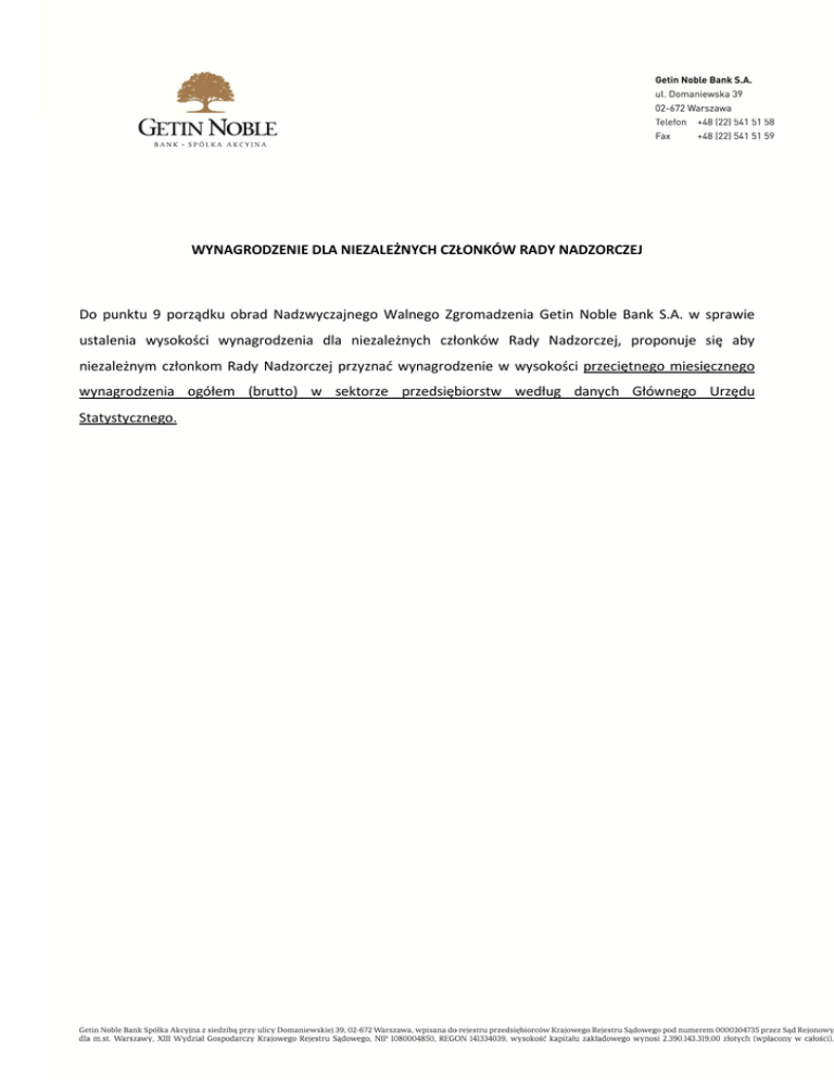 WYNAGRODZENIE DLA NIEZALEŻNYCH CZŁONKÓW RADY NADZORCZEJ Do punktu 9 porządku obrad Nadzwyczajnego Walnego Zgromadzenia Getin Noble Bank S.A. w sprawie ustalenia wysokości wynagrodzenia dla niezależnych członków Rady Nadzorczej, proponuje się aby niezależnym członkom Rady Nadzorczej przyznać wynagrodzenie w wysokości przeciętnego miesięcznego wynagrodzenia ogółem (brutto) w sektorze przedsiębiorstw według danych Głównego Urzędu Statystycznego.