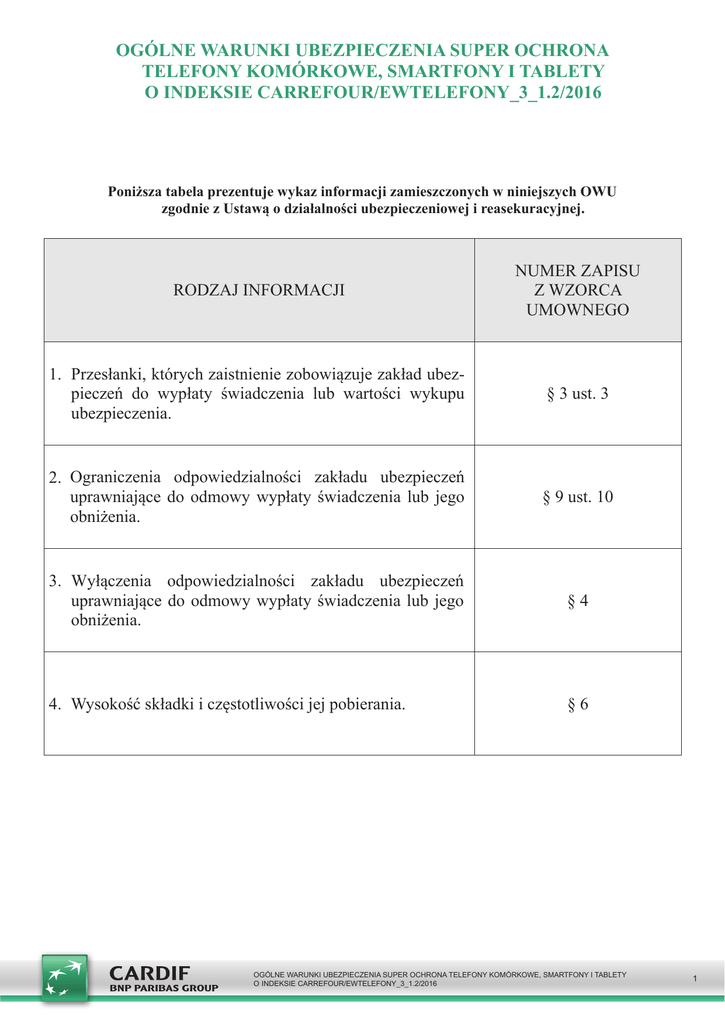 Ogólne Warunki Ubezpieczenia SUPER Ochrona telefony komórkowe, smartfony i tablety o indekSie carrefOur/eWtelefOny_3_1.2/2016 Poniższa tabela prezentuje wykaz informacji zamieszczonych w niniejszych OWU zgodnie z Ustawą o działalności ubezpieczeniowej i reasekuracyjnej. RODZAJ INFORMACJI NUMER ZAPISU Z WZORCA UMOWNEGO 1. Przesłanki,którychzaistnieniezobowiązujezakład ubezpieczeń do wypłaty świadczenia lub wartości wykupu ubezpieczenia. § 3 ust. 3 2. Ograniczenia odpowiedzialności zakładu ubezpieczeń uprawniające do odmowy wypłaty świadczenia lub jego obniżenia. § 9 ust. 10 3. Wyłączenia odpowiedzialności zakładu ubezpieczeń uprawniające do odmowy wypłaty świadczenia lub jego obniżenia. §4 4. Wysokość składki i częstotliwości jej pobierania. §6 Ogólne Warunki Ubezpieczenia SUPER Ochrona telefony komórkowe, smartfony i tablety o indekSie carrefOur/eWtelefOny_3_1.2/2016 1 §1 POSTANOWIENIA OGÓLNE 1. 2. 3. §2 Ogólne Warunki Ubezpieczenia telefonów komórkowych, smartfonów i tabletów (dalej „OWU”) stosuje się w Umowach ubezpieczenia zawieranych pomiędzy Cardif Assurances Risques Divers S.A. Oddział w Polsce, z siedzibą w Warszawie przy pl. Piłsudskiego 2 (dalej: „Ubezpieczyciel) z Ubezpieczającymi, które dotyczą ubezpieczenia telefonów komórkowych, smartfonów i tabletów zakupionych w sieci marketów firmy Carrefour Polska Sp. z o.o. z siedzibą w Warszawie, ulica Targowa 72 (dalej: „Carrefour”). Do realizacji postanowień niniejszych OWU w imieniu i na rzecz Ubezpieczyciela uprawnione jest SPB Polska Sp. z o.o. z siedzibą w Warszawie, ul. Grzybowska 45 (dalej „Centrum Autoryzacji Szkód” lub „CAS”). Do zakresu uprawnień CAS należy: 1) weryfikacja ważności uprawnień wynikających z Umowy ubezpieczenia na warunkach określonych w OWU, 2) przyjmowanie zgłoszenia szkody, 3) przyznawanie lub odmowa odszkodowania wynikającego z Umowy ubezpieczenia w imieniu Ubezpieczyciela, 4) przyjmowanie odstąpień od Umowy ubezpieczenia oraz wniosków o zakończenie ochrony ubezpieczeniowej w związku z wygaśnięciem odpowiedzialności Ubezpieczyciela, 5) przyjmowanie wniosków o zmianę danych osobowych. DEFINICJE Terminom użytym w OWU oraz we wszelkich innych dokumentach składających się na treść Umowy ubezpieczenia nadano następujące znaczenia: 1) Akcesoria dodatkowe – zdefiniowane przez producenta doposażenie niestanowiące kompletu eksploatacyjnego z ubezpieczonym Sprzętem. 2) Cena zakupu – kwota brutto (wraz z podatkiem VAT), za którą Konsumentowi jest oferowany Sprzęt, nieuwzględniająca rabatu przyznanego przez Carrefour . 3) Centrum Autoryzacji Szkód („CAS”) – SPB Polska Sp. z o.o. z siedzibą w Warszawie, ul. Grzybowska 45, podmiot współpracujący z Ubezpieczycielem wskazany do kontaktu z Ubezpieczonymi w celu przyjęcia zgłoszenia szkody, przeprowadzenia procesu likwidacji szkody i/lub udzielenia świadczenia według OWU. 4) Karta upominkowa Carrefour – plastikowa karta typu pre-paid lub bon papierowy, wystawiane na okaziciela, o równowartości odpowiadającej Wartości wymiany umożliwiające dokonywanie zakupu towarów z oferty handlowej Carrefour. 5) Konsument – osoba fizyczna dokonująca czynności prawnej niezwiązanej bezpośrednio z jej działalnością gospodarczą lub zawodową, w rozumieniu art. 221 Kodeksu cywilnego. 6) Kradzież – za kradzież rozumie się kradzież z włamaniem, o którym mowa w art. 279 k. k tj. zabór Sprzętu przez sprawcę z zamkniętego budynku, pomieszczenia lub z pojazdu poprzez pokonanie zabezpieczeń przy użyciu siły lub/i narzędzi lub oryginalnym kluczem zdobytym wskutek przestępstwa lub kluczem podrobionym. 7) Materiały eksploatacyjne – materiały zdefiniowane przez producenta jako materiał eksploatacyjny lub zużywająca się część, podlegająca okresowej wymianie, niezbędne do funkcjonowania Sprzętu. 8) Nieszczęśliwy wypadek – nagłe zdarzenie, które nastąpiło w okresie odpowiedzialności Ubezpieczyciela, wywołane wyłącznie i bezpośrednio przyczyną zewnętrzną, przypadkowe, niezależne od woli i stanu zdrowia Ubezpieczonego, polegające na nagłym działaniu mechanicznej siły zewnętrznej, powodującej przerwanie funkcji lub nieprawidłowe funkcjonowanie Sprzętu lub którejkolwiek z jego części, wymagające naprawy w celu przywrócenia prawidłowej funkcjonalności Sprzętu. 9) Osoby bliskie – osoby zamieszkałe na stałe z Ubezpieczającym i prowadzące z nim wspólne gospodarstwo domowe (współmałżonek lub konkubent, wstępni, zstępni, rodzeństwo, teściowie, zięciowie, synowe, przysposabiający i przysposobieni). 10) Osoba składająca Skargę – – Ubezpieczający, Ubezpieczony lub Uprawniony z Umowy Ubezpieczenia. 11) Osoba trzecia – uważa się wszystkie osoby pozostające poza stosunkiem ubezpieczeniowym, niewymienione w pkt 9) powyżej. 12) Rabunek Sprzętu – zabór Sprzętu przez sprawcę poprzez użycie siły lub groźbę użycia siły wobec Użytkownika, noszący znamiona czynu określonego w art. 280 Kodeksu karnego, dokonany względem Użytkownika przez osobę trzecią. 13) Skarga – wystąpienie Osoby składającej Skargę dotyczące jakości usług świadczonych przez Ubezpieczyciela, w tym zawarcia i realizacji Umowy ubezpieczenia lub wykonywanej przez Ubezpieczyciela działalności. Przez Skargę należy również rozumieć reklamację, zażalenie lub odwołanie od decyzji Ubezpieczyciela. 14) Składka – kwota należna Ubezpieczycielowi od Ubezpieczającego z tytułu udzielania ochrony ubezpieczeniowej. 15) Sprzęt – fabrycznie nowy sprzęt zakupiony przez Ubezpieczającego 16) 17) 18) 19) 20) 21) 22) 23) 24) 25) 26) 27) 28) w sieci marketów Carrefour, którego dane figurują we Wnioskopolisie i w dokumencie zakupu potwierdzającym dokonanie opłaty za Sprzęt oraz uiszczenie Składki za jego ubezpieczenie. Ochroną ubezpieczeniową może być objęty Sprzęt, którego Cena