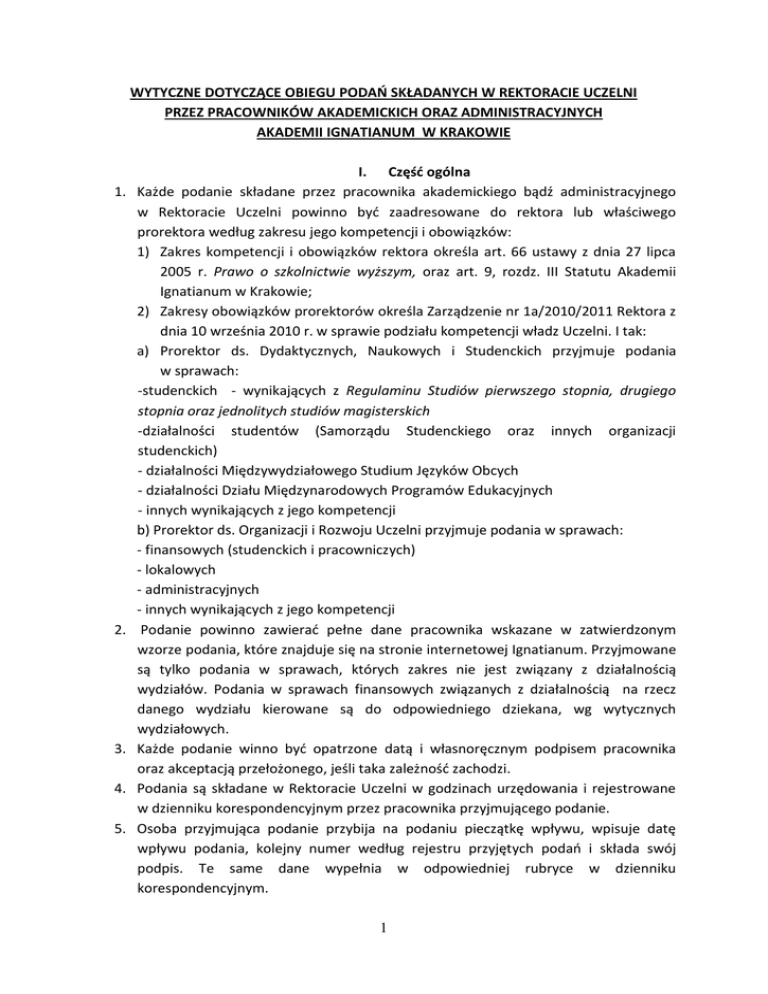 WYTYCZNE DOTYCZĄCE OBIEGU PODAŃ SKŁADANYCH W REKTORACIE UCZELNI PRZEZ PRACOWNIKÓW AKADEMICKICH ORAZ ADMINISTRACYJNYCH AKADEMII IGNATIANUM W KRAKOWIE 1. 2. 3. 4. 5. I. Część ogólna Każde podanie składane przez pracownika akademickiego bądź administracyjnego w Rektoracie Uczelni powinno byd zaadresowane do rektora lub właściwego prorektora według zakresu jego kompetencji i obowiązków: 1) Zakres kompetencji i obowiązków rektora określa art. 66 ustawy z dnia 27 lipca 2005 r. Prawo o szkolnictwie wyższym, oraz art. 9, rozdz. III Statutu Akademii Ignatianum w Krakowie; 2) Zakresy obowiązków prorektorów określa Zarządzenie nr 1a/2010/2011 Rektora z dnia 10 września 2010 r. w sprawie podziału kompetencji władz Uczelni. I tak: a) Prorektor ds. Dydaktycznych, Naukowych i Studenckich przyjmuje podania w sprawach: -studenckich - wynikających z Regulaminu Studiów pierwszego stopnia, drugiego stopnia oraz jednolitych studiów magisterskich -działalności studentów (Samorządu Studenckiego oraz innych organizacji studenckich) - działalności Międzywydziałowego Studium Języków Obcych - działalności Działu Międzynarodowych Programów Edukacyjnych - innych wynikających z jego kompetencji b) Prorektor ds. Organizacji i Rozwoju Uczelni przyjmuje podania w sprawach: - finansowych (studenckich i pracowniczych) - lokalowych - administracyjnych - innych wynikających z jego kompetencji Podanie powinno zawierad pełne dane pracownika wskazane w zatwierdzonym wzorze podania, które znajduje się na stronie internetowej Ignatianum. Przyjmowane są tylko podania w sprawach, których zakres nie jest związany z działalnością wydziałów. Podania w sprawach finansowych związanych z działalnością na rzecz danego wydziału kierowane są do odpowiedniego dziekana, wg wytycznych wydziałowych. Każde podanie winno byd opatrzone datą i własnoręcznym podpisem pracownika oraz akceptacją przełożonego, jeśli taka zależnośd zachodzi. Podania są składane w Rektoracie Uczelni w godzinach urzędowania i rejestrowane w dzienniku korespondencyjnym przez pracownika przyjmującego podanie. Osoba przyjmująca podanie przybija na podaniu pieczątkę wpływu, wpisuje datę wpływu podania, kolejny numer według rejestru przyjętych podao i składa swój podpis. Te same dane wypełnia w odpowiedniej rubryce w dzienniku korespondencyjnym. 1 6. Podanie zostaje przedłożone Rektorowi/właściwemu prorektorowi. 7. Podanie jest rozpatrywane do 14 dni od momentu złożenia i zarejestrowania go w Rektoracie Uczelni z uzasadnieniem w przypadku udzielenia decyzji negatywnej. 8. Odpowiedzi na podania są przekazywane w następujących formach: - odpowiedzi pisemne do odbioru osobistego w Rektoracie Uczelni w godzinach urzędowania, - przesyłanie zeskanowanego podania wraz z odpowiedzią Rektora/właściwego prorektora na adres zainteresowanej osoby z pośrednictwem poczty elektronicznej, - do odbioru w Dziale Księgowo-Finansowym Uczelni (w przypadku, gdy pismo dotyczy spraw finansowych). 9. Podania składane przez pracowników Ignatianum w oryginale wraz z kopiami odpowiedzi przekazywane są do Działu Kadr i umieszczane w teczce personalnej danego pracownika, lub w Dziale Księgowo-Finansowym. W Rektoracie Uczelni pozostają kopie podao i odpowiedzi. II. 1. 2. 3. 4. 5. 6. Dofinansowanie/sfinansowanie uczestnictwa w konferencjach, szkoleniach, warsztatach etc. Podanie o dofinansowanie/sfinansowanie uczestnictwa w konferencjach, szkoleniach, warsztatach, należy złożyd do Prorektora ds. Organizacji i Rozwoju Uczelni (tylko i wyłącznie jeśli podanie o dofinansowanie/sfinansowanie nie jest związane z działalnością wydziału). Podania związane z działalnością wydziału nie będą przyjmowane w Rektoracie Uczelni. Do podania należy dołączyd kopię/kserokopię zaproszenia na konferencję, szkolenie, warsztaty wraz z informacją o koszcie uczestnictwa i innymi danymi wskazanymi w formularzu. W podaniu należy zawrzed informacje o przewidywanym koszcie transportu (w przypadku, kiedy chodzi o wyjazd poza Kraków), czasie pobytu oraz o dokładne terminy wyjazdu i przyjazdu oraz o koszcie pobytu i uczestnictwa: a) w przypadku szkoleo stosuje się procedurę P.S – 6.1 – Szkolenia pracownicze. Informacje dostępne są w Dziale Kadr, b) w pozostałych przypadkach stosuje się niniejsze wytyczne. Każde podanie powinno byd podpisane przez kierownika danej jednostki, jeśli takowa zależnośd zachodzi. Po uzyskaniu zgody na dofinansowanie/sfinansowanie uczestnictwa w konferencjach, szkoleniach, warsztatach etc., dokumenty z Rektoratu Uczelni zostają przekazane do Działu Księgowo-Finansowego, gdzie należy zgłosid się po delegację przed wyjazdem oraz rozliczenie jej po przyjeździe. W przypadku braku zgody decyzja zostaje przekazana zainteresowanemu do odbioru osobistego w Rektoracie Uczelni. 2 III. 1. 2. 3. 4. Podania w sprawach organizacyjnych i finansowych związanych z konferencjami/uroczystościami w Ignatianum Podanie w sprawach organizacyjnych i finansowych związanych z konferencjami/uroczystościami w Ignatianum należy złożyd do Prorektora ds. Organizacji i Rozwoju Uczelni, tylko i wyłącznie, gdy wydarzenie jest ogólnouczelniane (nie jest organizowane przez konkretny wydział). Do podania należy dołączyd przynajmniej wstępny plan konferencji, informacje organizacyjne oraz przewidywany kosztorys. Po rozpatrzeniu podania, w przypadku zgody, jedna kopia decyzji zostaje przekazana organizatorom w celu umożliwienia dalszych działao organizacyjnych, druga kopia pozostaje w Rektoracie Uczelni, oryginał zostaje przekazany do Działu Księgowo-Finansowego Uczelni. W przypadku braku zgody decyzja zostaje przekazana organizatorom do odbioru osobistego w Rektoracie Uczelni. IV. Podania składane przez nauczycieli akademickich w sprawie udzielenia płatnego urlopu naukowego lub zdrowotnego 1. Każde podanie składane przez pracownika akademickiego w Rektoracie Uczeln