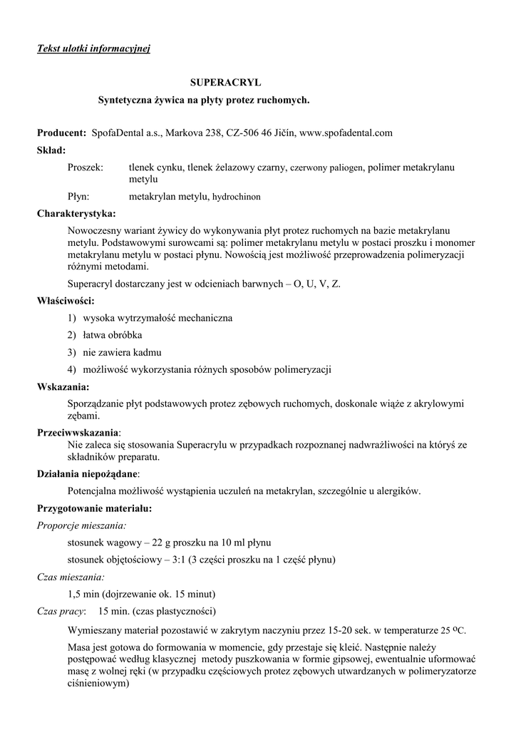Tekst ulotki informacyjnej SUPERACRYL Syntetyczna Ŝywica na płyty protez ruchomych. Producent: SpofaDental a.s., Markova 238, CZ-506 46 Jičín, www.spofadental.com Skład: Proszek: tlenek cynku, tlenek Ŝelazowy czarny, czerwony paliogen, polimer metakrylanu metylu Płyn: metakrylan metylu, hydrochinon Charakterystyka: Nowoczesny wariant Ŝywicy do wykonywania płyt protez ruchomych na bazie metakrylanu metylu. Podstawowymi surowcami są: polimer metakrylanu metylu w postaci proszku i monomer metakrylanu metylu w postaci płynu. Nowością jest moŜliwość przeprowadzenia polimeryzacji róŜnymi metodami. Superacryl dostarczany jest w odcieniach barwnych – O, U, V, Z. Właściwości: 1) wysoka wytrzymałość mechaniczna 2) łatwa obróbka 3) nie zawiera kadmu 4) moŜliwość wykorzystania róŜnych sposobów polimeryzacji Wskazania: Sporządzanie płyt podstawowych protez zębowych ruchomych, doskonale wiąŜe z akrylowymi zębami. Przeciwwskazania: Nie zaleca się stosowania Superacrylu w przypadkach rozpoznanej nadwraŜliwości na któryś ze składników preparatu. Działania niepoŜądane: Potencjalna moŜliwość wystąpienia uczuleń na metakrylan, szczególnie u alergików. Przygotowanie materiału: Proporcje mieszania: stosunek wagowy – 22 g proszku na 10 ml płynu stosunek objętościowy – 3:1 (3 części proszku na 1 część płynu) Czas mieszania: 1,5 min (dojrzewanie ok. 15 minut) Czas pracy: 15 min. (czas plastyczności) Wymieszany materiał pozostawić w zakrytym naczyniu przez 15-20 sek. w temperaturze 25 oC. Masa jest gotowa do formowania w momencie, gdy przestaje się kleić. Następnie naleŜy postępować według klasycznej metody puszkowania w formie gipsowej, ewentualnie uformować masę z wolnej ręki (w przypadku częściowych protez zębowych utwardzanych w polimeryzatorze ciśnieniowym) Sposoby polimeryzacji: Polimeryzacja klasyczna: 1) Puszkę zanurzyć w zimnej wodzie 2) Przez około 30 minut podnosić temperaturę do 70 oC 3) Utrzymać temperaturę przez następnych 30 minut. 4) Przez około 30 minut podnosić temperaturę do około 100 oC 5) Utrzymać temperaturę przez następnych 30 minut. 6) Całkowity czas polimeryzacji wynosi 2 godziny. Polimeryzacja przyspieszona: 1) Puszkę zanurzyć w zimnej wodzie 2) Podnieść temperaturę do 100 oC 3) Przez 45 minut utrzymać temperaturę. Polimeryzacja za pomocą tzw. Szybkowaru 1) Puszkę naleŜy umieścić we wrzącej wodzie 100 oC 2) Przez 40 minut utrzymać temperaturę. Ten sposób polimeryzacji nadaje się tylko do wykonania częściowych protez zębowych maks. do 4 zębów. Polimeryzacja w polimeryzatorze ciśnieniowym Polimeryzacja bez puszkowania bezpośrednio na modelu Ciśnienie 0,6 Mpa Temperatura 90-110 oC Czas 10-15 minut PowyŜszy sposób polimeryzacji nadaje się wyłącznie do wykonywania mniejszych częściowych protez i dokonywania napraw protez. Uwaga: materiał łatwopalny, I klasy niebezpieczeństwa. Przestrzegać przepisów bezpieczeństwa. Przechowywanie: Przechowywać w suchym i ciemnym miejscu w temperaturze 5ºC do 25ºC, w szczelnie zamkniętym pojemniku. Okres waŜności: 4 lata Opakowanie: proszek: 500g płyn: 250g Produkt odpowiada wymaganiom normy ISO 1567.