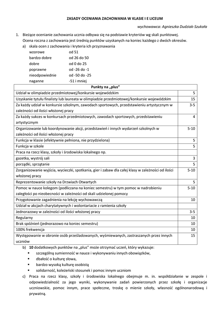 ZASADY OCENIANIA ZACHOWANIA W KLASIE I E LICEUM wychowawca: Agnieszka Dudziak-Szukała 1. Bieżące ocenianie zachowania ucznia odbywa się na podstawie kryteriów wg skali punktowej. Ocena roczna z zachowania jest średnią punktów uzyskanych na koniec każdego z dwóch okresów. a) skala ocen z zachowania i kryteria ich przyznawania wzorowe od 51 bardzo dobre od 26 do 50 dobre od 0 do 25 poprawne od -26 do -1 nieodpowiednie od -50 do -25 naganne -51 i mniej Punkty na „plus” Udział w olimpiadzie przedmiotowej/konkursie wojewódzkim 5 Uzyskanie tytułu finalisty lub laureata w olimpiadzie przedmiotowej/konkursie wojewódzkim 15 Za każdy udział w konkursie szkolnym, zawodach sportowych, przedstawieniu artystycznym w 3-5 zależności od ilości włożonej pracy Za każdy sukces w konkursach przedmiotowych, zawodach sportowych, przedstawieniu 4 artystycznym Organizowanie lub koordynowanie akcji, przedstawień i innych wydarzeń szkolnych w 5-10 zależności od ilości włożonej pracy Funkcja w klasie (efektywnie pełniona, nie przydzielona) 5 Funkcja w szkole 5 Praca na rzecz klasy, szkoły i środowiska lokalnego np. gazetka, wystrój sali 3 porządki, sprzątanie 5 Zorganizowanie wyjścia, wycieczki, spotkania, gier i zabaw dla całej klasy w zależności od ilości 5-10 włożonej pracy Reprezentowanie szkoły na Drzwiach Otwartych 5 Pomoc w nauce kolegom (podliczana na koniec semestru) w tym pomoc w nadrobieniu 5-10 zaległości po nieobecności w zależności od skali udzielonej pomocy Przygotowanie zagadnienia na lekcję wychowawczą 10 Udział w akcjach charytatywnych i wolontariacie z ramienia szkoły Jednorazowy w zależności od ilości włożonej pracy 3-5 Regularny 10 Brak spóźnień (jednorazowo na koniec semestru) 10 100% frekwencja 10 Występowanie w obronie osób prześladowanych, wyśmiewanych, zastraszanych przez innych 15 uczniów b) 10 dodatkowych punktów na „plus” może otrzymać uczeń, który wykazuje: szczególną sumienność w nauce i wykonywaniu innych obowiązków, dbałość o kulturę słowa, bardzo wysoką kulturę osobistą solidarność, koleżeński stosunek i pomoc innym uczniom c) Praca na rzecz klasy, szkoły i środowiska lokalnego obejmuje m. in. współdziałanie w zespole i odpowiedzialność za jego wyniki, wykonywanie zadań powierzonych przez szkołę i organizacje uczniowskie, pomoc innym, prace społeczne, troskę o mienie szkoły, własność ogólnonarodową i prywatną. Punkty na „minus” Za każdorazowe przeszkadzanie na lekcji Niewykonywanie uzasadnionych poleceń nauczyciela i pracowników szkoły Aroganckie zachowanie wobec nauczyciela i innych pracowników szkoły Ubliżanie koledze, nauczycielowi lub pracownikowi szkoły Zaczepki słowne, wyśmiewanie, zastraszanie innych uczniów (dręczenie) Zaczepki fizyczne Bójka Pobicie Oszukiwanie kolegów, nauczyciela lub pracownika szkoły Wulgarne słownictwo Opuszczanie szkoły w trakcie zajęć Niszczenie mienia szkoły i innych osób Zaśmiecanie otoczenia Za każde spóźnienie na lekcję Za każdą nieusprawiedliwioną nieobecność Niewykonanie zobowiązania Wyłudzanie pieniędzy Szantaż, groźby Kradzież Posiadanie papierosów, alkoholu, narkotyków Palenie papierosów Picie alkoholu, zażywanie narkotyków Powtarzające się używanie telefonów komórkowych w trakcie lekcji Brak stroju galowego w trakcie uroczystości szkolnych Zachowania godzące w dobre imię szkoły również w czasie pobytu poza jej terenem Uczestniczenie w działaniach zagrażających bezpieczeństwu własnemu i innych Powtarzające się jedzenie podczas lekcji Nieprzestrzeganie zasad fair play w czasie konkursów i zawodów sportowych Nieprzestrzeganie zasad savoir-vivre’u Fałszowanie dokumentów, podpisów (każdorazowe) 2 5 5 10 15 15 20 30 10 5 5 20 3 1 3 5 20 15 20 10 15 20 2 2 5 5 2 5 5 20 2. Uwagi dotyczące zachowania ucznia odnotowywane są w klasowym zeszycie uwag. W ocenie zachowania ucznia bierze się pod uwagę także uwagi ustne przekazywane przez nauczycieli, pracowników szkoły oraz innych uczniów. 3. Tryb i warunki uzyskiwania oceny z zachowania wyższej niż proponowana. a) warunkiem podniesienia oceny z zachowania jest brak nieobecności nieusprawiedliwionych w ciągu całego semestru oraz systematyczna praca w ciągu całego okresu (roku szkolnego) na rzecz szkoły i klasy. b) w celu podniesienia oceny z zachowania uczeń musi uzyskać brakującą do oceny wyższej ilość punktów poprzez wykonanie pracy na rzecz klasy lub szkoły. Pracę uczeń może wybrać samodzielnie za zgodą wychowawcy lub wykonać pracę wskazaną przez wychowawcę.