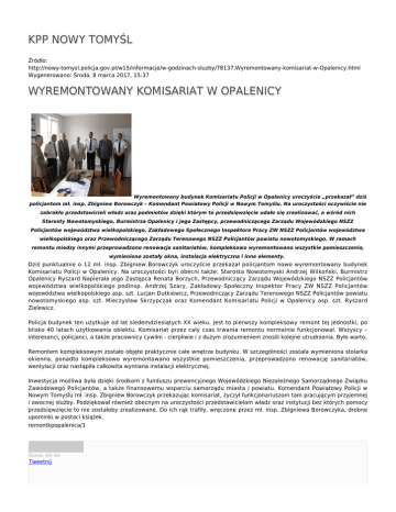 KPP NOWY TOMYŚL Źródło: http://nowy-tomysl.policja.gov.pl/w15/informacje/w-godzinach-sluzby/78137,Wyremontowany-komisariat-w-Opalenicy.html Wygenerowano: Środa, 8 marca 2017, 15:37 WYREMONTOWANY KOMISARIAT W OPALENICY Wyremontowany budynek Komisariatu Policji w Opalenicy uroczyście „przekazał” dziś policjantom mł. insp. Zbigniew Borowczyk – Komendant Powiatowy Policji w Nowym Tomyślu. Na uroczystości oczywiście nie zabrakło przedstawicieli władz oraz podmiotów dzięki którym to przedsięwzięcie udało się zrealizować, a wśród nich Starosty Nowotomyskiego, Burmistrza Opalenicy i jego Zastępcy, przewodniczącego Zarządu Wojewódzkiego NSZZ Policjantów województwa wielkopolskiego, Zakładowego Społecznego Inspektora Pracy ZW NSZZ Policjantów województwa wielkopolskiego oraz Przewodniczącego Zarządu Terenowego NSZZ Policjantów powiatu nowotomyskiego. W ramach remontu miedzy innymi przeprowadzono renowacje sanitariatów, kompleksowo wyremontowano wszystkie pomieszczenia, wymienione zostały okna, instalacja elektryczna i inne elementy. Dziś punktualnie o 12 mł. insp. Zbigniew Borowczyk uroczyście przekazał policjantom nowo wyremontowany budynek Komisariatu Policji w Opalenicy. Na uroczystości byli obecni także: Starosta Nowotomyski Andrzej Wilkoński, Burmistrz Opalenicy Ryszard Napierała jego Zastępca Renata Borzych, Przewodniczący Zarządu Wojewódzkiego NSZZ Policjantów województwa wielkopolskiego podinsp. Andrzej Szary, Zakładowy Społeczny Inspektor Pracy ZW NSZZ Policjantów województwa wielkopolskiego asp. szt. Lucjan Dutkiewicz, Przewodniczący Zarządu Terenowego NSZZ Policjantów powiatu nowotomyskiego asp. szt. Mieczysław Skrzypczak oraz Komendant Komisariatu Policji w Opalenicy asp. szt. Ryszard Zielewicz. Policja budynek ten użytkuje od lat siedemdziesiątych XX wieku. Jest to pierwszy kompleksowy remont tej jednostki, po blisko 40 latach użytkowania obiektu. Komisariat przez cały czas trwania remontu normalnie funkcjonował. Wszyscy – interesanci, policjanci, a także pracownicy cywilni - cierpliwie i z dużym zrozumieniem znosili kolejne utrudnienia. Było warto. Remontem kompleksowym zostało objęte praktycznie całe wnętrze budynku. W szczególności została wymieniona stolarka okienna, ponadto kompleksowo wyremontowano wszystkie pomieszczenia, przeprowadzono renowację sanitariatów, wentylacji oraz nastąpiła całkowita wymiana instalacji elektrycznej. Inwestycja możliwa była dzięki środkom z funduszu prewencyjnego Wojewódzkiego Niezależnego Samorządnego Związku Zawodowego Policjantów, a także finansowemu wsparciu samorządu miasta i powiatu. Komendant Powiatowy Policji w Nowym Tomyślu mł. insp. Zbigniew Borowczyk przekazując komisariat, życzył funkcjonariuszom tam pracującym przyjemnej i owocnej służby. Podziękował również obecnym na uroczystości przedstawicielom władz oraz instytucji bez których pomocy przedsięwzięcie to nie zostałoby zrealizowane. Do ich rąk trafiły, wręczone przez mł. insp. Zbigniewa Borowczyka, drobne upominki w postaci książek. remontkpopalenica/1 Ocena: 0/5 (0) Tweetnij
