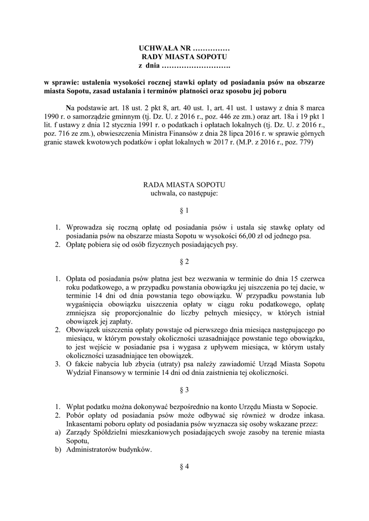 UCHWAŁA NR …………… RADY MIASTA SOPOTU z dnia ………………………. w sprawie: ustalenia wysokości rocznej stawki opłaty od posiadania psów na obszarze miasta Sopotu, zasad ustalania i terminów płatności oraz sposobu jej poboru Na podstawie art. 18 ust. 2 pkt 8, art. 40 ust. 1, art. 41 ust. 1 ustawy z dnia 8 marca 1990 r. o samorządzie gminnym (tj. Dz. U. z 2016 r., poz. 446 ze zm.) oraz art. 18a i 19 pkt 1 lit. f ustawy z dnia 12 stycznia 1991 r. o podatkach i opłatach lokalnych (tj. Dz. U. z 2016 r., poz. 716 ze zm.), obwieszczenia Ministra Finansów z dnia 28 lipca 2016 r. w sprawie górnych granic stawek kwotowych podatków i opłat lokalnych w 2017 r. (M.P. z 2016 r., poz. 779) RADA MIASTA SOPOTU uchwala, co następuje: §1 1. Wprowadza się roczną opłatę od posiadania psów i ustala się stawkę opłaty od posiadania psów na obszarze miasta Sopotu w wysokości 66,00 zł od jednego psa. 2. Opłatę pobiera się od osób fizycznych posiadających psy. §2 1. Opłata od posiadania psów płatna jest bez wezwania w terminie do dnia 15 czerwca roku podatkowego, a w przypadku powstania obowiązku jej uiszczenia po tej dacie, w terminie 14 dni od dnia powstania tego obowiązku. W przypadku powstania lub wygaśnięcia obowiązku uiszczenia opłaty w ciągu roku podatkowego, opłatę zmniejsza się proporcjonalnie do liczby pełnych miesięcy, w których istniał obowiązek jej zapłaty. 2. Obowiązek uiszczenia opłaty powstaje od pierwszego dnia miesiąca następującego po miesiącu, w którym powstały okoliczności uzasadniające powstanie tego obowiązku, to jest wejście w posiadanie psa i wygasa z upływem miesiąca, w którym ustały okoliczności uzasadniające ten obowiązek. 3. O fakcie nabycia lub zbycia (utraty) psa należy zawiadomić Urząd Miasta Sopotu Wydział Finansowy w terminie 14 dni od dnia zaistnienia tej okoliczności. §3 1. Wpłat podatku można dokonywać bezpośrednio na konto Urzędu Miasta w Sopocie. 2. Pobór opłaty od posiadania psów może odbywać się również w drodze inkasa. Inkasentami poboru opłaty od posiadania psów wyznacza się osoby wskazane przez: a) Zarządy Spółdzielni mieszkaniowych posiadających swoje zasoby na terenie miasta Sopotu, b) Administratorów budynków. §4 1. Inkasentom za pobór opłaty od posiadania psów w drodze inkasa ustala się wynagrodzenie w wysokości 15% zainkasowanej sumy. 2. Inkasent pobierający opłatę od posiadania psa odprowadza ją co miesiąc do budżetu miasta do dnia 10 miesiąca następującego po miesiącu, w którym pobrano opłatę a w miesiącu grudniu do ostatniego dnia tego miesiąca. §5 Zwalnia się z opłaty od posiadania psów: będących w posiadaniu osób powyżej 65 roku życia, samodzielnie gospodarujących i posiadających tylko jedno źródło dochodu na gospodarstwo domowe. Zwolnienie z opłaty dotyczy tylko jednego psa, będących w posiadaniu osób zaliczonych do znacznego stopnia niepełnosprawności, w rozumieniu przepisów o rehabilitacji zawodowej i społecznej oraz zatrudnieniu osób niepełnosprawnych (z tytułu posiadania jednego psa). Zwolnienia dokonuje się na podstawie legitymacji inwalidzkiej, bądź zaświadczenia potwierdzającego stopień niepełnosprawności, będących w posiadaniu podatników podatku rolnego od gospodarstw rolnych usytuowanych na terenie miasta Sopotu (zwolnienie dotyczy dwóch psów), nabytych w Schronisku dla bezdomnych zwierząt w Sopocie, na podstawie zaświadczenia ze schroniska. §6 Wykonanie uchwały powierza się Prezydentowi Miasta Sopotu. §7 Traci moc Uchwała Nr XIII/179/2015 Rady Miasta Sopotu z dnia 23 listopada 2015 r. w sprawie ustalenia wysokości rocznej stawki opłaty od posiadania psów na obszarze miasta Sopotu, zasad ustalania i terminów płatności oraz sposobu jej poboru. §8 Uchwała wchodzi w życie po upływie 14 dni od dnia ogłoszenia w Dzienniku Urzędowym Województwa Pomorskiego z mocą obowiązującą od dnia 1 stycznia 2017 r. PREZYDENT MIASTA /-/ Jacek Karnowski UZASADNIENIE Od 1 stycznia 2008 roku w miejsce podatku od posiadania psów wprowadzono opłatę od posiadania psów. Stawka opłaty w roku 2017 nie może przekroczyć 118,97 zł rocznie od jednego psa. Proponuje się ustalić opłatę od posiadania psów na takim samym poziomie jak w ubiegłym roku - w wysokości 66,- zł od jednego psa rocznie. Termin płatności przedmiotowej opłaty wyznacza się do dnia 15 czerwca roku podatkowego. W proponowanej na 2017 r. uchwale pozostawiono, w stanie obowiązującym w latach poprzednich uściślone warunki zwolnień z opłaty od psów wynikające z ustawy oraz zaproponowane w roku 2011 zwolnienie z tej opłaty właścicieli psów nabytych w Schronisku dla bezdomnych zwierząt w Sopocie, na podstawie zaświadczenia ze schroniska. Planowane na 2017 rok dochody z tytułu tej opłaty wynoszą 30.500,- zł. SKARBNIK MIASTA /-/ Mirosław Goślicki