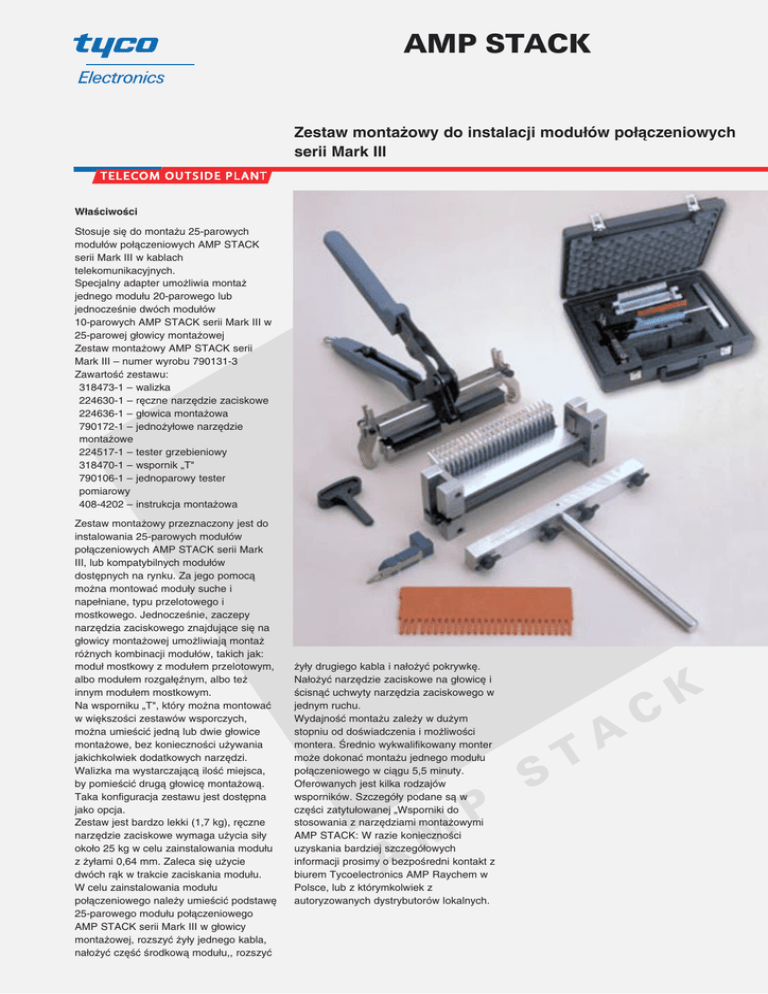 AMP STACK Zestaw monta˝owy do instalacji modu∏ów po∏àczeniowych serii Mark III W∏aÊciwoÊci Stosuje si´ do monta˝u 25-parowych modu∏ów po∏àczeniowych AMP STACK serii Mark III w kablach telekomunikacyjnych. Specjalny adapter umo˝liwia monta˝ jednego modu∏u 20-parowego lub jednoczeÊnie dwóch modu∏ów 10-parowych AMP STACK serii Mark III w 25-parowej g∏owicy monta˝owej Zestaw monta˝owy AMP STACK serii Mark III – numer wyrobu 790131-3 ZawartoÊç zestawu: 318473-1 – walizka 224630-1 – r´czne narz´dzie zaciskowe 224636-1 – g∏owica monta˝owa 790172-1 – jedno˝y∏owe narz´dzie monta˝owe 224517-1 – tester grzebieniowy 318470-1 – wspornik „T" 790106-1 – jednoparowy tester pomiarowy 408-4202 – instrukcja monta˝owa Zestaw monta˝owy przeznaczony jest do instalowania 25-parowych modu∏ów po∏àczeniowych AMP STACK serii Mark III, lub kompatybilnych modu∏ów dost´pnych na rynku. Za jego pomocà mo˝na montowaç modu∏y suche i nape∏niane, typu przelotowego i mostkowego. JednoczeÊnie, zaczepy narz´dzia zaciskowego znajdujàce si´ na g∏owicy monta˝owej umo˝liwiajà monta˝ ró˝nych kombinacji modu∏ów, takich jak: modu∏ mostkowy z modu∏em przelotowym, albo modu∏em rozga∏´ênym, albo te˝ innym modu∏em mostkowym. Na wsporniku „T", który mo˝na montowaç w wi´kszoÊci zestawów wsporczych, mo˝na umieÊciç jednà lub dwie g∏owice monta˝owe, bez koniecznoÊci u˝ywania jakichkolwiek dodatkowych narz´dzi. Walizka ma wystarczajàcà iloÊç miejsca, by pomieÊciç drugà g∏owic´ monta˝owà. Taka konfiguracja zestawu jest dost´pna jako opcja. Zestaw jest bardzo lekki (1,7 kg), r´czne narz´dzie zaciskowe wymaga u˝ycia si∏y oko∏o 25 kg w celu zainstalowania modu∏u z ˝y∏ami 0,64 mm. Zaleca si´ u˝ycie dwóch ràk w trakcie zaciskania modu∏u. W celu zainstalowania modu∏u po∏àczeniowego nale˝y umieÊciç podstaw´ 25-parowego modu∏u po∏àczeniowego AMP STACK serii Mark III w g∏owicy monta˝owej, rozszyç ˝y∏y jednego kabla, na∏o˝yç cz´Êç Êrodkowà modu∏u,, rozszyç ˝y∏y drugiego kabla i na∏o˝yç pokrywk´. Na∏o˝yç narz´dzie zaciskowe na g∏owic´ i Êcisnàç uchwyty narz´dzia zaciskowego w jednym ruchu. WydajnoÊç monta˝u zale˝y w du˝ym stopniu od doÊwiadczenia i mo˝liwoÊci montera. Ârednio wykwalifikowany monter mo˝e dokonaç monta˝u jednego modu∏u po∏àczeniowego w ciàgu 5,5 minuty. Oferowanych jest kilka rodzajów wsporników. Szczegó∏y podane sà w cz´Êci zatytu∏owanej „Wsporniki do stosowania z narz´dziami monta˝owymi AMP STACK: W razie koniecznoÊci uzyskania bardziej szczegó∏owych informacji prosimy o bezpoÊredni kontakt z biurem Tycoelectronics AMP Raychem w Polsce, lub z którymkolwiek z autoryzowanych dystrybutorów lokalnych. A M P S A T C K AMP STACK Tyco, Raychem i AMP sà znakami handlowymi Tyco International. Pokazane tu w celach ilustracyjnych informacje, rysunki i schematy sà wed∏ug nas wiarygodne. Jednak˝e firma Tyco Electronics nie gwarantuje ich dok∏adnoÊci i kompletnoÊci oraz nie bierze na siebie odpowiedzialnoÊci zwiàzanej z ich u˝yciem. Zobowiàzania firmy Tyco Electronics mogà byç jedynie takie, jakie zosta∏y wyspecyfikowane w ”Standard Terms and Conditions of Sale” firmy Tyco Electronics dla niniejszego wyrobu i w ˝adnym przypadku firma Tyco Electronics nie b´dzie odpowiedzialna za jakiekolwiek przypadkowe, bezpoÊrednie lub wynikowe uszkodzenia powsta∏e w nast´pstwie sprzeda˝y, odsprzeda˝y, u˝ycia lub nieprawid∏owego u˝ycia tego wyrobu. U˝ytkownicy wyrobów firmy Tyco Electronics powinni sami dokonaç oszacowania w celu okreÊlenia przydatnoÊci ka˝dego takiego wyrobu do konkretnego zastosowania. Tyco Electronics Raychem NV Raychem Polska Sp. z o.o. Telecom Outside Plant Diestsesteenweg 692 3010 Kessel-Lo, Belgium Tel.: 32-16-351 011 Fax: 32-16-351 697 www.tycoelectronics.com Ul. Post´pu 2 02-676 Warszawa Tel.: 48-22- 549 07 20 Fax: 48-22- 549 07 21 [email protected] TC 708/DS/PO/1 08/00