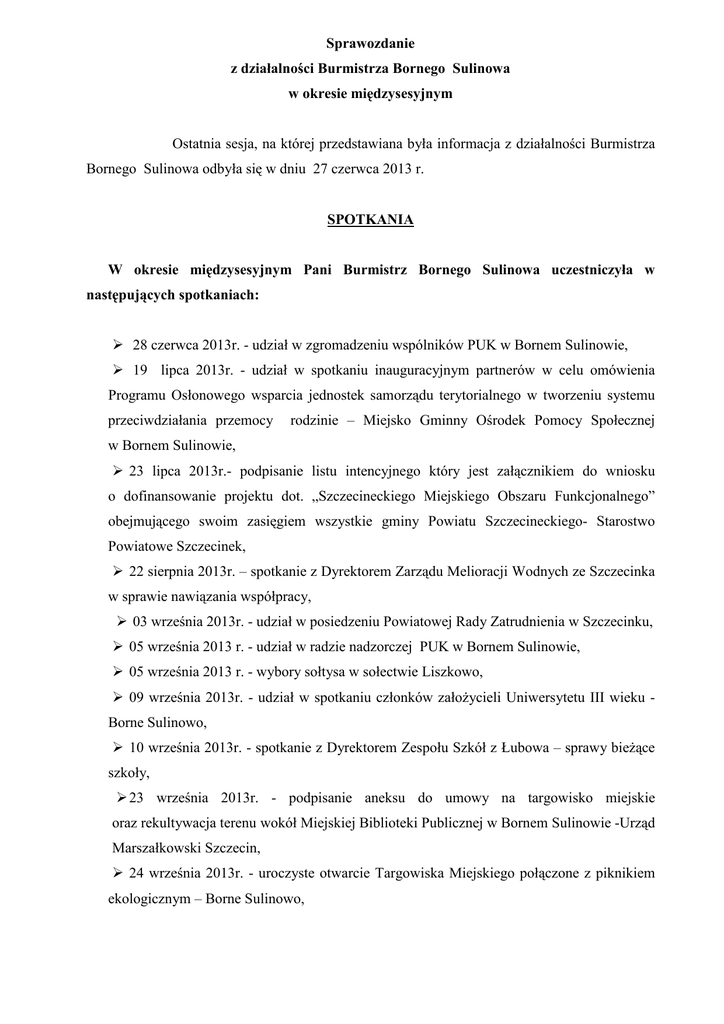 Sprawozdanie z działalności Burmistrza Bornego Sulinowa w okresie międzysesyjnym Ostatnia sesja, na której przedstawiana była informacja z działalności Burmistrza Bornego Sulinowa odbyła się w dniu 27 czerwca 2013 r. SPOTKANIA W okresie międzysesyjnym Pani Burmistrz Bornego Sulinowa uczestniczyła w następujących spotkaniach: 28 czerwca 2013r. - udział w zgromadzeniu wspólników PUK w Bornem Sulinowie, 19 lipca 2013r. - udział w spotkaniu inauguracyjnym partnerów w celu omówienia Programu Osłonowego wsparcia jednostek samorządu terytorialnego w tworzeniu systemu przeciwdziałania przemocy rodzinie – Miejsko Gminny Ośrodek Pomocy Społecznej w Bornem Sulinowie, 23 lipca 2013r.- podpisanie listu intencyjnego który jest załącznikiem do wniosku o dofinansowanie projektu dot. „Szczecineckiego Miejskiego Obszaru Funkcjonalnego” obejmującego swoim zasięgiem wszystkie gminy Powiatu Szczecineckiego- Starostwo Powiatowe Szczecinek, 22 sierpnia 2013r. – spotkanie z Dyrektorem Zarządu Melioracji Wodnych ze Szczecinka w sprawie nawiązania współpracy, 03 września 2013r. - udział w posiedzeniu Powiatowej Rady Zatrudnienia w Szczecinku, 05 września 2013 r. - udział w radzie nadzorczej PUK w Bornem Sulinowie, 05 września 2013 r. - wybory sołtysa w sołectwie Liszkowo, 09 września 2013r. - udział w spotkaniu członków załoŜycieli Uniwersytetu III wieku Borne Sulinowo, 10 września 2013r. - spotkanie z Dyrektorem Zespołu Szkół z Łubowa – sprawy bieŜące szkoły, 23 września 2013r. - podpisanie aneksu do umowy na targowisko miejskie oraz rekultywacja terenu wokół Miejskiej Biblioteki Publicznej w Bornem Sulinowie -Urząd Marszałkowski Szczecin, 24 września 2013r. - uroczyste otwarcie Targowiska Miejskiego połączone z piknikiem ekologicznym – Borne Sulinowo, WYWIADY 09 września 2013r. - Program Samorządowy – Telewizja Gawex, UROCZYSTOŚCI 26 lipca 2013r. - uroczyste obchody Święta Policji – Szczecinek, 28 lipca 2013r. - zawody wędkarskie o puchar Burmistrza Bornego Sulinowa, 01sierpnia 2013r. – uroczyste wręczenie odznaczenia nadanego przez Prezydenta RP KrzyŜem z Mieczami Orderu KrzyŜa Niepodległości dla Pana Marka Szwarc, 15 sierpnia 2013r. – X Międzynarodowy Zlot Pojazdów Militarnych „Gąsienice i Podkowy” Borne Sulinowo, 30 sierpnia 2013r. - DoŜynki Gminne – Jeleń, 05 września 2013r. – uroczyste biesiadowanie urodzin ulicy Konopnickiej 15 Borne Sulinowo, 15 września 2013r.- Piknik Wiejski połączony z Powiatowym Świętem Plonów - Świątki 16 września 2013r. - uroczyste otwarcie nowego laboratorium Badań Wody i Ścieków - PWiK Szczecinek, 20 września 2013r. - Grzybobranie na wrzosowej polanie – Leśnictwo Liszkowo, W sprawach skarg i wniosków - w okresie międzysesyjnym - Burmistrz Bornego Sulinowa oraz Zastępca Burmistrza przyjmowali 62 interesantów. 2 REFERAT GOSPODARKI NIERUCHOMOŚCIAMI 1. 2. 3. 4. 5. 6. 7. 8. 9. 10. 11. 12. 13. 14. Zawarto 1 aneks do umowy najmu lokalu mieszkalnego w sprawie spłaty lub części zadłuŜenia z tytułu nieuregulowania opłat czynszowych wykonując świadczenia rzeczowe na rzecz Gminy Borne Sulinowo. W dniach 29 i 30 lipca 2013r. przekazano 16 lokali mieszkalnych znajdujących się w budynku przy ul. Słowackiego 9 klatka B w Bornem Sulinowie. W tym 4 lokale o statusie komunalnym i 12 lokali o statusie socjalnym. Sporządzono 19 nowych umów. Sporządzono 18 protokołów z przekazania lokali mieszkalnych. Przekwalifikowano 1 lokal uŜytkowy na lokal mieszkalny w miejscowości Kiełpino. Przygotowano zestawienie w formie tabelarycznej lokali mieszkalnych do ubezpieczenia. ZłoŜono deklarację dotyczącą opłaty za gospodarowanie odpadami komunalnymi budynku połoŜonego przy ul. Słowackiego 9B w Bornem Sulinowie. Rozwiązano za porozumieniem stron 3 umowy najmu lokali mieszkalnych (Łubowo, ul. Zakątna 2 , Al. Niepodległości 46A/5) . Sporządzono protokoły z przejęcia 3 lokali komunalnych. Udzielono pisemnych odpowiedzi dla osób zainteresowanych wykonaniem we własnym zakresie nakładów finansowych w lokalach komunalnych. Udzielono pisemnych odpowiedzi dla osób proszących o wykonanie wymiany stolarki okiennej i drzwiowej i innych małych prac w lokalach komunalnych i socjalnych. Sporządzono protokół z przekazania ruchomości po zmarłej Zieniewicz Wandzie zamieszkałej w Czochryniu 3 na rzecz spadkobiercy. W dniu 04 września 2013r. odbyło się posiedzenie Komisji Mieszkaniowej, na których rozpatrywano wnioski o przydział lokali mieszkalnych. Przygotowano zawiadomienia dla wszystkich najemców na terenie miasta w sprawie obowiązku płacenia 9,00 zł za selektywne zbieranie odpadów komunalnych. REFERAT SPRAW OBYWATELSKICH 1. Działalność Komisji ds. PRPA. W okresie międzysesyjnym wszczęto 2 postępowania o zobowiązanie do leczenia odwykowego na wnioski złoŜone przez rodzinę osoby uzaleŜnionej oraz Miejsko – Gminny Ośrodek Pomocy Społecznej w Bornem Sulinowie. W związku z powyŜszym skierowano pisma do Komisariatu Policji oraz sporządzono umowy na przeprowadzenie wywiadów środowiskowych. Ponadto skierowano do biegłych – psychologa i psychiatry 8 teczek akt spraw celu przebadania i wydania opinii w przedmiocie uzaleŜnienia osób od alkoholu, przygotowano 1 umowę zleceń dla pracownika socjalnego na sporządzenie wywiadu środowiskowego, przygotowano umowę – zlecenie dla specjalisty psychoterapii na przeprowadzenie zajęć dla osób dotkniętych przemocą, ustalono przyjęcia na oddział detoksykacyjny dla 5 osób, terapię odwykową w systemie stacjonarnym ukończyły 2 osoby, zakupiono 2 bilety miesięczne z przeznaczeniem na dojazd na terapię w systemie dziennym, ustalono i dofinansowano badania okresowe oraz terapię podtrzymującą po odbytej terapii podstawowej dla 7 osób. W związku z prowadzonymi postępowaniami „ Niebieska Karta” uczestniczono w 5 posiedzeniach Zespołu Interdyscyplinarnego ds. Przeciwdziała