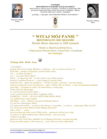 Conchiglia MOVIMENTO D'AMORE SAN JUAN DIEGO Ruch Światowy założony przez Conchiglię z woli Bożej 24 października 2001 poświęcony Najświętszej Maryi Pannie Naszej Pani z Guadalupe - Meksyk Niewieście obleczonej w Słońce z Apokalipsy po Polsku... « Muszelka - RUCH MIŁOŚCI ŚWIĘTY JUAN DIEGO » Prawdziwe Oblicze Jezusa Prawdziwe Oblicze Maryi “ WITAJ MÓJ PANIE ” BENTORNATO MIO SIGNORE Dzieło Boże obecnie w XIII tomach TRÓJCA PRZENAJŚWIĘTSZA i Najświętsza Maryja Panna, Nasza Pani z Guadalupe do Conchiglii 15 lutego 2010 - 08.40 - Jezus „Conchiglio… pragnę mówić do twojego Biskupa z czułością… ale i ze stanowczością. (1) Synu Mój… bardzo cię kocham i jestem blisko ciebie. A ty… czy Mnie kochasz? A ty… czy jesteś blisko Mnie? Wiem… że odpowiesz Mi… że tak i zdziwi cię to Moje pytanie. Kiedyś je zadałem Piotrowi… a dziś zadaję je również tobie ponieważ tam… gdzie się znajdujesz… również ty jesteś „piotrem” z pewną władzą i możesz związywać oraz rozwiązywać… jako w Niebie tak i na Ziemi… z racji otrzymanego mandatu. Synu Mój… związałeś tę córkę i Ja zostawiłem ci wolną rękę. Próba była dla obydwojga ty w sprawowaniu twojej władzy… a ona w posłuszeństwie do Mnie względem ciebie. PAMIĘTAJ… SYNU… ŻE ONA JEST POSŁUSZNA MNIE a ty nadużywasz swojej władzy. Jak długo… synu… będziesz się opierał Mojemu Słowu? Czy już nie rozpoznajesz Mnie? Czy naprawdę myślisz… że możesz decydować o wszystkim… co chcesz… odsuwając Mnie na bok? Czy Ja już nie jestem Właścicielem Mojego Kościoła? Jako „stróż” … synu… nie przywłaszczaj sobie rzeczy Właściciela… ponieważ rozliczę się z tobą. Uczynię to ze Sprawiedliwością i Młosierdziem… ale to uczynię. I będzie to prędko… ponieważ zbyt wiele Dusz oddaliło się od Mojego Kościoła z twojego powodu. Świat na ciebie patrzy i obserwuje cię… oraz czeka na ważną odpowiedź. 1 [email protected] www.movimentodamoresanjuandiego.it www.conchiglia.net Zostałeś oszukany przez wielu i nie sprawdziłeś sumiennie skąd pochodziły czarne głosy… podżegane przez Szatana. Synu Mój… ale według ciebie na kogo ma się rzucać Szatan… jeśli nie na Moje dzieci i braci? Jeśli to czyni… to dlatego… że ich nienawidzi. A nienawidzi ich… ponieważ kochają Mnie i służą Mi. Czy tak trudno jest ci to zrozumieć? To zawsze na dzieci Boże Szatan się rzuca i posyła swoich wysłanników… aby niszczyli Moje Dzieła. Od Początku Czasów to czyni. To wy… Biskupi… zgubiliście drogę i straciliście Wiarę do tego stopnia… że nie mianujecie już KAPŁANÓW EGZORCYSTÓW. Tak więc… drodzy Biskupi… bez Mojego Światła… faktycznie jesteście niezdolni do rozeznania a dowodzą tego fakty ponieważ jeśli stado się rozprasza… wy jesteście za to odpowiedzialni gdyż jesteście gnuśnymi strażnikami. Świat na was patrzy… powiedziałem to. ŚWIAT NA CIEBIE PATRZY… POWIEDZIAŁEM TO. Conchiglia ma światowe zadanie… a ty ją związałeś ciężkimi łańcuchami. Rozwiąż ją, synu… ponieważ zbyt wiele Dusz się traci. Otwórz serce… a potem otwórz umysł a później otwórz ramiona… aby przyjąć Moje dzieci. Dość już starych dzieł. „Nowe jest u drzwi”… i nie jesteś dostatecznie przygotowany… podobnie jak i wielu Biskupów. To są Słowa Miłosierdzia i Miłości ponieważ Moja interwencja przychodzi o świcie wielkich wydarzeń… które nadchodzą. WKRÓTCE NASTĄPI PRAWDZIWY UPADEK GLOBALNY. MOŻNI TEGO ŚWIATA ZWLEKALI TYLKO… ABY MÓC SIĘ ZORGANIZOWAĆ BY MÓC WAS PÓŹNIEJ ZATRZYMAĆ NA ICH SPOSÓB. SYNU… RÓWNIEŻ MÓJ KOŚCIÓŁ BĘDZIE CIERPIAŁ TEN SAM UPADEK I BĘDZIE ON DUŻO WIĘKSZY PONIEWAŻ WARTOŚĆ EKONOMICZNA I MATERIALNA… JEST DUŻO NIŻSZA OD WARTOŚCI DUCHOWEJ. Kościół jest pozbawiony Ducha Bożego z waszego powodu i Szatan rządzi w wielu kręgach. Kroczy blisko was i u waszego boku a wy się wyśmiewacie w przekonaniu… że on nie istnieje a przecież rezultat jest widoczny na całym świecie ponieważ Szatan stał się władcą Świata. I pomimo Proroków… posłanych jeden po drugim…wy nadal pozostajecie ślepi. Jaka jest wasza wina? Głosicie… że widzicie bardzo dobrze. Jaka jest twoja wina? Ta sama. Mówisz… że widzisz… a jednak nie widzisz . Conchiglio… pragnę… aby ten Mój List został przeczytany przez cały świat… ponieważ wielu jest Biskupów na Świecie. Czas ma się ku końcowi i nigdy nie mówiłem… że chodzi o koniec świata. 2 [email protected] www.movimentodamoresanjuandiego.it www.conchiglia.net Skończą się natomiast Złe Czasy i nic nie będzie już jak wcześniej ponieważ wszystko uczynię nowym poprzez ręce Moich pracowitych dzieci… które Mnie kochają a młodzi są źrenicami Moich oczu… to ci… którzy będą kroczyli ze Mną i będą radowali się ze Mną. Niech te Słowa dotrą TERAZ po krańce Ziemi… również do Moich synów Kapłanów. Wśród nich są umiłowani synowie… którzy wszystko zrozumieją i będą się ruszać w Ruchu Miłości nie do powstrzymania ponieważ na czele tego Ruchu Miłości jestem Ja… Jezus… który z Trójcy do was przemawiam jest Moja Matka Maryja i jest Mój Piotr (2) i Błogosławię tych… którzy idą za Mną… naśladują Mnie… i kochają Mnie w Imię Ojca Matki Syna i Ducha Świętego Amen.” (1) Biskup Conchiglii: J.Eks. Bp + Giuseppe Orlandoni Biskup Diecezji Chiaravalle - Senigallia (AN) (2) Papież Benedykt XVI Conchiglia della Santissima Trinità © Conchiglia - Bentornato mio Signore - La Rivelazione ... przeczytaj inne Objawienia Conchiglia - MOVIMENTO D'AMORE SAN JUAN DIEGO PAROLE D’ORO - BENTORNATO MIO SIGNORE Via Manzoni, 12 - Casella Postale 99 - 33085 Maniago PN Italia CC Postale n. 85539583 tel. (0039) 347 35 50 352 fax (0039) 0444.80.99.54 E-mail: [email protected] www.conchiglia.net www.movimentodamoresa