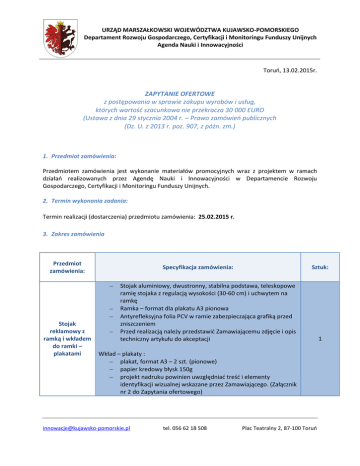 URZĄD MARSZAŁKOWSKI WOJEWÓDZTWA KUJAWSKO-POMORSKIEGO Departament Rozwoju Gospodarczego, Certyfikacji i Monitoringu Funduszy Unijnych Agenda Nauki i Innowacyjności Toruń, 13.02.2015r. ZAPYTANIE OFERTOWE z postępowania w sprawie zakupu wyrobów i usług, których wartość szacunkowa nie przekracza 30 000 EURO (Ustawa z dnia 29 stycznia 2004 r. – Prawo zamówień publicznych (Dz. U. z 2013 r. poz. 907, z późn. zm.) 1. Przedmiot zamówienia: Przedmiotem zamówienia jest wykonanie materiałów promocyjnych wraz z projektem w ramach działań realizowanych przez Agendę Nauki i Innowacyjności w Departamencie Rozwoju Gospodarczego, Certyfikacji i Monitoringu Funduszy Unijnych. 2. Termin wykonania zadania: Termin realizacji (dostarczenia) przedmiotu zamówienia: 25.02.2015 r. 3. Zakres zamówienia Przedmiot zamówienia: Stojak reklamowy z ramką i wkładem do ramki – plakatami Specyfikacja zamówienia: Sztuk: Stojak aluminiowy, dwustronny, stabilna podstawa, teleskopowe ramię stojaka z regulacją wysokości (30-60 cm) i uchwytem na ramkę Ramka – format dla plakatu A3 pionowa Antyrefleksyjna folia PCV w ramie zabezpieczająca grafiką przed zniszczeniem Przed realizacją należy przedstawić Zamawiającemu zdjęcie i opis techniczny artykułu do akceptacji Wkład – plakaty : plakat, format A3 – 2 szt. (pionowe) papier kredowy błysk 150g projekt nadruku powinien uwzględniać treść i elementy identyfikacji wizualnej wskazane przez Zamawiającego. (Załącznik nr 2 do Zapytania ofertowego) [email protected] tel. 056 62 18 508 Plac Teatralny 2, 87-100 Toruń 1 URZĄD MARSZAŁKOWSKI WOJEWÓDZTWA KUJAWSKO-POMORSKIEGO Departament Rozwoju Gospodarczego, Certyfikacji i Monitoringu Funduszy Unijnych Agenda Nauki i Innowacyjności Potykacz dwustronny wraz z wkładem – plakatami Teczki Długopisy Notesy A5 Torby materiałowe Materiał konstrukcyjny: aluminium anodowane Format dla plakatu: A1 ( 594x841 mm) Pionowa ramka zatrzaskowa typu OWZ Antyrefleksyjna folia PCV w ramie zabezpieczająca grafiką przed zniszczeniem Przed realizacją należy przedstawić Zamawiającemu zdjęcie i opis techniczny artykułu do akceptacji. Wkład – plakaty: plakat , format A1 – 2 szt. papier kredowy błysk 150g projekt nadruku powinien uwzględniać treść i elementy identyfikacji wizualnej wskazane przez Zamawiającego. (Załącznik nr 2 do Zapytania ofertowego) Wymiary po złożeniu ok. 220x310 mm Materiał – karton 350 g. Druk – 4+0 Folia błyszcząca Zamknięcie na gumkę – 1 gumka w kolorze czarnym przeciągnięta prostopadle do krótszej krawędzi teczki Grzbiet – ok. 5mm Bigowanie w miejscach zagięcia Zaokrąglone narożniki skrzydełek teczki Projekt uwzględniający treść i elementy identyfikacji wizualnej wskazane przez Zamawiającego (Załącznik nr 2 do Zapytania ofertowego). Projekt korespondujący z projektem notesów i toreb. Z grawerem Projekt graficzny długopisów – uwzględniający treść i elementy identyfikacji wizualnej wskazane przez Zamawiającego (Załącznik nr 2 do Zapytania ofertowego) Kolor wkładu niebieski Kolor długopisu – czarny Klejony po krótszym boku Karton na spodzie Kratka 25 kartek w notesie Bez okładki Projekt uwzględniający zamieszczenie w stopce treści wskazanej przez Zamawiającego (Załącznik nr 2 do Zapytania ofertowego) Kolor – wg propozycji projektu Z uszami, z możliwością zawieszenia na ramię Rozmiar – mieszący A4 Projekt graficzny uwzględniający treść i elementy identyfikacji [email protected] tel. 056 62 18 508 1 500 500 500 500 Plac Teatralny 2, 87-100 Toruń URZĄD MARSZAŁKOWSKI WOJEWÓDZTWA KUJAWSKO-POMORSKIEGO Departament Rozwoju Gospodarczego, Certyfikacji i Monitoringu Funduszy Unijnych Agenda Nauki i Innowacyjności Słodycze wizualnej wskazane przez Zamawiającego. Projekt korespondujący z projektem teczek/ notesów (Załącznik nr 2 do Zapytania ofertowego) Termin przydatności do spożycia – minimum 6 miesięcy Cukierki typu „krówka” bądź podobne Projekt graficzny uwzględniający treść i elementy identyfikacji wizualnej wskazane przez Zamawiającego (Załącznik nr 2 do Zapytania ofertowego) 1500 W wyniku realizacji zamówienia Wykonawca dostarczy do siedziby Zamawiającego, tj. Plac Teatralny 2, 87-100 Toruń, Departament Rozwoju Gospodarczego, Certyfikacji i Monitoringu Funduszy Unijnych, Agenda Nauki i Innowacyjności (pok. 358), materiały zgodne z przedmiotem zamówienia. Wykonawca zobowiązuje się do nanoszenia i uwzględniania wskazówek zamawiającego w trakcie realizacji usługi na podstawie korespondencji bieżącej (kontakt mailowy/telefoniczny) z Zamawiającym bez zbędnej zwłoki. Zamawiający dopuszcza częściowe dostawy przedmiotów zamówienia z zastrzeżeniem zachowania terminu realizacji zamówienia. Odbioru zamówienia dokona Komisja odbioru. Wynikiem pracy Komisji będzie podpisany protokół zdawczo-odbiorczy. Protokół zdawczo-odbiorczy zostanie podpisany po całościowej weryfikacji ilościowej i jakościowej przedmiotu zamówienia bez względu na liczbę dostaw. 4. Kryteria oceny ofert: A. Cena – max 50 pkt. Punkty za kryterium cena zostaną obliczone wg następującego wzoru: Wynik końcowy powyższego działania zostanie zaokrąglony do 2. miejsca po przecinku. B. Projekt graficzny – max 50 pkt. Punkty za poszczególne kryteria zostaną zsumowane i będą stanowić końcową ocenę oferty. Maksymalnie Wykonawca może zdobyć 100 pkt. Za najkorzystniejszą zostanie uznana oferta, która uzyska najwyższą końcową ocenę oferty. 5. Oferta na przedmiot zapytania powinna zawierać poniższe dokumenty: 1. Ofertę cenową wyrażoną w złotych brutto, opracowaną zgodnie z zał. nr 1 do zapytania ofertowego, sygnowaną przez osobę upoważnioną do reprezentowania Wykonawcy zgodnie [email protected] tel. 056 62 18 508 Plac Teatralny 2, 87-100 Toruń URZĄD MARSZAŁKOWSKI WOJEWÓDZTWA KUJAWSKO-POMORSKIEGO Departament Rozwoju Gospodarczego, Certyfikacji i Moni