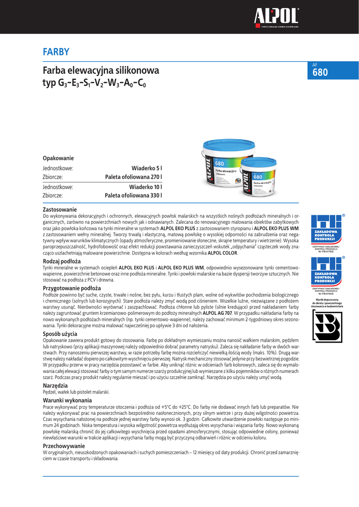 FARBY AF Farba elewacyjna silikonowa typ G3-E3-S1-V2-W3-A0-C0 680 Opakowanie Jednostkowe: Zbiorcze: Wiaderko 5 l Paleta ofoliowana 270 l Jednostkowe: Zbiorcze: Wiaderko 10 l Paleta ofoliowana 330 l Zastosowanie Do wykonywania dekoracyjnych i ochronnych, elewacyjnych powłok malarskich na wszystkich nośnych podłożach mineralnych i organicznych, zarówno na powierzchniach nowych jak i odnawianych. Zalecana do renowacyjnego malowania obiektów zabytkowych oraz jako powłoka końcowa na tynki mineralne w systemach ALPOL EKO PLUS z zastosowaniem styropianu i ALPOL EKO PLUS WM z zastosowaniem wełny mineralnej. Tworzy trwałą i elastyczną, matową powłokę o wysokiej odporności na zabrudzenia oraz negatywny wpływ warunków klimatycznych (opady atmosferyczne, promieniowanie słoneczne, skrajne temperatury i wietrzenie). Wysoka paroprzepuszczalność, hydrofobowość oraz efekt redukcji powstawania zanieczyszczeń wskutek „odpychania” cząsteczek wody znacząco uszlachetniają malowane powierzchnie. Dostępna w kolorach według wzornika ALPOL COLOR. CERTYFIKAT ZAKŁADOWEJ KONTROLI PRODUKCJI Nr ITB-0178/Z Rodzaj podłoża Tynki mineralne w systemach ociepleń ALPOL EKO PLUS i ALPOL EKO PLUS WM, odpowiednio wysezonowane tynki cementowowapienne, powierzchnie betonowe oraz inne podłoża mineralne. Tynki i powłoki malarskie na bazie dyspersji tworzyw sztucznych. Nie stosować na podłoża z PCV i drewna. Przygotowanie podłoża Podłoże powinno być suche, czyste, trwałe i nośne, bez pyłu, kurzu i tłustych plam, wolne od wykwitów pochodzenia biologicznego i chemicznego (solnych lub korozyjnych). Stare podłoża należy zmyć wodą pod ciśnieniem. Wszelkie luźne, niezwiązane z podłożem warstwy usunąć. Nierówności wyrównać i zaszpachlować. Podłoża chłonne lub pyliste (silnie kredujące) przed nakładaniem farby należy zagruntować gruntem krzemianowo-polimerowym do podłoży mineralnych ALPOL AG 707. W przypadku nakładania farby na nowo wykonanych podłożach mineralnych (np. tynki cementowo-wapienne), należy zachować minimum 2-tygodniowy okres sezonowania. Tynki dekoracyjne można malować najwcześniej po upływie 3 dni od nałożenia. Sposób użycia Opakowanie zawiera produkt gotowy do stosowania. Farbę po dokładnym wymieszaniu można nanosić wałkiem malarskim, pędzlem lub natryskowo (przy aplikacji maszynowej należy odpowiednio dobrać parametry natrysku). Zaleca się nakładanie farby w dwóch warstwach. Przy nanoszeniu pierwszej warstwy, w razie potrzeby farbę można rozcieńczyć niewielką ilością wody (maks. 10%). Drugą warstwę należy nakładać dopiero po całkowitym wyschnięciu pierwszej. Natrysk mechaniczny stosować jedynie przy bezwietrznej pogodzie. W przypadku przerw w pracy narzędzia pozostawić w farbie. Aby uniknąć różnic w odcieniach farb kolorowych, zaleca się do wymalowania całej elewacji stosować farby o tym samym numerze szarży produkcyjnej lub wymieszane z kilku pojemników o różnych numerach szarż. Podczas pracy produkt należy regularnie mieszać i po użyciu szczelnie zamknąć. Narzędzia po użyciu należy umyć wodą. Narzędzia Pędzel, wałek lub pistolet malarski. Warunki wykonania Prace wykonywać przy temperaturze otoczenia i podłoża od +5°C do +25°C. Do farby nie dodawać innych farb lub preparatów. Nie należy wykonywać prac na powierzchniach bezpośrednio nasłonecznionych, przy silnym wietrze i przy dużej wilgotności powietrza. Czas wysychania nałożonej na podłoże jednej warstwy farby wynosi ok. 3 godzin. Całkowite utwardzenie powłoki następuje po minimum 24 godzinach. Niska temperatura i wysoka wilgotność powietrza wydłużają okres wysychania i wiązania farby. Nowo wykonaną powłokę malarską chronić do jej całkowitego wyschnięcia przed opadami atmosferycznymi, stosując odpowiednie osłony, ponieważ niewłaściwe warunki w trakcie aplikacji i wysychania farby mogą być przyczyną odbarwień i różnic w odcieniu koloru. Przechowywanie W oryginalnych, nieuszkodzonych opakowaniach i suchych pomieszczeniach – 12 miesięcy od daty produkcji. Chronić przed zamarznięciem w czasie transportu i składowania. 52 CERTYFIKAT ZAKŁADOWEJ KONTROLI PRODUKCJI Nr ITB-0193/Z Wyrób dopuszczony do obrotu i powszechnego stosowania w budownictwie FARBY AF 680 Uwagi Dane techniczne i informacje o sposobie stosowania podane są dla temperatury (23±2)°C i wilgotności względnej (50±5)%. W innych warunkach czas schnięcia może ulec zmianie. Stosować okulary ochronne. W razie zabrudzenia oczu farbą należy natychmiast przemyć je dużą ilością wody i skontaktować się z lekarzem. Chronić należy również skórę używając ubrań i rękawic ochronnych. Chronić przed dziećmi. Świeże zabrudzenia czyścić wodą. Producent nie odpowiada za szkody wynikłe z nieumiejętnego lub niezgodnego z przeznaczeniem użycia wyrobu. Zalecenia ogólne Prace prowadzić zgodnie z zasadami sztuki budowlanej, normami i przepisami BHP, jak również zaleceniami instrukcji systemu ociepleń ALPOL EKO PLUS lub ALPOL EKO PLUS WM oraz instrukcją ITB 447/2009 Dane techniczne Skład: wodna dyspersja żywicy silikonowej, pigmenty nieorganiczne, dodatki Gęstość objętościowa ok. 1,5 kg/dm3 Czas wstępnego schnięcia jednej warstwy (pyłosuchość) ok. 3 godz. Czas nanoszenia drugiej warstwy ok. 24 godz. Całkowite utwardzenie powłoki ok. 24 godz. Połysk G3 (mat) Grubość powłoki E3 (100-200 µm) Wielkość ziarna S1 (drobne) Współczynnik przenikania pary wodnej V2 (średni) Przepuszczalność wody W3 (≤ 0,1 kg/(m2×h0,5)) Pokrywanie rys A0 (bez wymagań) Przepuszczalność ditlenku węgla C0 (bez wymagań) Zużycie przy dwukrotnym malowaniu tynku o średnio chropowatej fakturze ok. 0,33 l/m2 Odczyn pH ok. 9 Zawartość lotnych związków organicznych (VOC) ≤ 40 g/l Barwa: kolory z wzornika ALPOL COLOR Gwarancja: 5 lat na system ALPOL EKO PLUS i ALPOL EKO PLUS WM. Wyrób jest składnikiem 