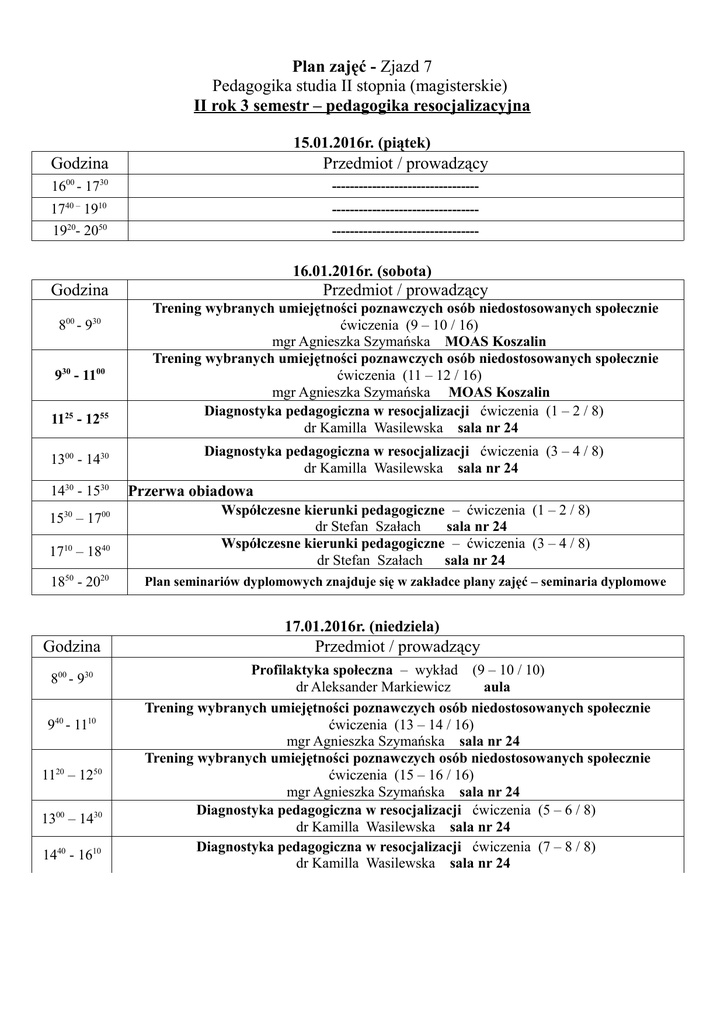 Plan zajęć - Zjazd 7 Pedagogika studia II stopnia (magisterskie) II rok 3 semestr – pedagogika resocjalizacyjna 15.01.2016r. (piątek) Godzina Przedmiot / prowadzący 1600 - 1730 --------------------------------- 40 – 10 17 19 1920- 2050 ----------------------------------------------------------------- 16.01.2016r. (sobota) Godzina 800 - 930 930 - 1100 1125 - 1255 1300 - 1430 1430 - 1530 1530 – 1700 1710 – 1840 1850 - 2020 Przedmiot / prowadzący Trening wybranych umiejętności poznawczych osób niedostosowanych społecznie ćwiczenia (9 – 10 / 16) mgr Agnieszka Szymańska MOAS Koszalin Trening wybranych umiejętności poznawczych osób niedostosowanych społecznie ćwiczenia (11 – 12 / 16) mgr Agnieszka Szymańska MOAS Koszalin Diagnostyka pedagogiczna w resocjalizacji ćwiczenia (1 – 2 / 8) dr Kamilla Wasilewska sala nr 24 Diagnostyka pedagogiczna w resocjalizacji ćwiczenia (3 – 4 / 8) dr Kamilla Wasilewska sala nr 24 Przerwa obiadowa Współczesne kierunki pedagogiczne – ćwiczenia (1 – 2 / 8) dr Stefan Szałach sala nr 24 Współczesne kierunki pedagogiczne – ćwiczenia (3 – 4 / 8) dr Stefan Szałach sala nr 24 Plan seminariów dyplomowych znajduje się w zakładce plany zajęć – seminaria dyplomowe 17.01.2016r. (niedziela) Godzina 800 - 930 940 - 1110 1120 – 1250 1300 – 1430 1440 - 1610 Przedmiot / prowadzący Profilaktyka społeczna – wykład (9 – 10 / 10) dr Aleksander Markiewicz aula Trening wybranych umiejętności poznawczych osób niedostosowanych społecznie ćwiczenia (13 – 14 / 16) mgr Agnieszka Szymańska sala nr 24 Trening wybranych umiejętności poznawczych osób niedostosowanych społecznie ćwiczenia (15 – 16 / 16) mgr Agnieszka Szymańska sala nr 24 Diagnostyka pedagogiczna w resocjalizacji ćwiczenia (5 – 6 / 8) dr Kamilla Wasilewska sala nr 24 Diagnostyka pedagogiczna w resocjalizacji ćwiczenia (7 – 8 / 8) dr Kamilla Wasilewska sala nr 24