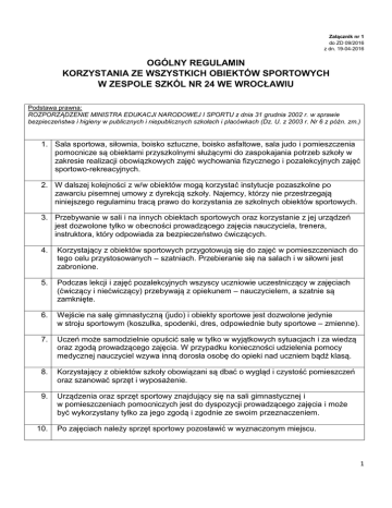 Załącznik nr 1 do ZD 09/2016 z dn. 19-04-2016 OGÓLNY REGULAMIN KORZYSTANIA ZE WSZYSTKICH OBIEKTÓW SPORTOWYCH W ZESPOLE SZKÓL NR 24 WE WROCŁAWIU Podstawa prawna: ROZPORZĄDZENIE MINISTRA EDUKACJI NARODOWEJ I SPORTU z dnia 31 grudnia 2002 r. w sprawie bezpieczeństwa i higieny w publicznych i niepublicznych szkołach i placówkach (Dz. U. z 2003 r. Nr 6 z późn. zm.) 1. Sala sportowa, siłownia, boisko sztuczne, boisko asfaltowe, sala judo i pomieszczenia pomocnicze są obiektami przyszkolnymi służącymi do zaspokajania potrzeb szkoły w zakresie realizacji obowiązkowych zajęć wychowania fizycznego i pozalekcyjnych zajęć sportowo-rekreacyjnych. 2. W dalszej kolejności z w/w obiektów mogą korzystać instytucje pozaszkolne po zawarciu pisemnej umowy z dyrekcją szkoły. Najemcy, którzy nie przestrzegają niniejszego regulaminu tracą prawo do korzystania ze szkolnych obiektów sportowych. 3. Przebywanie w sali i na innych obiektach sportowych oraz korzystanie z jej urządzeń jest dozwolone tylko w obecności prowadzącego zajęcia nauczyciela, trenera, instruktora, który odpowiada za bezpieczeństwo ćwiczących. 4. Korzystający z obiektów sportowych przygotowują się do zajęć w pomieszczeniach do tego celu przystosowanych – szatniach. Przebieranie się na salach i w siłowni jest zabronione. 5. Podczas lekcji i zajęć pozalekcyjnych wszyscy uczniowie uczestniczący w zajęciach (ćwiczący i niećwiczący) przebywają z opiekunem – nauczycielem, a szatnie są zamknięte. 6. Wejście na salę gimnastyczną (judo) i obiekty sportowe jest dozwolone jedynie w stroju sportowym (koszulka, spodenki, dres, odpowiednie buty sportowe – zmienne). 7. Uczeń może samodzielnie opuścić salę w tylko w wyjątkowych sytuacjach i za wiedzą oraz zgodą prowadzącego zajęcia. W przypadku konieczności udzielenia pomocy medycznej nauczyciel wzywa inną dorosła osobę do opieki nad uczniem bądź klasą. 8. Korzystający z obiektów szkoły obowiązani są dbać o wygląd i czystość pomieszczeń oraz szanować sprzęt i wyposażenie. 9. Urządzenia oraz sprzęt sportowy znajdujący się na sali gimnastycznej i w pomieszczeniach pomocniczych jest do dyspozycji prowadzącego zajęcia i może być wykorzystany tylko za jego zgodą i zgodnie ze swoim przeznaczeniem. 10. Po zajęciach należy sprzęt sportowy pozostawić w wyznaczonym miejscu. 1 11. W wypadku uszkodzenia lub zniszczenia urządzeń, sprzętu sportowego, należy niezwłocznie powiadomić o tym nauczyciela prowadzącego zajęcia, nauczyciel informuje kierownika gospodarczego i dyrekcję szkoły. 12. Za uszkodzenia na obiektach sportowych (szatnie, siłownia, sala, boisko szkolne) odpowiadają ich sprawcy. Dyrektor szkoły w przypadku celowego uszkodzenia może wezwać rodziców ucznia do naprawienia bądź pokrycia kosztów naprawy. 13. Zauważone uszkodzenia w sali gimnastycznej, szatniach, prysznicach oraz na boisku szkolnym winne być zgłoszone nauczycielowi przed rozpoczęciem zajęć lub natychmiast po zaistniałym zdarzeniu. 14. Na obiektach sportowych mogą przebywać uczniowie biorący wg planu udział w zajęciach wychowania fizycznego, zajęciach pozalekcyjnych i innych według potrzeb, ale tylko pod opieką nauczyciela. 15. W czasie odbywania się imprez szkolnych wstęp na salę gimnastyczną dla wszystkich uczestników dozwolony jest wyłącznie w obuwiu zmiennym i pod opieką nauczyciela. 16. Ze względu na walory zdrowotne z sali gimnastycznej należy korzystać tylko w niesprzyjających warunkach atmosferycznych uniemożliwiających prowadzenie zajęć na świeżym powietrzu. 17. Prowadzący zajęcia może opuścić obiekty sportowe po wyjściu z nich ostatniego ucznia lub zawodnika swojej grupy. Sporządził/a: Zatwierdził/a merytorycznie: Zatwierdził/a: 2