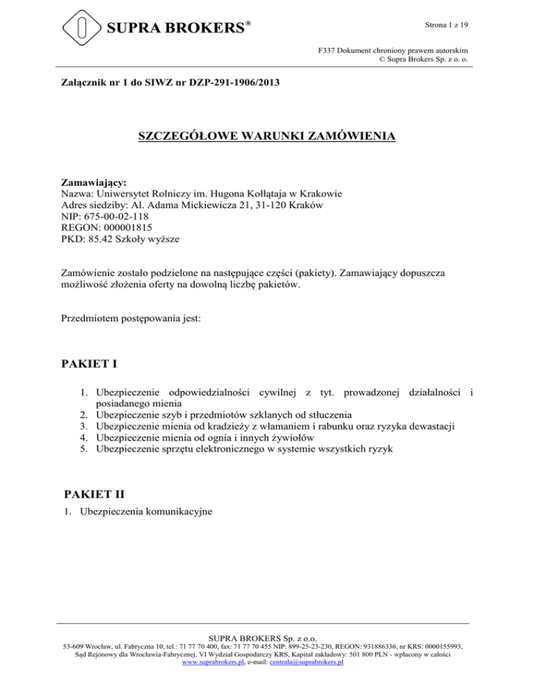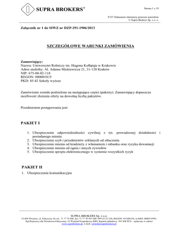 Strona 1 z 19 F337 Dokument chroniony prawem autorskim © Supra Brokers Sp. z o. o. Załącznik nr 1 do SIWZ nr DZP-291-1906/2013 SZCZEGÓŁOWE WARUNKI ZAMÓWIENIA Zamawiający: Nazwa: Uniwersytet Rolniczy im. Hugona Kołłątaja w Krakowie Adres siedziby: Al. Adama Mickiewicza 21, 31-120 Kraków NIP: 675-00-02-118 REGON: 000001815 PKD: 85.42 Szkoły wyższe Zamówienie zostało podzielone na następujące części (pakiety). Zamawiający dopuszcza możliwość złożenia oferty na dowolną liczbę pakietów. Przedmiotem postępowania jest: PAKIET I 1. Ubezpieczenie odpowiedzialności cywilnej z tyt. prowadzonej działalności i posiadanego mienia 2. Ubezpieczenie szyb i przedmiotów szklanych od stłuczenia 3. Ubezpieczenie mienia od kradzieży z włamaniem i rabunku oraz ryzyka dewastacji 4. Ubezpieczenie mienia od ognia i innych żywiołów 5. Ubezpieczenie sprzętu elektronicznego w systemie wszystkich ryzyk PAKIET II 1. Ubezpieczenia komunikacyjne SUPRA BROKERS Sp. z o.o. 53-609 Wrocław, ul. Fabryczna 10, tel.: 71 77 70 400, fax: 71 77 70 455 NIP: 899-25-23-230, REGON: 931886336, nr KRS: 0000155993, Sąd Rejonowy dla Wrocławia-Fabrycznej, VI Wydział Gospodarczy KRS, Kapitał zakładowy: 501 800 PLN - wpłacony w całości www.suprabrokers.pl, e-mail: [email protected] Strona 2 z 19 F337 Dokument chroniony prawem autorskim © Supra Brokers Sp. z o. o. PAKIET I 1. UBEZPIECZENIE ODPOWIEDZIALNOŚCI Z TYT. PROWADZONEJ DZIAŁALNOŚCI I POSIADANEGO MIENIA Wnioskowany zakres: 1. Ubezpieczenie odpowiedzialności cywilnej w związku z prowadzoną działalnością oraz posiadaniem i administrowaniem mienia (deliktowe) Ubezpieczenie odpowiedzialności cywilnej za szkody osobowe i rzeczowe wyrządzone osobom trzecim, do których naprawienia ubezpieczony jest zobowiązany zgodnie z przepisami prawa. W tym szkody powstałe w następstwie działania urządzeń wodociągowo kanalizacyjnych, centralnego ogrzewania, gazu lub urządzeń związanych z dostarczaniem energii elektrycznej (z limitem 200 000 zł). Odpowiedzialnością Zakładu Ubezpieczeń objęte są wypadki ubezpieczeniowe które zaszły w okresie ubezpieczenia, choćby roszczenia z ich tytułu zostały zgłoszone po tym okresie, jednakże przed upływem kodeksowego terminu przedawnienia. Przez wypadek ubezpieczeniowy rozumie się śmierć, uszkodzenie ciała, doznanie rozstroju zdrowia, utratę, zniszczenie, uszkodzenie rzeczy lub czystą stratę finansową. W ramach ubezpieczenia pokryte będą także koszty: 1. postępowania sądowego lub pojednawczego prowadzonego za zgodą Ubezpieczyciela, w związku z roszczeniami zgłoszonymi przez poszkodowanego, w tym także koszty wynagrodzenia adwokatów lub radców prawnych z tytułu uczestnictwa w procesie cywilnym, 2. uzasadnione koszty powołania za zgodą Ubezpieczyciela rzeczoznawców, 3. uzasadnione koszty działań mających na celu zapobieżeniu zwiększenia się szkody. SUMA GWARANCYJNA Suma gwarancyjna Wszystkie zdarzenia Limit na jedno zdarzenie Wysokość w zł 500 000 zł 500 000 zł Rozszerzenia ubezpieczenia odpowiedzialności cywilnej o szkody: 1. Rozszerzenie zakresu o szkody powstałe w wyniku niewykonania lub nienależytego wykonania zobowiązania - odpowiedzialność kontraktowa. Limit: 200 000 zł na jedno i wszystkie zdarzenia w okresie ubezpieczenia 2. Rozszerzenie zakresu o szkody wyrządzone pracownikom ubezpieczonego, powstałe w następstwie wypadku przy pracy. Franszyza redukcyjna w kwocie wypłaconych świadczeń ZUS. Limit: 300 000 zł na jedno i wszystkie zdarzenia w okresie ubezpieczenia SUPRA BROKERS Sp. z o.o. 53-609 Wrocław, ul. Fabryczna 10, tel.: 71 77 70 400, fax: 71 77 70 455 NIP: 899-25-23-230, REGON: 931886336, nr KRS: 0000155993, Sąd Rejonowy dla Wrocławia-Fabrycznej, VI Wydział Gospodarczy KRS, Kapitał zakładowy: 501 800 PLN - wpłacony w całości www.suprabrokers.pl, e-mail: [email protected] Strona 3 z 19 F337 Dokument chroniony prawem autorskim © Supra Brokers Sp. z o. o. 3. Rozszerzenie zakresu o szkody wyrządzone w środowisku przez jego zanieczyszczenie. Limit: 250 000 zł na jedno i wszystkie zdarzenia w okresie ubezpieczenia 4. Rozszerzenie zakresu o szkody powstałe w nieruchomościach, z których ubezpieczony korzystał na podstawie umowy najmu, dzierżawy, użytkowania, leasingu lub innej podobnej formy korzystania z cudzej rzeczy. Limit: 500 000 zł na jedno i wszystkie zdarzenia w okresie ubezpieczenia 5. Rozszerzenie zakresu o szkody powstałe w rzeczach ruchomych, z których ubezpieczony korzystał na podstawie umowy najmu, dzierżawy, użytkowania, leasingu lub innej podobnej formy korzystania z cudzej rzeczy. Limit: 300 000 zł na jedno i wszystkie zdarzenia w okresie ubezpieczenia 6. Rozszerzenie zakresu o szkody wyrządzone przez pojazdy nie podlegające obowiązkowemu ubezpieczeniu odpowiedzialności cywilnej posiadaczy pojazdów mechanicznych. Limit: 50 000 zł na jedno i wszystkie zdarzenia w okresie ubezpieczenia Wszystkie podlimity sumy gwarancyjnej zostały określone na wszystkie i na jedno zdarzenie. Udział własny: brak Franszyza integralna: brak Franszyza redukcyjna: 500 zł Zamawiający wnioskuje o zastosowanie w ofercie ubezpieczenia następujących klauzul dodatkowych, które będą brane pod uwagę w ocenie kryterium warunki ubezpieczenia. 1. Klauzula stempla bankowego 2. Klauzula jurysdykcji 2. 1. UBEZPIECZENIE SZYB I PRZEDMIOTÓW SZKLANYCH OD STŁUCZENIA Zakres ubezpieczenia: Ubezpieczeniem objęte są szkody powstałe wskutek stłuczenia (rozbicia) ubezpieczonych przedmiotów. 2. System: na pierwsze ryzyko Przedmiot ubezpieczenia Suma ubezpieczenia Szyby okienne i drzwiowe Oszklenie ścienne i dachowe Płyty szklane stanowiące składowe części mebli, gablot reklamowych, kontuarów, stołów i lad sprzedażnych Przegrody ścienne oraz osłony kantorów, boksów i kabin 50 000 zł SUPRA BROKERS Sp. z o.o. 53-609 Wrocław, ul. Fabryczna 10, tel.: 71 77 70 400, fax: 71 77 70 455 NIP: 899-25-23-230, REGON