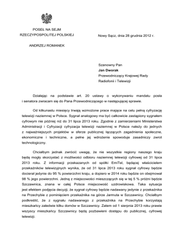 POSEŁ NA SEJM RZECZYPOSPOLITEJ POLSKIEJ Nowy Sącz, dnia 28 grudnia 2012 r. ANDRZEJ ROMANEK Szanowny Pan Jan Dworak Przewodniczący Krajowej Rady Radiofonii i Telewizji Działając na podstawie art. 20 ustawy o wykonywaniu mandatu posła i senatora zwracam się do Pana Przewodniczącego w następującej sprawie. Od kilkunastu miesięcy trwają wzmożone prace mające na celu pełną cyfryzację telewizji naziemnej w Polsce. Sygnał analogowy ma być całkowicie zastąpiony sygnałem cyfrowym nie później niż do 31 lipca 2013 roku. Zgodnie z zamierzeniami Ministerstwa Administracji i Cyfryzacji cyfryzacja telewizji naziemnej w Polsce należy do jednych z najważniejszych projektów w sferze publicznej łączących zagadnienia społeczne, ekonomiczne i techniczne, a pełne jej wdrożenie spowoduje zasadniczy zwrot technologiczny. Chciałbym jednak zwrócić uwagę, że nie wszystkie regiony naszego kraju będą mogły skorzystać z możliwości odbioru naziemnej telewizji cyfrowej od 31 lipca 2013 roku. Z informacji przekazanych od spółki EmiTel, będącej właścicielem przekaźników telewizyjnych wynika, że od 31 lipca 2013 roku sygnał cyfrowy będzie docierał jedynie do 95 % powierzchni kraju, a dopiero w 2014 roku będzie on obejmował 98 % jego powierzchni. Jedną z miejscowości mieszczących się w tej 5 % próżni będzie Szczawnica, znana w całej Polsce miejscowość uzdrowiskowa. Taka sytuacja jest efektem podjęcia decyzji, że sygnał cyfrowy będzie nadawany jedynie z przekaźnika na Przechybie z pominięciem przekaźnika na górze Jarmuta w Szczawnicy. Chciałbym podkreślić, że z sygnału nadawanego z przekaźnika na Przechybie korzystają mieszkańcy zaledwie kilku domów w Szczawnicy. Zatem od 1 sierpnia 2013 roku prawie wszyscy mieszkańcy Szczawnicy będą pozbawieni dostępu do publicznej, cyfrowej telewizji. Szczawnica jest znaną miejscowością uzdrowiskową, przyciągająca corocznie setki tysięcy turystów i w której olbrzymia część mieszkańców prowadzi działalność agroturystyczną. Decyzja o braku przystosowania przekaźnika na górze Jarmuta do odbioru telewizji cyfrowej spowoduje obniżenie standardu oferowanych usług noclegowych, a co za tym idzie konieczność obniżenia cen. Aby temu zapobiec mieszkańcy musieliby zainwestować w telewizję satelitarną, co przy kilku odbiornikach w domach (służących głównie gościom) będzie generowało znaczące koszty. Rada Miasta Szczawnica w dniu 30 listopada 2012 roku podjęła rezolucję sprzeciwiającą się niedostosowaniu przekaźnika na górze Jarmuta do emisji cyfrowej (doręczoną również mieszkańców Panu zaistniała Przewodniczącemu). sytuacja jest W przejawem ocenie Rady ignorancji, Miasta oraz lekceważenia i dyskryminacji oraz naruszenia podstawowej, konstytucyjnej zasady równości. Zatem mając na uwadze powyższe zwracam się do Pana Przewodniczącego o podjęcie stosownych zmierzających do objęcia przekaźnika na górze Jarmuta w Szczawnicy sygnałem cyfrowym oraz o poinformowanie mnie o ich wynikach. Z poważaniem, Andrzej Romanek Poseł na Sejm RP W załączeniu przedkładam z dnia 30 listopada 2012 roku. kserokopię rezolucji Rady Miasta Szczawnica