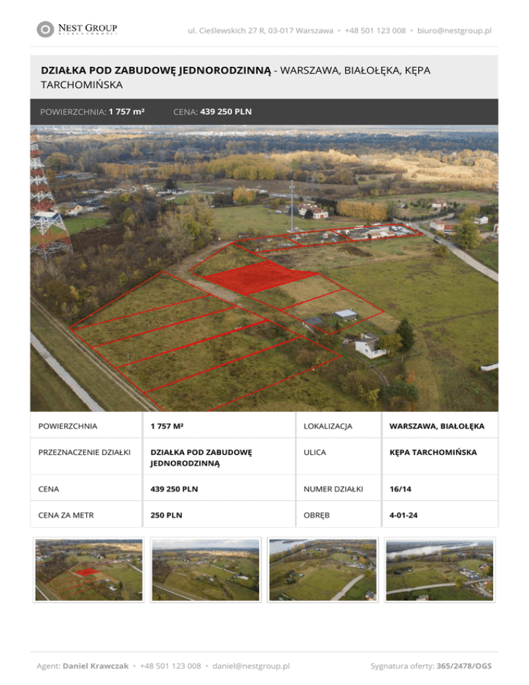ul. Cieślewskich 27 R, 03-017 Warszawa • +48 501 123 008 • [email protected] DZIAŁKA POD ZABUDOWĘ JEDNORODZINNĄ - WARSZAWA, BIAŁOŁĘKA, KĘPA TARCHOMIŃSKA POWIERZCHNIA: 1 757 m² CENA: 439 250 PLN POWIERZCHNIA 1 757 M² LOKALIZACJA WARSZAWA, BIAŁOŁĘKA PRZEZNACZENIE DZIAŁKI DZIAŁKA POD ZABUDOWĘ JEDNORODZINNĄ ULICA KĘPA TARCHOMIŃSKA CENA 439 250 PLN NUMER DZIAŁKI 16/14 CENA ZA METR 250 PLN OBRĘB 4-01-24 Agent: Daniel Krawczak • +48 501 123 008 • [email protected] Sygnatura oferty: 365/2478/OGS ul. Cieślewskich 27 R, 03-017 Warszawa • +48 501 123 008 • [email protected] Agent: Daniel Krawczak • +48 501 123 008 • [email protected] Sygnatura oferty: 365/2478/OGS ul. Cieślewskich 27 R, 03-017 Warszawa • +48 501 123 008 • [email protected] OPIS Działka budowlana dojazd do działki asfaltową ulicą Kępa Tarchomińska i 170 metrów drogą wewnętrzną o szerokości 10 metrów. Na przedmiotową nieruchomość wydano prawomocne warunki zabudowy. W trakcie uzyskiwania pozwolenia na budowę złożony kompletny projekt budowlany. Działka budowlana umiejscowiona jest w sąsiedztwie urokliwych, zielonych terenów nadwiślańskich. Miejsce to posiada niepowtarzalny klimat zapewniający ciszę, spokój oraz odpoczynek od zgiełku miasta. Doskonałe miejsce dla rodzinnych spacerów oraz wycieczek rowerowych. Kilkaset metrów od nieruchomosci znajduje się rezerwat przyrody Ławice Kiełpińskie. Miejsca gniazdowania ptactwa wodno-błotnego, szczególnie kolonie gniazdowe rybitwy białoczelnej, a także miejsca lęgowe mewy śmieszki, mewy pospolitej, rybitwy rzecznej, sieweczki rzecznej, sieweczki obrożnej, brodźca piskliwego, tracza nurogęsia i zimorodka. Bliskość (14 km) Zalewu Zegrzyńskiego umożliwia aktywny wypoczynek również dla osób lubiących sporty wodne. W sąsiedztwie pojedyncze domy jednorodzinne o niskiej zabudowie. Wymiary działki: szerokość (front) 38m x 45m Możliwość realizacji domu jednorodzinnego lub bliźniaka. Dla działki zostały wydane warunki zabudowy na zabudowę mieszkaniową jednorodzinną polegającą na budowie budynków mieszkalnych jednorodzinnych w zabudowie bliźniaczej po dwa lokale w każdym budynku wraz z wbudowanymi garażami o następujących parametrach: – wskaźnik powierzchni zabudowy – 0,14, – powierzchnia biologicznie czynna – 70%, – max. wysokość zabudowy w kalenicy – do 9m – liczba kondygnacji naziemnych – 2 – dachy od 25 do 45 stopni – szerokość elewacji frontowej – do 15m z tolerancją 20% – 2 miejsca postojowe na każdy lokal mieszkalny Odległości: Las – 1000m Przystanek ZTM – 1100m Biedronka – 3,8 km Żłobek, Zaczarowana Akademia, Gladioli 1, – 500m Szkoła Podstawowa nr 154 im. P.E. Strzeleckiego z Oddziałami Integracyjnymi, Leśnej Polanki 63/65, – 2,5 km Gimnazjum nr 123 Integracyjne, dwujęzyczne – 1,9 km Kościół – 1,6 km Warszawa Centrum – 18,6 km Agent: Daniel Krawczak • +48 501 123 008 • [email protected] Sygnatura oferty: 365/2478/OGS