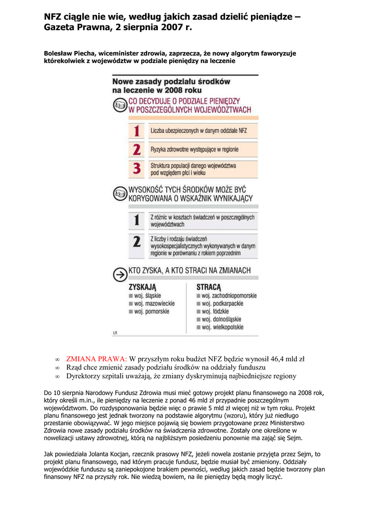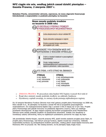 NFZ ciągle nie wie, według jakich zasad dzielić pieniądze – Gazeta Prawna, 2 sierpnia 2007 r. Bolesław Piecha, wiceminister zdrowia, zaprzecza, Ŝe nowy algorytm faworyzuje którekolwiek z województw w podziale pieniędzy na leczenie • • • ZMIANA PRAWA: W przyszłym roku budŜet NFZ będzie wynosił 46,4 mld zł Rząd chce zmienić zasady podziału środków na oddziały funduszu Dyrektorzy szpitali uwaŜają, Ŝe zmiany dyskryminują najbiedniejsze regiony Do 10 sierpnia Narodowy Fundusz Zdrowia musi mieć gotowy projekt planu finansowego na 2008 rok, który określi m.in., ile pieniędzy na leczenie z ponad 46 mld zł przypadnie poszczególnym województwom. Do rozdysponowania będzie więc o prawie 5 mld zł więcej niŜ w tym roku. Projekt planu finansowego jest jednak tworzony na podstawie algorytmu (wzoru), który juŜ niedługo przestanie obowiązywać. W jego miejsce pojawią się bowiem przygotowane przez Ministerstwo Zdrowia nowe zasady podziału środków na świadczenia zdrowotne. Zostały one określone w nowelizacji ustawy zdrowotnej, którą na najbliŜszym posiedzeniu ponownie ma zająć się Sejm. Jak powiedziała Jolanta Kocjan, rzecznik prasowy NFZ, jeŜeli nowela zostanie przyjęta przez Sejm, to projekt planu finansowego, nad którym pracuje fundusz, będzie musiał być zmieniony. Oddziały wojewódzkie funduszu są zaniepokojone brakiem pewności, według jakich zasad będzie tworzony plan finansowy NFZ na przyszły rok. Nie wiedzą bowiem, na ile pieniędzy będą mogły liczyć. Bez wskaźnika migracji Obecnie o podziale pieniędzy na świadczenia decyduje przede wszystkim liczba ubezpieczonych w danym województwie, ich wiek i płeć oraz rodzaje ryzyk zdrowotnych charakterystyczne dla danego regionu. Wysokość środków, jaka przypada na poszczególne regiony, jest korygowana o tzw. wskaźnik migracyjny, który uwzględnia przepływ pacjentów, którzy leczą się w innym województwie, niŜ są ubezpieczeni. Zgodnie z nowelizacją ustawy zdrowotnej wskaźnik migracyjny przestanie jednak obowiązywać. Oddziały wojewódzkie będą rozliczać się między sobą za wykonanie konkretnych świadczeń na rzecz przyjezdnych pacjentów. Zdaniem Marka Wójcika ze Związku Powiatów Polskich, moŜe to spowodować opóźnienia w rozliczaniu kosztów takich usług. - Biorąc pod uwagę, Ŝe faktury od świadczeniodawców do funduszu spływają z miesięcznym opóźnieniem, a następnie informacja o tym, Ŝe konkretny pacjent leczył się w innym województwie, niŜ mieszka, musi być przekazana do właściwego dla niego oddziału funduszu, to zwłoka w opłaceniu kosztów leczenia moŜe być nawet kilkumiesięczna - dodaje Marek Wójcik. Koszty jednostkowe Nowe zasady podziału środków na lecznictwo zakładają natomiast, Ŝe wysokość budŜetów poszczególnych oddziałów funduszu będzie korygowana m.in. o wskaźnik wynikający z róŜnic w kosztach jednostkowych świadczeń zdrowotnych. Problem polega jednak na tym, Ŝe obecnie takie koszty nie są w ogóle liczone i trudno przewidzieć, co miałoby je stanowić. Resort zdrowia nie ustalił Ŝadnych parametrów, które miałyby składać się na ten wskaźnik. Wiadomo jednak, Ŝe na nowych zasadach zyskają te oddziały NFZ, których świadczeniodawcy z jednej strony wykonują specjalistyczne usługi medyczne, ale z drugiej generują wysokie koszty, bo np. w cenie poszczególnych świadczeń medycznych duŜy udział mają koszty pracy lub amortyzacja. Na nowych zasadach zyskają więc województwa, gdzie i teraz trafia najwięcej środków na leczenie, m.in. mazowieckie i śląskie. Straci natomiast pięć innych, w tym: lubelskie, podkarpackie czy kujawsko-pomorskie. To przełoŜy się na ograniczenia w dostępie do świadczeń zdrowotnych dla pacjentów tych regionów. Skarga do Trybunału Konwent Powiatów Województwa Lubelskiego juŜ zgłosił sprzeciw wobec proponowanych zmian. Zdaniem starostów faworyzują one nie te szpitale i oddziały wojewódzkie NFZ, które starają się ograniczać koszty udzielania świadczeń zdrowotnych, lecz te jednostki, które generują je na najwyŜszym poziomie. Według Krzysztofa Tuczapskiego, przewodniczącego Konwentu Szpitali Zamojszczyzny, wprowadzenie wskaźnika jednostkowych kosztów świadczeń zdrowotnych uderzy w te szpitale, które i tak mają niskie kontrakty. - Poza tym uwzględnienie wskaźnika wynikającego ze zróŜnicowanego kosztu jednostkowego świadczenia przy podziale środków między oddziały wojewódzkie NFZ jest sprzeczne z konstytucyjną zasadą równego dostępu do świadczeń - dodaje Krzysztof Tuczapski. Dyrektorzy zamojskich szpitali zapowiadają, Ŝe jeŜeli nowelizacja ustawy zdrowotnej wprowadzająca niesprawiedliwy - ich zdaniem - podział środków na leczenie wejdzie w Ŝycie, to zaskarŜą jej przepisy do Trybunału Konstytucyjnego. 46,4 mld zł wyniesie budŜet NFZ w 2008 roku 42 mld zł wynosi budŜet NFZ w 2007 roku DOMINIKA SIKORA