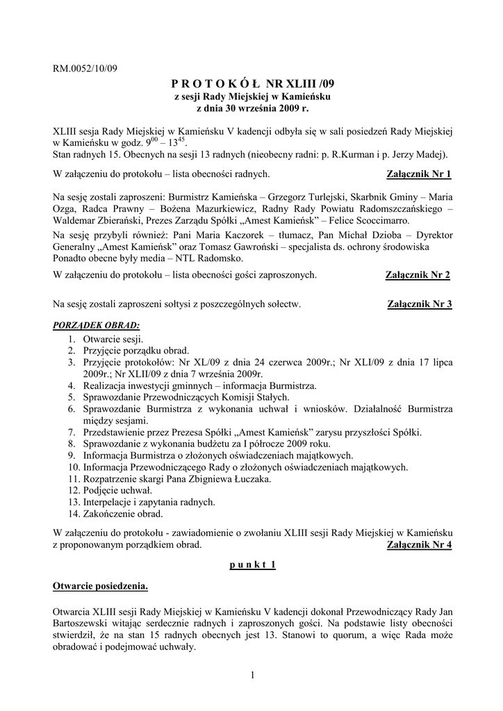 RM.0052/10/09 P R O T O K Ó Ł NR XLIII /09 z sesji Rady Miejskiej w Kamieńsku z dnia 30 września 2009 r. XLIII sesja Rady Miejskiej w Kamieńsku V kadencji odbyła się w sali posiedzeń Rady Miejskiej w Kamieńsku w godz. 900 – 1345. Stan radnych 15. Obecnych na sesji 13 radnych (nieobecny radni: p. R.Kurman i p. Jerzy Madej). W załączeniu do protokołu – lista obecności radnych. Załącznik Nr 1 Na sesję zostali zaproszeni: Burmistrz Kamieńska – Grzegorz Turlejski, Skarbnik Gminy – Maria Ozga, Radca Prawny – BoŜena Mazurkiewicz, Radny Rady Powiatu Radomszczańskiego – Waldemar Zbierański, Prezes Zarządu Spółki „Amest Kamieńsk” – Felice Scoccimarro. Na sesję przybyli równieŜ: Pani Maria Kaczorek – tłumacz, Pan Michał Dzioba – Dyrektor Generalny „Amest Kamieńsk” oraz Tomasz Gawroński – specjalista ds. ochrony środowiska Ponadto obecne były media – NTL Radomsko. W załączeniu do protokołu – lista obecności gości zaproszonych. Załącznik Nr 2 Na sesję zostali zaproszeni sołtysi z poszczególnych sołectw. Załącznik Nr 3 PORZĄDEK OBRAD: 1. Otwarcie sesji. 2. Przyjęcie porządku obrad. 3. Przyjęcie protokołów: Nr XL/09 z dnia 24 czerwca 2009r.; Nr XLI/09 z dnia 17 lipca 2009r.; Nr XLII/09 z dnia 7 września 2009r. 4. Realizacja inwestycji gminnych – informacja Burmistrza. 5. Sprawozdanie Przewodniczących Komisji Stałych. 6. Sprawozdanie Burmistrza z wykonania uchwał i wniosków. Działalność Burmistrza między sesjami. 7. Przedstawienie przez Prezesa Spółki „Amest Kamieńsk” zarysu przyszłości Spółki. 8. Sprawozdanie z wykonania budŜetu za I półrocze 2009 roku. 9. Informacja Burmistrza o złoŜonych oświadczeniach majątkowych. 10. Informacja Przewodniczącego Rady o złoŜonych oświadczeniach majątkowych. 11. Rozpatrzenie skargi Pana Zbigniewa Łuczaka. 12. Podjęcie uchwał. 13. Interpelacje i zapytania radnych. 14. Zakończenie obrad. W załączeniu do protokołu - zawiadomienie o zwołaniu XLIII sesji Rady Miejskiej w Kamieńsku z proponowanym porządkiem obrad. Załącznik Nr 4 punkt 1 Otwarcie posiedzenia. Otwarcia XLIII sesji Rady Miejskiej w Kamieńsku V kadencji dokonał Przewodniczący Rady Jan Bartoszewski witając serdecznie radnych i zaproszonych gości. Na podstawie listy obecności stwierdził, Ŝe na stan 15 radnych obecnych jest 13. Stanowi to quorum, a więc Rada moŜe obradować i podejmować uchwały. 1 punkt 2 Przyjęcie porządku obrad. Przewodniczący Rady przedstawił proponowany porządek obrad, który radni otrzymali wraz z materiałami na sesję. Następnie zapytał czy są jakieś uwagi do porządku obrad. Skarbnik Gminy p. Maria Ozga zapytała czy po punkcie drugim moŜna by było wprowadzić punkt pt.: Podjęcie uchwały w sprawie zmian w budŜecie gminy na rok 2009. Wyjaśniła, Ŝe na godz. 1100 musi być w Regionalnej Izbie Obrachunkowej w Łodzi i chciałaby jak najwcześniej zreferować tą uchwałę. Więcej propozycji do porządku obrad nie zgłoszono. Przewodniczący Rady poddał pod głosowanie wniosek o wprowadzenie po punkcie drugim punktu pt.: Podjęcie uchwały w sprawie zmian w budŜecie gminy na rok 2009. Głosowało 13 radnych. Za przyjęciem ww. wniosku głosowało 12 radnych. 1 radny wstrzymał się od głosu. W wyniku głosowania ww. wniosek został przyjęty. Po zmianie porządek obrad przedstawia się następująco: 1. Otwarcie sesji. 2. Przyjęcie porządku obrad. 3. Podjęcie uchwały w sprawie zmian w budŜecie gminy na rok 2009. 4. Przyjęcie protokołów: Nr XL/09 z dnia 24 czerwca 2009r.; Nr XLI/09 z dnia 17 lipca 2009r.; Nr XLII/09 z dnia 7 września 2009r. 5. Realizacja inwestycji gminnych – informacja Burmistrza. 6. Sprawozdanie Przewodniczących Komisji Stałych. 7. Sprawozdanie Burmistrza z wykonania uchwał i wniosków. Działalność Burmistrza między sesjami. 8. Przedstawienie przez Prezesa Spółki „Amest Kamieńsk” zarysu przyszłości Spółki. 9. Sprawozdanie z wykonania budŜetu za I półrocze 2009 roku. 10. Informacja Burmistrza o złoŜonych oświadczeniach majątkowych. 11. Informacja Przewodniczącego Rady o złoŜonych oświadczeniach majątkowych. 12. Rozpatrzenie skargi Pana Zbigniewa Łuczaka. 13. Podjęcie uchwał. 14. Interpelacje i zapytania radnych. 15. Zakończenie obrad. punkt 3 Podjęcie uchwały w sprawie zmian w budŜecie gminy na rok 2009. Skarbnik Gminy Pani Maria Ozga zapoznała z treścią projektu uchwały w sprawie zmian w budŜecie gminy na rok 2009 oraz omówiła załączniki do uchwały. Poinformowała, Ŝe będzie jeszcze jedna zmiana, (która nie była podana w projekcie uchwały) w wydatkach inwestycyjnych w dziale 6050 kwota zwiększenia 6 000 zł. To byłoby na inwentaryzację i opracowanie kosztorysów na remont świetlicy w Barczkowicach. Natomiast środki pochodziłyby z rezerwy, czyli rezerwy byłyby zmniejszone o 6.000 zł. Przewodniczący Rady otworzył dyskusję. 2 Radna Z.RoŜniatowska zapytała, na co jest przeznaczone zwiększenie w kwocie 5.000 zł w dziale promocja oraz dlaczego się zdejmuje kwotę 37.000 zł z dokształcania i doskonalenia nauczycieli? Skarbnik Gminy wyjaśniła, Ŝe jeŜeli chodzi o dokształcanie nauczycieli to informowała się w Miejskim Zespole Ekonomiczno Administracyjnym (gdzie jest prowadzona dokładna analiza i są zabezpieczane środki) i zabezpieczone są środki na podania dla tych nauczycieli, którzy złoŜyli. Radna Z.RoŜniatowska dodała, Ŝe z tego, co wie to nie wszyscy dostali na dokształcanie, dlatego to jest pytanie do Pana Burmistrza, dlaczego nie wszyscy dostali, a teraz taka duŜa kwota jest zdejmowana? Burmistrz G.Turlejski oznajmił, Ŝe wszyscy, którzy złoŜyli wnioski dostali dofinansowanie. Radny B.Pawłowski podkreślił, Ŝe ma wątpliwości, co do słuszności zdjęcia tych 37 tysięcy z dokształcania nauczycieli, poniewaŜ z wiedzy, którą posiada jak i z rozmów z niektórymi nauczycielami wynika, Ŝe nie wszyscy nauczyciel