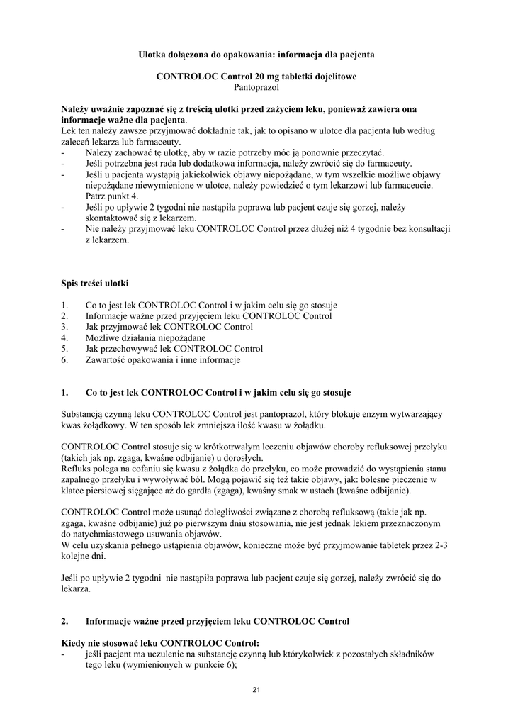 Ulotka dołączona do opakowania: informacja dla pacjenta CONTROLOC Control 20 mg tabletki dojelitowe Pantoprazol Należy uważnie zapoznać się z treścią ulotki przed zażyciem leku, ponieważ zawiera ona informacje ważne dla pacjenta. Lek ten należy zawsze przyjmować dokładnie tak, jak to opisano w ulotce dla pacjenta lub według zaleceń lekarza lub farmaceuty. Należy zachować tę ulotkę, aby w razie potrzeby móc ją ponownie przeczytać. Jeśli potrzebna jest rada lub dodatkowa informacja, należy zwrócić się do farmaceuty. Jeśli u pacjenta wystąpią jakiekolwiek objawy niepożądane, w tym wszelkie możliwe objawy niepożądane niewymienione w ulotce, należy powiedzieć o tym lekarzowi lub farmaceucie. Patrz punkt 4. Jeśli po upływie 2 tygodni nie nastąpiła poprawa lub pacjent czuje się gorzej, należy skontaktować się z lekarzem. Nie należy przyjmować leku CONTROLOC Control przez dłużej niż 4 tygodnie bez konsultacji z lekarzem. Spis treści ulotki 1. 2. 3. 4. 5. 6. Co to jest lek CONTROLOC Control i w jakim celu się go stosuje Informacje ważne przed przyjęciem leku CONTROLOC Control Jak przyjmować lek CONTROLOC Control Możliwe działania niepożądane Jak przechowywać lek CONTROLOC Control Zawartość opakowania i inne informacje 1. Co to jest lek CONTROLOC Control i w jakim celu się go stosuje Substancją czynną leku CONTROLOC Control jest pantoprazol, który blokuje enzym wytwarzający kwas żołądkowy. W ten sposób lek zmniejsza ilość kwasu w żołądku. CONTROLOC Control stosuje się w krótkotrwałym leczeniu objawów choroby refluksowej przełyku (takich jak np. zgaga, kwaśne odbijanie) u dorosłych. Refluks polega na cofaniu się kwasu z żołądka do przełyku, co może prowadzić do wystąpienia stanu zapalnego przełyku i wywoływać ból. Mogą pojawić się też takie objawy, jak: bolesne pieczenie w klatce piersiowej sięgające aż do gardła (zgaga), kwaśny smak w ustach (kwaśne odbijanie). CONTROLOC Control może usunąć dolegliwości związane z chorobą refluksową (takie jak np. zgaga, kwaśne odbijanie) już po pierwszym dniu stosowania, nie jest jednak lekiem przeznaczonym do natychmiastowego usuwania objawów. W celu uzyskania pełnego ustąpienia objawów, konieczne może być przyjmowanie tabletek przez 2-3 kolejne dni. Jeśli po upływie 2 tygodni nie nastąpiła poprawa lub pacjent czuje się gorzej, należy zwrócić się do lekarza. 2. Informacje ważne przed przyjęciem leku CONTROLOC Control Kiedy nie stosować leku CONTROLOC Control: jeśli pacjent ma uczulenie na substancję czynną lub którykolwiek z pozostałych składników tego leku (wymienionych w punkcie 6); 21 - jeśli pacjent stosuje lek zawierający atazanawir (w leczeniu zakażenia HIV). Patrz „Lek CONTROLOC Control a inne leki”. Ostrzeżenia i środki ostrożności Przed rozpoczęciem przyjmowania leku CONTROLOC Control należy omówić to z lekarzem: jeśli pacjent jest leczony z powodu zgagi lub niestrawności nieprzerwanie przez 4 lub więcej tygodni; jeśli pacjent ma ponad 55 lat i codziennie stosuje leki na niestrawność wydawane bez recepty; jeśli pacjent ma ponad 55 lat i zauważył jakiekolwiek nowe niepokojące objawy lub zmienił się charakter dotychczasowych objawów choroby refluksowej; jeśli pacjent przebył chorobę wrzodową żołądka lub przeszedł operację żołądka; jeśli pacjent ma problemy z wątrobą lub żółtaczkę (zażółcenie skóry i oczu); jeśli pacjent jest pod stałą opieką lekarza z powodu innych ciężkich dolegliwości lub chorób; jeśli pacjent będzie miał wykonane badanie endoskopowe lub test ureazowy. Należy natychmiast poinformować lekarza przed lub po zastosowaniu tego leku, jeśli pacjent zauważy pojawienie się następujących objawów, mogących być oznaką innych, poważniejszych chorób: niezamierzona utrata masy ciała (nie związana z dietą lub ćwiczeniami); wymioty, szczególnie nawracające; krwawe wymioty, które mogą wyglądać jak ciemne fusy po kawie; krew w kale, kał czarny lub smolisty; problemy z połykaniem lub ból w trakcie przełykania; bladość i osłabienie (niedokrwistość); ból w klatce piersiowej; ból brzucha; ciężkie i (lub) uporczywe biegunki, (ponieważ stosowanie tego leku wiąże się z niewielkim zwiększeniem ryzyka biegunki zakaźnej). Lekarz może zdecydować o konieczności wykonania dodatkowych badań. Jeśli pacjent ma mieć wykonane badanie krwi, powinien poinformować lekarza o przyjmowaniu tego leku. Możliwe jest, że pacjent stwierdzi złagodzenie objawów refluksu i zgagi już po jednym dniu stosowania CONTROLOC Control. Nie jest to jednak lek przeznaczony do natychmiastowego usuwania objawów. Nie należy go stosować zapobiegawczo. Jeżeli od pewnego czasu pacjent cierpi z powodu nawracającej zgagi lub objawów niestrawności, powinien pozostawać pod regularną kontrolą lekarza. Dzieci i młodzież CONTROLOC Control nie należy stosować u dzieci i młodzieży w wieku poniżej 18 lat ze względu na brak danych dotyczących bezpieczeństwa stosowania tego leku w tej grupie wiekowej. Lek CONTROLOC Control a inne leki Należy powiedzieć lekarzowi lub farmaceucie o wszystkich lekach przyjmowanych przez pacjenta obecnie lub ostatnio, a także o lekach, które pacjent planuje przyjmować. Lek CONTROLOC Control może wpływać hamująco na skuteczność działania innych leków, zwłaszcza leków zawierających jedną z następujących substancji czynnych: atazanawir (stosowany w leczeniu HIV). Nie wolno stosować leku CONTROLOC Control jednocześnie z atazanawirem. Patrz „Kiedy nie stosować leku CONTROLOC Control” ketokonazol (stosowany w zakażeniach grzybiczych); warfaryna i fenprokumon (wpływają na gęstość krwi i zapobiegają zakrzepom). Może być konieczne dodatkowe badanie krwi; metotreksat (stosowany w leczeniu reumatoidalnego zapalenia stawów, łuszczycy i chorób nowotworowych) w przypadku stosowania metotreka