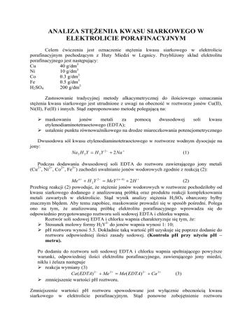 ANALIZA STĘŻENIIA KWASU SIARKOWEGO W ELEKTROLICIE PORAFINACYJNYM Celem ćwiczenia jest oznaczenie stężenia kwasu siarkowego w elektrolicie porafinacyjnym pochodzącym z Huty Miedzi w Legnicy. Przybliżony skład elektrolitu porafinacyjnego jest następujący: Cu 40 g/dm3 Ni 10 g/dm3 Co 0.3 g/dm3 Fe 0.5 g/dm3 H2SO4 200 g/dm3 Zastosowanie tradycyjnej metody alkacymetrycznej do ilościowego oznaczania stężenia kwasu siarkowego jest utrudnione z uwagi na obecność w roztworze jonów Cu(II), Ni(II), Fe(II) i innych. Stąd zaproponowano metodę polegającą na: maskowaniu jonów metali za pomocą dwusodowej soli kwasu etylenodiaminotetraoctowego (EDTA); ustalenie punktu równoważnikowego na drodze miareczkowania potencjometrycznego Dwusodowa sól kwasu etylenodiaminotetraoctowego w roztworze wodnym dysocjuje na jony: Na 2 H 2Y = H 2Y 2− + 2 Na + (1) Podczas dodawania dwusodowej soli EDTA do roztworu zawierającego jony metali (Cu , Ni2+, Co2+, Fe3+) zachodzi uwalnianie jonów wodorowych zgodnie z reakcją (2): 2+ Me n + + H 2Y 2− = MeY ( n −4 ) + 2 H + (2) Przebieg reakcji (2) powoduje, że stężenie jonów wodorowych w roztworze pochodziłoby od kwasu siarkowego dodanego z analizowaną próbką oraz produktu reakcji kompleksowania metali zawartych w elektrolicie. Stąd wynik analizy stężenia H2SO4 obarczony byłby znacznym błędem. Aby temu zapobiec, maskowanie prowadzi się w sposób pośredni. Polega ono na tym, że analizowaną próbkę elektrolitu porafinacyjnego wprowadza się do odpowiednio przygotowanego roztworu soli sodowej EDTA i chlorku wapnia. Roztwór soli sodowej EDTA i chlorku wapnia charakteryzuje się tym, że: Stosunek molowy formy H2Y2- do jonów wapnia wynosi 1: 10; pH roztworu wynosi 5.5. Dokładnie taką wartość pH uzyskuje się poprzez dodanie do roztworu odpowiedniej ilości zasady sodowej. (Kontrola pH przy użyciu pH – metru). Po dodaniu do roztworu soli sodowej EDTA i chlorku wapnia spełniającego powyższe warunki, odpowiedniej ilości elektrolitu porafinacyjnego, zawierającego jony miedzi, niklu i żelaza następuje reakcja wymiany (3) Ca ( EDTA) 2− + Me 2+ = Me( EDTA) 2− + Ca 2+ (3) zmniejszenie wartości pH roztworu. Zmniejszenie wartości pH roztworu spowodowane jest wyłącznie obecnością kwasu siarkowego w elektrolicie porafinacyjnym. Stąd ponowne zobojętnienie roztworu mianowanym roztworem zasady sodowej do pierwotnie ustalonej wartości pH wynoszącej 5.5 pozwala na obliczenie zawartości kwasu siarkowego w analizowanym elektrolicie porafinacyjnym. WYKONANIE ANALIZY 1. Rozcieńczenie roztworu elektrolitu porafinacyjnego Analizowany roztwór elektrolitu porafinacyjnego rozcieńczyć w stosunku 1: 10 (używając do tego pipety i kolby miarowej). 2. Przygotowanie roztworu soli sodowej EDTA i chlorku wapnia o pH = 5.5 Do zlewki o pojemności 150 cm3 (wysokiej) zaopatrzonej w mieszadło magnetyczne dodać 25.0 cm3 0.200M roztworu soli sodowej EDTA, 50.0 cm3 1.00 M roztworu CaCl2 i około 25 cm3 wody destylowanej. Do zlewki z tak przygotowanym roztworem zanurzyć elektrodę pH-metryczną. PH takiego roztworu jest dużo mniejsze od 5.5. Włączyć mieszadło magnetyczne i po kropli dodawać stężonego ( ok. 1M) roztworu NaOH. Bardzo dokładnie kontrolować wzrost pH. Gdy pH roztworu osiągnie wartość ~ 4.5 dodawać rozcieńczony (ok. 0.01M) roztwór wodorotlenku sodu. Zobojętnianie prowadzić do tego momentu aż pH roztworu osiągnie wartość 5.5. 3. Oznaczenie zawartości kwasu siarkowego w rozcieńczonym roztworze elektrolitu porafinacyjnego. Do przygotowanego, zgodnie z punktem 2 roztworu dodać 10.0 cm3 rozcieńczonego (zgodnie z ptem. 1) roztworu elektrolitu porafinacyjnego. Przystąpić do miareczkowania mianowanym roztworem zasady sodowej. Roztwór NaOH dodawać porcjami po 0.5 cm3. Po dodaniu każdej porcji kontrolować i notować wartość pH roztworu. Gdy miareczkowany roztwór osiągnie wartość pH około 5.0, zasadę sodową dodawać po kropli, do momentu gdy pH roztworu w zlewce osiągnie wartość 5.5. Odczytać objętość dodanego roztworu NaOH. Obliczyć ile gramów kwasu siarkowego zawiera pierwotny roztwór elektrolitu porafinacyjnego. Literatura uzupełniająca: 1. A. Cygański, Chemiczne metody analizy ilościowej, WNT Warszawa 1992 2. F. J. Welcher, Analityczne zastosowanie kwasu wersenowego, WNT Warszawa 1963 (odpowiednie strony znajdują się w punkcie ksero w budynku A – 3)