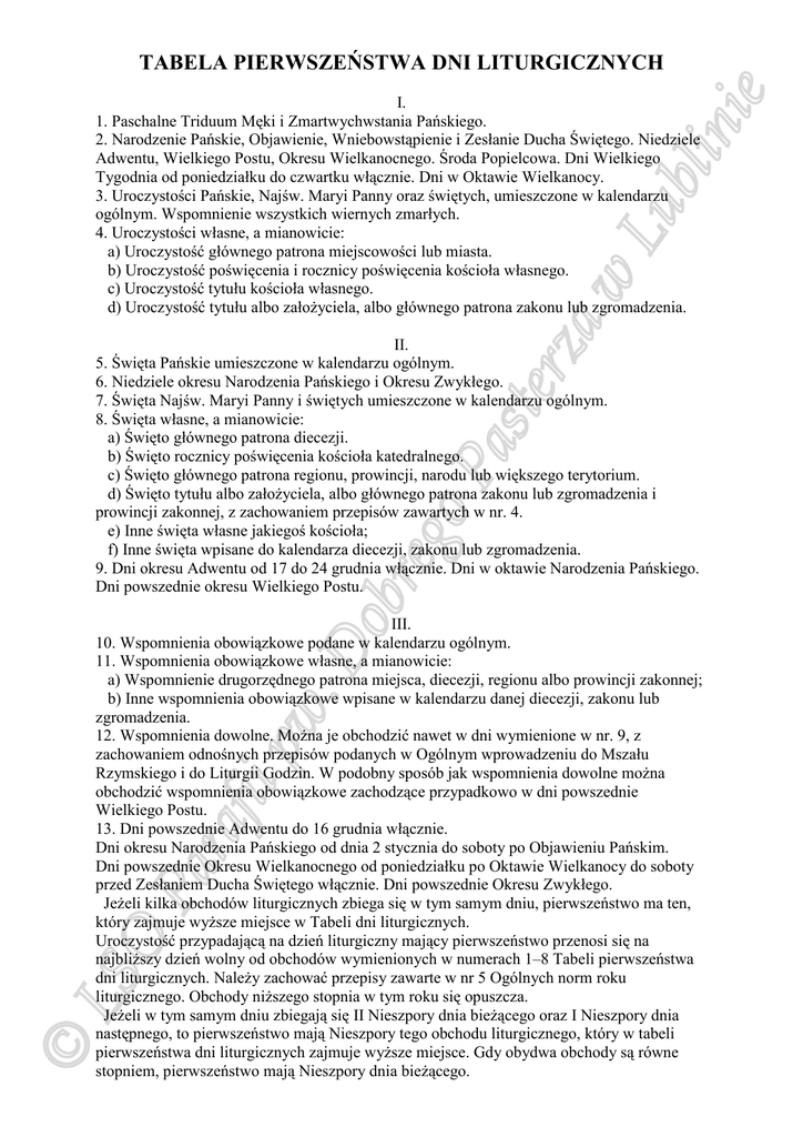 TABELA PIERWSZEŃSTWA DNI LITURGICZNYCH I. 1. Paschalne Triduum Męki i Zmartwychwstania Pańskiego. 2. Narodzenie Pańskie, Objawienie, Wniebowstąpienie i Zesłanie Ducha Świętego. Niedziele Adwentu, Wielkiego Postu, Okresu Wielkanocnego. Środa Popielcowa. Dni Wielkiego Tygodnia od poniedziałku do czwartku włącznie. Dni w Oktawie Wielkanocy. 3. Uroczystości Pańskie, Najśw. Maryi Panny oraz świętych, umieszczone w kalendarzu ogólnym. Wspomnienie wszystkich wiernych zmarłych. 4. Uroczystości własne, a mianowicie: a) Uroczystość głównego patrona miejscowości lub miasta. b) Uroczystość poświęcenia i rocznicy poświęcenia kościoła własnego. c) Uroczystość tytułu kościoła własnego. d) Uroczystość tytułu albo załoŜyciela, albo głównego patrona zakonu lub zgromadzenia. II. 5. Święta Pańskie umieszczone w kalendarzu ogólnym. 6. Niedziele okresu Narodzenia Pańskiego i Okresu Zwykłego. 7. Święta Najśw. Maryi Panny i świętych umieszczone w kalendarzu ogólnym. 8. Święta własne, a mianowicie: a) Święto głównego patrona diecezji. b) Święto rocznicy poświęcenia kościoła katedralnego. c) Święto głównego patrona regionu, prowincji, narodu lub większego terytorium. d) Święto tytułu albo załoŜyciela, albo głównego patrona zakonu lub zgromadzenia i prowincji zakonnej, z zachowaniem przepisów zawartych w nr. 4. e) Inne święta własne jakiegoś kościoła; f) Inne święta wpisane do kalendarza diecezji, zakonu lub zgromadzenia. 9. Dni okresu Adwentu od 17 do 24 grudnia włącznie. Dni w oktawie Narodzenia Pańskiego. Dni powszednie okresu Wielkiego Postu. III. 10. Wspomnienia obowiązkowe podane w kalendarzu ogólnym. 11. Wspomnienia obowiązkowe własne, a mianowicie: a) Wspomnienie drugorzędnego patrona miejsca, diecezji, regionu albo prowincji zakonnej; b) Inne wspomnienia obowiązkowe wpisane w kalendarzu danej diecezji, zakonu lub zgromadzenia. 12. Wspomnienia dowolne. MoŜna je obchodzić nawet w dni wymienione w nr. 9, z zachowaniem odnośnych przepisów podanych w Ogólnym wprowadzeniu do Mszału Rzymskiego i do Liturgii Godzin. W podobny sposób jak wspomnienia dowolne moŜna obchodzić wspomnienia obowiązkowe zachodzące przypadkowo w dni powszednie Wielkiego Postu. 13. Dni powszednie Adwentu do 16 grudnia włącznie. Dni okresu Narodzenia Pańskiego od dnia 2 stycznia do soboty po Objawieniu Pańskim. Dni powszednie Okresu Wielkanocnego od poniedziałku po Oktawie Wielkanocy do soboty przed Zesłaniem Ducha Świętego włącznie. Dni powszednie Okresu Zwykłego. JeŜeli kilka obchodów liturgicznych zbiega się w tym samym dniu, pierwszeństwo ma ten, który zajmuje wyŜsze miejsce w Tabeli dni liturgicznych. Uroczystość przypadającą na dzień liturgiczny mający pierwszeństwo przenosi się na najbliŜszy dzień wolny od obchodów wymienionych w numerach 1–8 Tabeli pierwszeństwa dni liturgicznych. NaleŜy zachować przepisy zawarte w nr 5 Ogólnych norm roku liturgicznego. Obchody niŜszego stopnia w tym roku się opuszcza. JeŜeli w tym samym dniu zbiegają się II Nieszpory dnia bieŜącego oraz I Nieszpory dnia następnego, to pierwszeństwo mają Nieszpory tego obchodu liturgicznego, który w tabeli pierwszeństwa dni liturgicznych zajmuje wyŜsze miejsce. Gdy obydwa obchody są równe stopniem, pierwszeństwo mają Nieszpory dnia bieŜącego.