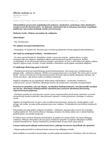 Młody maluje cz. 6 Włodzimierz Kalicki 2009-09-13 Źródło: Duży Format, http://wyborcza.pl/1,75480,7030137,Mlody_maluje_cz__6.html Odwiedziłem pracownie najmłodszych malarzy: studentów ostatniego roku akademii i zeszłorocznych absolwentów. Za dziesięć, piętnaście lat to ich prace powinny wypełniać publiczne i prywatne kolekcje sztuki nowoczesnej. Melania Yerka. Piękno narzędzia do zabijania. Abstrakcja? - Nie, lotniskowiec. No, piękny ten pani lotniskowiec. - Przepiękny. W naturze też. Niewiele jest w świecie przedmiotów równie pięknych jak lotniskowce. Ale skąd na sztalugach kobiety - lotniskowiec? - To obraz sprzed dwóch lat. Dostaliśmy wtedy w pracowni zadanie - piękny obraz o wojnie. Przygotowując się, najpierw oglądałam zdjęcia najrozmaitszych machin wojennych. Szybko zrozumiałam, że nie powinnam malować machin z przeszłości, bo jest w nich także inne piękno, piękno starości, upływu czasu, trwania. A mnie chodziło o absolutnie czyste piękno narzędzia zabijania. Co pięknego dostrzega pani w broni? - Współczesna broń jest materializacją czystej funkcjonalności. Jest ascetyczna, zredukowana do jednego tylko - zdolności zabijania. Widok nowoczesnej broni coś w nas budzi. Nie wiem, jak to na nas działa - może to kwestia jej wewnętrznej harmonii? Broń jest dziś po ludzku drapieżna, okrutna, ale czysta, bez skazy - gdy jeszcze czeka na zabójcze uderzenie. Najpierw skupiłam się na samolotach. Malowałam najróżniejsze - myśliwskie, bombowce, rozpoznawcze, zawsze z błyskiem chłodnego metalu, ale ostatecznie z samolotu zrezygnowałam. Przecież to samoloty, nie zaś okręty, są ideałem funkcjonalności. Aerodynamiki oszukać się nie da. Absolutny funkcjonalizm samolotu jest zarazem absolutną harmonią, napowietrznym pięknem. - Chciałam namalować sytuację poza czasem i poza rozpoznawalną przestrzenią. Samoloty na moich obrazach były bardzo konkretne, zdecydowanie wpisane w realną przestrzeń, istniejące w realnym czasie. Zajęłam się lotniskowcem, bo jest w nim wyrafinowana harmonia, skończone, śmiałe piękno, i jest potęga, tak wielka, że sama siebie przenosi poza czas i miejsce. To lotniskowiec jest królem wojennych machin. Fascynujące jest jego piękno widziane od dziobu - rozłożysta, ogromna góra wznosi się na bardzo wąskiej podstawie. Ten morski olbrzym władający światem, bo zdolny zadać cios w niemal każdym punkcie globu, ma idealne proporcje. W trakcie pracy nad tym obrazem zrozumiałam, że piękno nie uznaje detalu, nie znosi zdobnego nadmiaru. Dlatego odrzuciłam cały ten gąszcz drobnych sprzętów i urządzeń oblepiający kadłuby realnych lotniskowców. Piękno lotniskowca zredukowałam do paru linii i plam koloru. Czemu użyła pani takiego zestawienia barw, jakiego na morzu się jednak nie spotyka? - Połacie jaskrawej bieli to srebrzyste burty intensywnie odbijające światło. Kolor kadłuba to oczywiście nie jest kolor, na jaki maluje się lotniskowce. Chciałam, żeby ten kolor po prostu wychodził zdecydowanie z obrazu, by nie był płaski, bo wtedy obraz stałby się plakatem albo formą graficzną. Stąd te kolory, od niemal czerni, poprzez mocną czerwień aż do prawie różu. One zresztą mają zdecydowanie erotyczną wymowę. Pani wizja lotniskowca nieodparcie przywodzi mi na myśl paleolityczne przedstawienia kobiet - owe Wenus z Willendorfu, Vestonic itp. Linia kadłuba to linia ud tamtych korpulentnych fetyszy kobiecości, bardzo pełnych u góry, ku dołowi nagle smuklejących. U nich także podstawa materialnej obfitości jest nienaturalnie szczupła, wręcz wątła. - Ależ tak, już w trakcie pracy nad obrazem zauważyłam, że lotniskowiec kojarzy mi się z kobietą, z silną, władczą kobietą, dominującą, bezwzględną, niszczycielską, która swoje dzieci - samoloty - bez wahania wysyła na wojnę. Wojna, śmierć są nierozerwalnie splecione z Erosem. Nie kusiło pani, by temat lotniskowca rozwinąć w innych pracach? - Namalowałam wcześniej niewielki obraz, ale traktowałam go jako szkic. Powstał też obraz w pewnym sensie bliźniaczy, tego samego formatu, o tym samym rysunku, ale rozegrany wyłącznie w szarościach. Nie udał mi się tak, jak powinien. Nie wiedziałam, co z nim dalej robić, w końcu uznałam, że nie będę go więcej malować, po prostu odstawię. Bywają takie obrazy, które nie dojrzewają, które od biedy można by jeszcze malować, poprawiać, ale których dalej malować nie należy. Oba obrazy zawiozłam kiedyś na wystawę do Berlina. Jednemu ze zwiedzających szary tak się spodobał, że chciał go kupić. Jak tak, to proszę bardzo, wcale nie byłam do niego przywiązana. Co innego ten lotniskowiec. Żeby nie mieć nigdy pokusy sprzedania go, podarowałam go siostrze. Najnowsze pani obrazy to przedstawienia martwych zwierząt. Śmierć jest stale obecna w pani malarstwie. - Po tych pięknych i chłodnych obrazach machin wojennych zaczęłam malować martwe zwierzęta, w sposób brutalny, eksponując brzydotę śmierci. Długo nie mogłam dojść z tymi obrazami do ładu, znaleźć właściwego tonu, klimatu. Wreszcie, jak się zdaje, znalazłam go - lekko ironiczny, zahaczający o popkulturę. Niestety, najlepszy obraz z tej serii skradziono mi na akademii. To z jednej strony boli, ale z drugiej - być malarzem, któremu kradnie się obrazy, to powód do dumy. - Tylko boli. To naprawdę był świetny obraz: kilka wiszących, uwiązanych za tylne łapy królików. Najbliższy widzowi namalowałam w naturalnych kolorach sierści, pozostałe - tylko w błękitach. To był piękny, skupiony, mistyczny obraz, była w nim wielka powaga odchodzenia w niebyt. Tylko w nim udało mi się osiągnąć siłę wyrazu, o której marzyłam, zaczynając serię martwych zwierząt. Na innym pani obrazie - trzy jelonki. Leżą sobie rozkoszne, wtulone w siebie futerkami. Dopiero po chwili zdajemy sobie sprawę, że są martwe. Malując ś