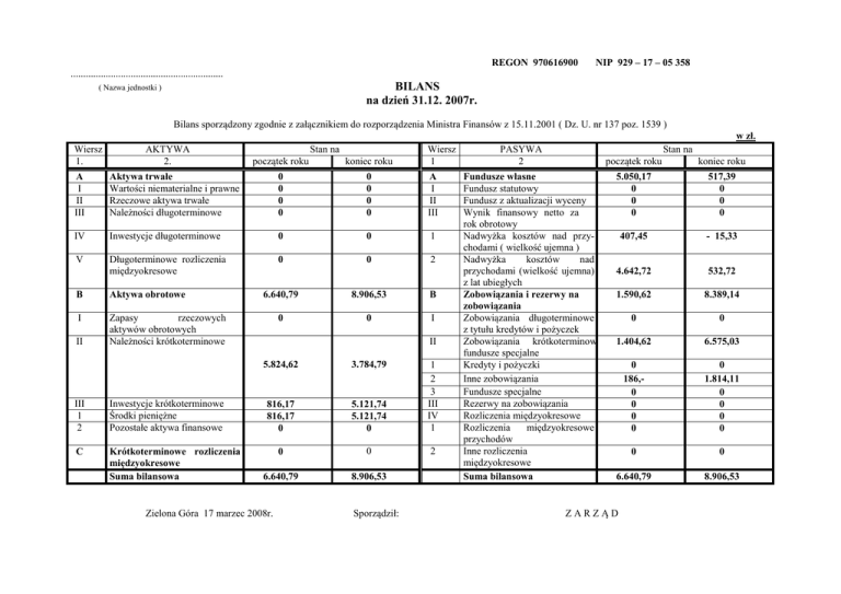 REGON 970616900 NIP 929 – 17 – 05 358 ............................................................. BILANS na dzień 31.12. 2007r. ( Nazwa jednostki ) Bilans sporządzony zgodnie z załącznikiem do rozporządzenia Ministra Finansów z 15.11.2001 ( Dz. U. nr 137 poz. 1539 ) w zł. Wiersz 1. AKTYWA 2. Stan na początek roku koniec roku Wiersz 1 A I II III Aktywa trwałe Wartości niematerialne i prawne Rzeczowe aktywa trwałe Należności długoterminowe 0 0 0 0 0 0 0 0 A I II III IV Inwestycje długoterminowe 0 0 1 V Długoterminowe rozliczenia międzyokresowe 0 0 2 B Aktywa obrotowe I Zapasy rzeczowych aktywów obrotowych Należności krótkoterminowe II III 1 2 Inwestycje krótkoterminowe Środki pieniężne Pozostałe aktywa finansowe C Krótkoterminowe rozliczenia międzyokresowe Suma bilansowa 6.640,79 8.906,53 B 0 0 I II 5.824,62 3.784,79 816,17 816,17 0 5.121,74 5.121,74 0 1 2 3 III IV 1 0 0 2 6.640,79 8.906,53 Zielona Góra 17 marzec 2008r. Sporządził: PASYWA 2 Stan na Fundusze własne Fundusz statutowy Fundusz z aktualizacji wyceny Wynik finansowy netto za rok obrotowy Nadwyżka kosztów nad przychodami ( wielkość ujemna ) Nadwyżka kosztów nad przychodami (wielkość ujemna) z lat ubiegłych Zobowiązania i rezerwy na zobowiązania Zobowiązania długoterminowe z tytułu kredytów i pożyczek Zobowiązania krótkoterminowe fundusze specjalne Kredyty i pożyczki Inne zobowiązania Fundusze specjalne Rezerwy na zobowiązania Rozliczenia międzyokresowe Rozliczenia międzyokresowe przychodów Inne rozliczenia międzyokresowe Suma bilansowa początek roku koniec roku 5.050,17 0 0 0 517,39 0 0 0 407,45 - 15,33 4.642,72 532,72 1.590,62 8.389,14 0 0 1.404,62 6.575,03 0 186,0 0 0 0 0 1.814,11 0 0 0 0 0 0 6.640,79 8.906,53 ZARZĄD