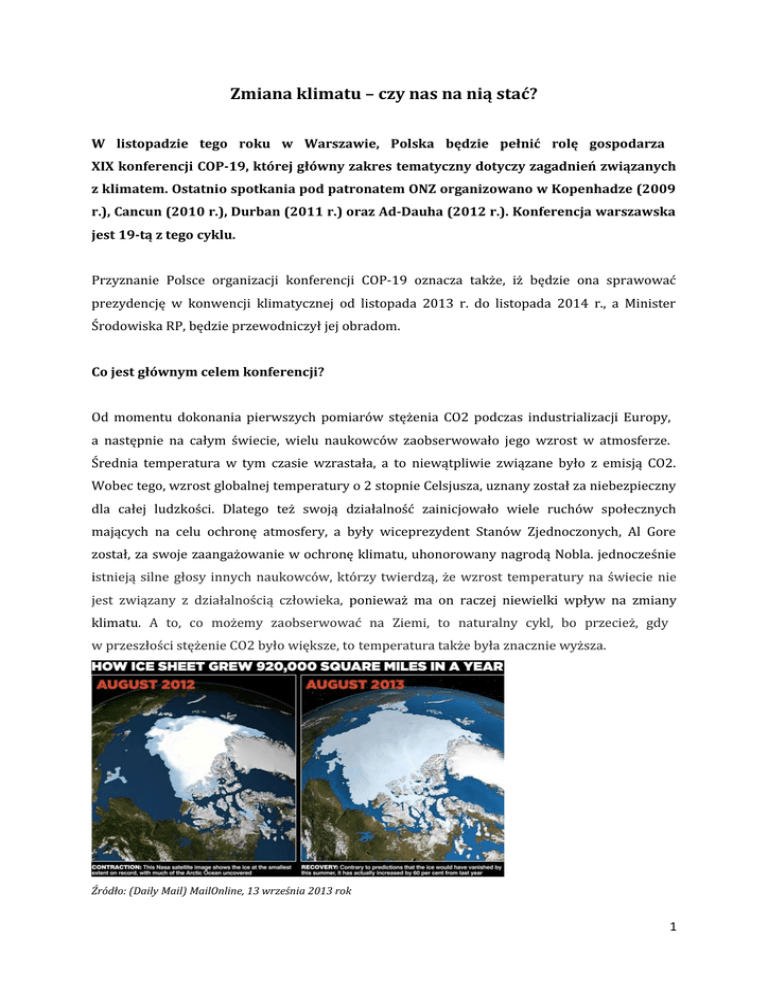 Zmiana klimatu – czy nas na nią stać? W listopadzie tego roku w Warszawie, Polska będzie pełnić rolę gospodarza XIX konferencji COP-19, której główny zakres tematyczny dotyczy zagadnień związanych z klimatem. Ostatnio spotkania pod patronatem ONZ organizowano w Kopenhadze (2009 r.), Cancun (2010 r.), Durban (2011 r.) oraz Ad-Dauha (2012 r.). Konferencja warszawska jest 19-tą z tego cyklu. Przyznanie Polsce organizacji konferencji COP-19 oznacza także, iż będzie ona sprawować prezydencję w konwencji klimatycznej od listopada 2013 r. do listopada 2014 r., a Minister Środowiska RP, będzie przewodniczył jej obradom. Co jest głównym celem konferencji? Od momentu dokonania pierwszych pomiarów stężenia CO2 podczas industrializacji Europy, a następnie na całym świecie, wielu naukowców zaobserwowało jego wzrost w atmosferze. Średnia temperatura w tym czasie wzrastała, a to niewątpliwie związane było z emisją CO2. Wobec tego, wzrost globalnej temperatury o 2 stopnie Celsjusza, uznany został za niebezpieczny dla całej ludzkości. Dlatego też swoją działalność zainicjowało wiele ruchów społecznych mających na celu ochronę atmosfery, a były wiceprezydent Stanów Zjednoczonych, Al Gore został, za swoje zaangażowanie w ochronę klimatu, uhonorowany nagrodą Nobla. jednocześnie istnieją silne głosy innych naukowców, którzy twierdzą, że wzrost temperatury na świecie nie jest związany z działalnością człowieka, ponieważ ma on raczej niewielki wpływ na zmiany klimatu. A to, co możemy zaobserwować na Ziemi, to naturalny cykl, bo przecież, gdy w przeszłości stężenie CO2 było większe, to temperatura także była znacznie wyższa. Źródło: (Daily Mail) MailOnline, 13 września 2013 rok 1 Nie chcę mówić, ani osądzać, kto ma rację a kto nie. Moje podejście jest inne. Powinniśmy dbać o czyste środowisko i oddychać zdrowym powietrzem bez ryzyka zatrucia CO2 lub innymi gazami. Dlatego też, popieram wszelkie starania, które prowadzą do zwiększenia stopnia czystości naszej planety i klimatu. Bez wątpienia jest to największe wyzwanie, przed którym stoi dziś ludzkość. Jak rozumieć wyzwanie? Spostrzec można, że wyzwanie, jakim jest ochrona klimatu, pojmowane jest pozytywnie właściwie przez wszystkie kraje świata. Padło wiele deklaracji i przyrzeczeń. Przy tym wiodącą rolę w tej kwestii odgrywa UE, która wspierana jest przez kraje OECD i G-20, nie wykluczając zresztą gospodarek krajów rozwijających się. Wydaje się, że problem jest bardzo dobrze rozumiany, a każde wielonarodowe porozumienie może zostać z łatwością osiągnięte. Niestety, „diabeł tkwi w szczegółach”. Aby wymienić kilka z nich wystarczy wspomnieć o: różnym poziomie rozwoju gospodarczego oraz jego dalszych perspektywach, możliwości wykorzystania energii odnawialnej zależnie od uwarunkowań geograficznych, zasobach rodzimych źródeł energii i różnych systemach prawnych – przy tym, czy zaproponowane krajom rozwiązania powinny być obligatoryjne, czy oparte na deklaracjach, i jakie będą spodziewane międzynarodowe konsekwencje z tytułu ich nie wypełnienia, jeśli w ogóle będą? Jak mierzyć emisję CO2: w procentach czy w tonach? Wszelkie dyskusje w kwestii dokonywania pomiarów CO2 były do tej pory w poszczególnych krajach oparte na odniesieniach procentowych. Ale co to tak naprawdę oznacza, gdy mówimy, że kraj X zmniejszył od roku 1990 swoją emisję CO2 o 20% albo i o więcej? Z całą natomiast pewnością jest to bez znaczenia dla przeciętnego człowieka, skoro właściwie nie wie, co tak naprawdę pułap 20% oznacza dla Australii, a co dla UE. Posługiwanie się procentami w dyskusji na temat emisji CO2 nie zawsze jest zrozumiałe, ponieważ nie pokazuje ono rzeczywistej siły gospodarczej oraz rozwoju danego kraju. Dlatego też doceniam propozycję CEEP, aby we wszystkich dokumentach powstałych po 2020 roku, stosować jednostkę miary wyrażoną w „tonach na mieszkańca” zamiast procentów. Użycie jednostki miary „tona na mieszkańca” stanowi jasne i precyzyjne odniesienie dla każdego, a jego zastosowanie jest łatwe w przypadku przeprowadzania badań porównawczych rzeczywistych poziomów emisji. Dlatego, aby lepiej zrozumieć całą sytuację oraz występujące różnice, będę posługiwał się jednostką miary „tona na mieszkańca”, zamiast procentami. 2 „Łatwiej powiedzieć, niż zrobić” Musimy wziąć pod uwagę ogromne różnice w rozwoju gospodarczym, jakie występują na całym świecie, nie zapominając przy tym o narodowych aspiracjach do rozwijania swoich gospodarek drogą industrializacji. W większości przypadków, uprzemysłowienie zawsze oznaczać będzie większą emisję CO2. W krajach rozwiniętych takich, jak Stany Zjednoczone, emisja CO2 liczona na jednego mieszkańca w 2011 roku wyniosła 17,3 tony, w Kanadzie 16,2, w Australii 19, w Japonii 9,8, w Rosji 12,8, a w Korei Południowej 12,6. Jednocześnie w EU średni poziom emisji w 2011 roku wynosił 7,5 tony. Emisja CO2 w 2011 roku w przykładowych krajach (tony na mieszkańca) Stany Zjednoczone 17,3 Kanada 16,2 Australia 19,0 Japonia 9,8 Rosja 12,8 Korea Płd. 12,6 Chiny 7,2 Indie 1,6 Brazylia 2,3 Turcja 3,8 Indonezja 2,0 Afryka Płd. 7,2 UE 7,5 Źródło: Joint Research Centre (JRC) To oczywiste, że UE musiała przeznaczyć znaczne środki, aby ograniczyć emisję CO2. Średnia dla świata wynosiła w 2011 roku zaledwie 4,9 tony. Jeśli weźmiemy pod uwagę globalny punkt odniesienia, to wówczas widać, że większość państw, znajduje się poniżej poziomu UE. Największy emitent na świecie, Chiny, w szybkim jednak tempie zbliża się do średniej unijnej. 3 Przy czym Chiny, już zmuszone są stawić czoła katastrofalnej sytuacji wynikającej z faktu skoncentrowania zanieczyszczeń na terenach uprzemysłowionych, które z kolei zamieszkiwane są przez znaczną część chińskiej populacji. Wie