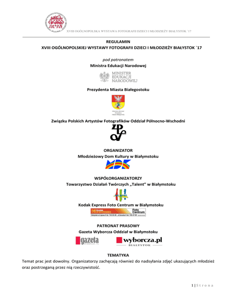XVIII OGÓLNOPOLSKA WYSTAWA FOTOGRAFII DZIECI I MŁODZIEŻY BIAŁYSTOK `17 REGULAMIN XVIII OGÓLNOPOLSKIEJ WYSTAWY FOTOGRAFII DZIECI I MŁODZIEŻY BIAŁYSTOK `17 pod patronatem Ministra Edukacji Narodowej Prezydenta Miasta Białegostoku Związku Polskich Artystów Fotografików Oddział Północno-Wschodni ORGANIZATOR Młodzieżowy Dom Kultury w Białymstoku WSPÓŁORGANIZATORZY Towarzystwo Działań Twórczych „Talent” w Białymstoku Kodak Express Foto Centrum w Białymstoku PATRONAT PRASOWY Gazeta Wyborcza Oddział w Białymstoku TEMATYKA Temat prac jest dowolny. Organizatorzy zachęcają również do nadsyłania zdjęć ukazujących młodzież oraz postrzeganą przez nią rzeczywistość. 1|S t r o n a XVIII OGÓLNOPOLSKA WYSTAWA FOTOGRAFII DZIECI I MŁODZIEŻY BIAŁYSTOK `17 WARUNKI UCZESTNICTWA 1. W konkursie może wziąć udział młodzież ze szkół oraz placówek wychowania pozaszkolnego. 2. Kategorie wiekowe I do ukończonych lat 15 II do ukończonych lat 21 wiek uczestnika jest określony w odniesieniu do daty 30 kwietnia 2017 roku. 3. Każdy autor może nadesłać maksymalnie 4 zdjęcia w dowolnej technice. 4. Zestawy zdjęciowe (nie przekraczające 3 zdjęć), wyraźnie oznaczone, traktowane będą jako jedna praca. 5. Wszystkie prace są nadsyłane w formie elektronicznej o minimalnym rozmiarze dłuższego boku 3000 pikseli w formacie .jpg 6. Dopuszczalna ingerencja cyfrowa w fotografie może dotyczyć działań mających odpowiednik w klasycznych zabiegach edycyjnych: kadrowanie, korekcja tonalna i kolorystyczna, retusz. 7. Do konkursu nie zostaną ̨ zaakceptowane prace na których znajdują ̨ się ̨ znaki, cyfry - daty, znaki wodne, podpisy. 8. Aby wysłać prace (wyłącznie w formie elektronicznej) na konkurs należy: opisane pliki zdjęć wg. klucza: nazwisko_imię_kategoria wiekowa_nr pracy (np. Kowalski_Maciej_1_nr3 lub dla pracy z zestawu: Kowalski_Maciej_1_nr1/3) przesłać na adres [email protected] wypełnić formularz zgłoszeniowy zamieszczony na stronie internetowej konkursu wystawafotografii.mdk.bialystok.pl 9. Uczestnik Konkursu wypełniając formularz zgłoszeniowy oświadcza, że: akceptuje niniejszy Regulamin; jest autorem zdjęć oraz posiada zgodę osób biorących udział przy powstawaniu pracy (osób portretowanych, wizażystów itd.) na uczestnictwo w Konkursie oraz publikacje. Odpowiedzialność za wszelkie roszczenia osób trzecich, które mogłyby zostać skierowane do Organizatorów Konkursu, przyjmuje na siebie Uczestnik Konkursu. 10. Nadesłanie zdjęć, jest równoznaczne z udzieleniem zgody przez uczestnika, jego rodziców lub prawnych opiekunów, na publikację danych osobowych (w materiałach pokonkursowych i na stronie internetowej konkursu) niezbędnych do przeprowadzenia konkursu. OCENA PRAC 1. Oceny zdjęć oraz podziału nagród dokona jury powołane przez organizatorów. 2. Jury przysługuje prawo do innego podziału nagród. 3. Prace nie spełniające warunków określonych w regulaminie nie będą podlegały ocenie jury. 2|S t r o n a XVIII OGÓLNOPOLSKA WYSTAWA FOTOGRAFII DZIECI I MŁODZIEŻY BIAŁYSTOK `17 NAGRODY Nagrodą główną jest GRAND PRIX W każdej grupie wiekowej przyznane będą: I nagroda II nagroda III nagroda Wyróżnienia przewidziane są również Nagrody Specjalne. TERMINARZ WYSTAWY Nadsyłanie plików zdjęciowych i wypełnienie formularza zgłoszeniowego do 12.04.2017 r. Obrady Jury do 21.04.2017 r. Powiadomienie o werdykcie jury do 24.04.2017 r. Otwarcie wystawy 27.05.2017 r. 1. 2. 3. 4. 5. POSTANOWIENIA KOŃCOWE Organizatorzy nie ponoszą odpowiedzialności za uszkodzenie lub zaginięcie prac w czasie przesyłki. Zastrzegają sobie prawo do bezpłatnej reprodukcji zdjęć w katalogu wystawy oraz środkach masowego przekazu w celu promowania imprezy. Prace nagrodzone i wyróżnione przechodzą na własność organizatorów z zachowaniem praw autorskich w przypadku dalszego ich wykorzystania. Nadesłanie prac na wystawę jest równoznaczne z uznaniem warunków niniejszego regulaminu oraz wyrażeniem zgody na publikowanie danych osobowych autora w materiałach promujących wystawę. Każdy uczestnik konkursu otrzyma drogą elektroniczną informację o decyzji jury. Autorzy zdjęć przyjętych do ekspozycji otrzymają katalog wystawy. Uczestniczących w konkursie prosimy o podanie aktualnego adresu e-mail w celach korespondencyjnych. Dodatkowe informacje uzyskać można: tel. 85 732 79 49, tel./fax. 85 732 90 49 www.mdk.bialystok.pl wystawafotografii.mdk.bialystok.pl (oficjalna strona konkursu) [email protected] (sekretariat konkursu) Kurator Wystawy Andrzej Górski 3|S t r o n a