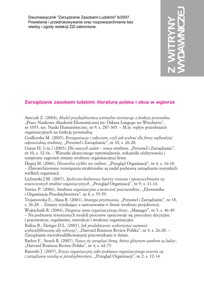 Z WITRYNY WYDAWNICZEJ Dwumiesięcznik "Zarządzanie Zasobami Ludzkimi" 6/2007. Powielanie i przedrukowywanie oraz rozpowszechnianie bez wiedzy i zgody redakcji ZZl zabronione. Zarz¹dzanie zasobami ludzkimi: literatura polska i obca w wyborze Antczak Z witryny Z. wydawniczej (2004), Model przedsiêbiorstwa wirtualno-sieciowego a funkcja personalna, Prace Naukowe Akademii Ekonomicznej im. Oskara Langego we Wroc³awiu, nr 1055, ser. Nauki Humanistyczne, nr 9, s. 287-305. M.in. wp³yw przeobra¿eñ organizacyjnych na funkcjê personaln¹. Godlewska M. (2005), Reorganizacja z sukcesem, czyli jak wybraæ dla firmy najbardziej odpowiedni¹ strukturê, Personel i Zarz¹dzanie, nr 10, s. 26-28. Guryn H. [i in.] (2005), Dla nowych zadañ nowa struktura, Personel i Zarz¹dzanie, nr 10, s. 32-36. Warunki skutecznego wprowadzenia, wskaniki efektywnoci i symptomy zagro¿eñ zmiany struktury organizacyjnej firmy. Hopej M. (2006), Hierarchia szybko nie zniknie, Przegl¹d Organizacji, nr 4, s. 16-18. Zhierarchizowane rozwi¹zania strukturalne s¹ nadal podstaw¹ zarz¹dzania wszystkich wielkich organizacji. Lichtarski J.M. (2007), Spo³eczno-kulturowe bariery rozwoju i upowszechniania siê nowoczesnych struktur organizacyjnych, Przegl¹d Organizacji, nr 9, s. 11-14. Szwiec P. (2006), Struktura organizacyjna a twórczoæ pracowników, Ekonomika i Organizacja Przedsiêbiorstwa, nr 8, s. 55-59. Trojanowska E., A³asa R. (2001), Strategia przetrwania, Personel i Zarz¹dzanie, nr 18, s. 26-28. Zmiany wynikaj¹ce z zastosowania w firmie struktury projektowej. Wojtachnik R. (2004), Diagnoza stanu organizacyjnego firmy, Manager, nr 5, s. 46-49. Na podstawie stworzonych modeli procesów opracowuje siê procedury decyzyjne i pracownicze, regulaminy, instrukcje i struktury organizacyjne. Ballou B., Heitger D.L. (2007), Jak produktywnie wykorzystaæ najmniej wykwalifikowan¹ si³ê robocz¹?, Harvard Business Review Polska, nr 4, s. 26-28. Zarz¹dzanie niewykwalifikowanymi pracownikami w firmie. Barber F., Strack R. (2007), Naucz siê zarz¹dzaæ firm¹, której g³ównym zasobem s¹ ludzie, Harvard Business Review Polska, nr 4, s. 62-75 Batorski J. (2007), Kryzys organizacyjny jako podstawa organizacyjnego uczenia siê i zarz¹dzania wiedz¹ w przedsiêbiorstwie, Przegl¹d Organizacji, nr 2, s. 12-14. 110 Z witryny wydawniczej Bendkowski J. (2007), Przes³anki tworzenia wysokiego transferu wiedzy na potrzeby zarz¹dzania rytmem zmian, Przegl¹d Organizacji, nr 7/8, s. 7-10. Ber³owski P, (2007), Czynnik ludzki: HRM podczas restrukturyzacji i transformacji BIS MainServ Sp. z o.o., Personel i Zarz¹dzanie, nr 9, s. 32-35. Bielski I., (2007), Zasoby ludzkie w kreowaniu zdolnoci konkurencyjnej przedsiêbiorstwa produkcyjnego, Zarz¹dzanie Zasobami Ludzkimi, nr 3/4, s. 72-87. Buczyñska-Bucka A., Czapski J., Kacprzyk B. (2007), Integracja przez dopasowanie: zarz¹dzanie zmian¹ w trakcie fuzji banków DnB Nord Polska SA i BISE, Personel i Zarz¹dzanie, nr 10, s. 24-27. Polityka personalna. Chom¹towska B. (2007), Wp³yw zasobów ludzkich na kszta³towanie zdolnoci adaptacyjnych systemów pracy, Zarz¹dzanie Zasobami Ludzkimi, nr 3/4, s. 43-54. Cierniak-Emerych A., Gableta M. (2007), Udzia³ pracowników sfery produkcyjnej w procesach decyzyjnych, Zarz¹dzanie Zasobami Ludzkimi, nr 3/4, s. 35-42. Deoniziak A., Sadowski T. (2007), Kszta³cenie i rozwój personelu, czyli d³ugoterminowe inwestycje w kapita³ ludzki, Euroekspert, nr 4, s. 44-51. Fazlagiæ A.J. (2007), Wiedzieæ znaczy móc: zarz¹dzanie wiedz¹ personelu kontaktowego na przyk³adzie banków, Personel i Zarz¹dzanie, nr 7, s. 15-19. Filipowicz G. (2007), Nie ma efektywnoci bez wzajemnoci: w jaki sposób usprawniæ firmê, zwiêkszaj¹c skutecznoæ jej pracowników?, Personel i Zarz¹dzanie, nr 8, s. 27-30. Guryn H. (2007), Grupa szybkiego reagowania, czyli piêæ poziomów rozwoju HRM wed³ug Johna Sullivana, Personel i Zarz¹dzanie, nr 6, s. 13-15. Guryn H. (2007), Kto nie kreuje, ten nie prze¿yje, Personel i Zarz¹dzanie, nr 8, s. 4-8. Jak odblokowaæ potencja³ innowacji tkwi¹cy w ka¿dym pracowniku? Guryn H. (2007), Matryca talentów: identyfikacja i rozwój pracowników o najwy¿szym potencjale w British Telecom studium przypadku, Personel i Zarz¹dzanie, nr 8, s. 22-26. Guryn H. (2007), Wiêcej ni¿ partner, Personel i Zarz¹dzanie, nr 6, s. 5-11, Strategiczne zarz¹dzanie kadrami. Hasiñska Z., Sipurzyñska-Rudnicka K. (2007), Zapotrzebowanie na pracowników produkcyjnych w Wa³brzyskiej Specjalnej Strefie Ekonomicznej, Zarz¹dzanie Zasobami Ludzkimi, nr 3/4, s. 9-21. Juchnowicz M., Sienkiewicz £. (2006), Jak oceniaæ pracê?: wartoæ stanowisk i kompetencji Difin, Warszawa 280 s. Jurczak J. (2006), Kapita³ intelektualny w organizacji przysz³oci, Ekonomika i Organizacja Przedsiêbiorstwa, nr 11, s. 39-47. Klimkiewicz D. (2007), W poszukiwaniu talentów, Personel i Zarz¹dzanie, nr 5, s. 38-41. Jak zdobyæ najbardziej wartociowych pracowników. Kopertyñska M.W. (2007), Motywowanie pracowników sfery produkcyjnej dowiadczenia badawcze, Zarz¹dzanie Zasobami Ludzkimi, nr 3/4, s. 23-34. Kowalczyk A., Nogalski B. (2007), Zarz¹dzanie wiedz¹: koncepcja i narzêdzia, Difin, Warszawa, 222 s. Król H., Ludwiczyñski A. (2007), Zarz¹dzanie kapita³em ludzkim a konkurencyjnoæ ma³ych i rednich przedsiêbiorstw, Zarz¹dzanie Zasobami Ludzkimi, nr 3/4, s. 88-98. Z witryny wydawniczej 111 Kunasz M. (2007), Wybrane narzêdzia pomiaru kapita³u intelektualnego, Optimum Studia Ekonomiczne, nr 2, s. 96-112. Lechowicz V., Szelerski L., Lewandowska V. (2007), Poinformowaæ, przekonaæ, wesprzeæ, Personel i Zarz¹dzanie, nr 3, s. 45-48. Dzia³ania komunikacyjne i organizacyjne w sytuacji powa¿nych zmian na przyk³adzie projektu konsolidacji funkcji logistycznych w firmie Coty Polska. Leszczyñska A., (2007), Zarz¹dzanie wiedz¹ a innowacyjnoæ przedsiêbiorstwa raport z badañ, Przegl¹d Organizacji, nr 7/8, s. 10-13. Lipka A. (2007), Nowsze metody wyceny kap