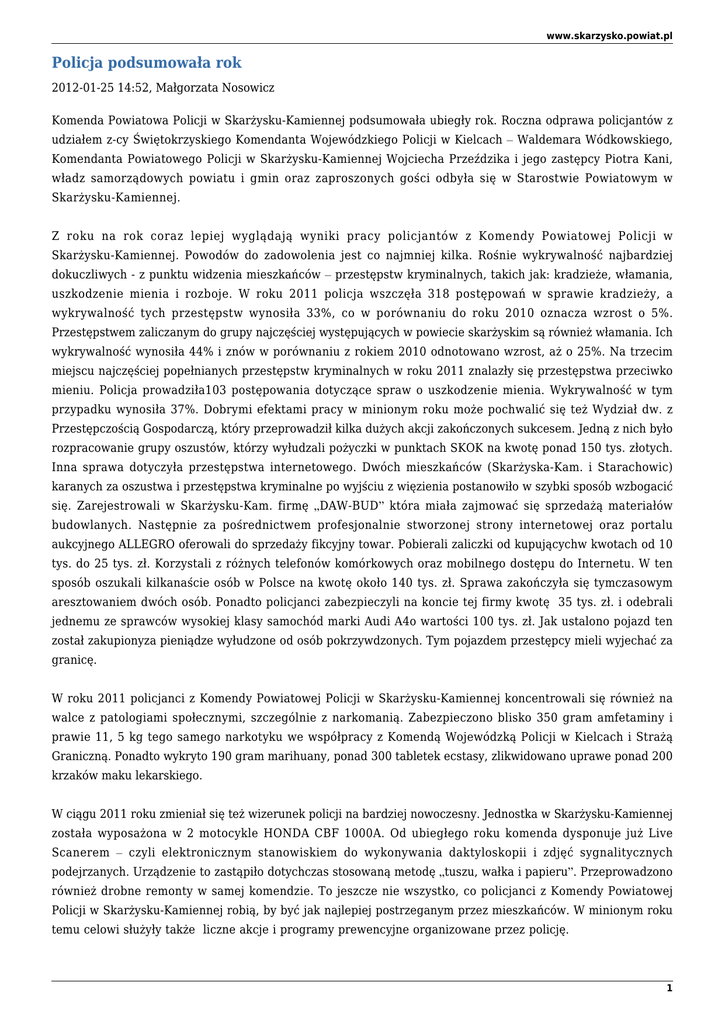 www.skarzysko.powiat.pl Policja podsumowała rok 2012-01-25 14:52, Małgorzata Nosowicz Komenda Powiatowa Policji w Skarżysku-Kamiennej podsumowała ubiegły rok. Roczna odprawa policjantów z udziałem z-cy Świętokrzyskiego Komendanta Wojewódzkiego Policji w Kielcach – Waldemara Wódkowskiego, Komendanta Powiatowego Policji w Skarżysku-Kamiennej Wojciecha Przeździka i jego zastępcy Piotra Kani, władz samorządowych powiatu i gmin oraz zaproszonych gości odbyła się w Starostwie Powiatowym w Skarżysku-Kamiennej. Z roku na rok coraz lepiej wyglądają wyniki pracy policjantów z Komendy Powiatowej Policji w Skarżysku-Kamiennej. Powodów do zadowolenia jest co najmniej kilka. Rośnie wykrywalność najbardziej dokuczliwych - z punktu widzenia mieszkańców – przestępstw kryminalnych, takich jak: kradzieże, włamania, uszkodzenie mienia i rozboje. W roku 2011 policja wszczęła 318 postępowań w sprawie kradzieży, a wykrywalność tych przestępstw wynosiła 33%, co w porównaniu do roku 2010 oznacza wzrost o 5%. Przestępstwem zaliczanym do grupy najczęściej występujących w powiecie skarżyskim są również włamania. Ich wykrywalność wynosiła 44% i znów w porównaniu z rokiem 2010 odnotowano wzrost, aż o 25%. Na trzecim miejscu najczęściej popełnianych przestępstw kryminalnych w roku 2011 znalazły się przestępstwa przeciwko mieniu. Policja prowadziła103 postępowania dotyczące spraw o uszkodzenie mienia. Wykrywalność w tym przypadku wynosiła 37%. Dobrymi efektami pracy w minionym roku może pochwalić się też Wydział dw. z Przestępczością Gospodarczą, który przeprowadził kilka dużych akcji zakończonych sukcesem. Jedną z nich było rozpracowanie grupy oszustów, którzy wyłudzali pożyczki w punktach SKOK na kwotę ponad 150 tys. złotych. Inna sprawa dotyczyła przestępstwa internetowego. Dwóch mieszkańców (Skarżyska-Kam. i Starachowic) karanych za oszustwa i przestępstwa kryminalne po wyjściu z więzienia postanowiło w szybki sposób wzbogacić się. Zarejestrowali w Skarżysku-Kam. firmę „DAW-BUD” która miała zajmować się sprzedażą materiałów budowlanych. Następnie za pośrednictwem profesjonalnie stworzonej strony internetowej oraz portalu aukcyjnego ALLEGRO oferowali do sprzedaży fikcyjny towar. Pobierali zaliczki od kupującychw kwotach od 10 tys. do 25 tys. zł. Korzystali z różnych telefonów komórkowych oraz mobilnego dostępu do Internetu. W ten sposób oszukali kilkanaście osób w Polsce na kwotę około 140 tys. zł. Sprawa zakończyła się tymczasowym aresztowaniem dwóch osób. Ponadto policjanci zabezpieczyli na koncie tej firmy kwotę 35 tys. zł. i odebrali jednemu ze sprawców wysokiej klasy samochód marki Audi A4o wartości 100 tys. zł. Jak ustalono pojazd ten został zakupionyza pieniądze wyłudzone od osób pokrzywdzonych. Tym pojazdem przestępcy mieli wyjechać za granicę. W roku 2011 policjanci z Komendy Powiatowej Policji w Skarżysku-Kamiennej koncentrowali się również na walce z patologiami społecznymi, szczególnie z narkomanią. Zabezpieczono blisko 350 gram amfetaminy i prawie 11, 5 kg tego samego narkotyku we współpracy z Komendą Wojewódzką Policji w Kielcach i Strażą Graniczną. Ponadto wykryto 190 gram marihuany, ponad 300 tabletek ecstasy, zlikwidowano uprawe ponad 200 krzaków maku lekarskiego. W ciągu 2011 roku zmieniał się też wizerunek policji na bardziej nowoczesny. Jednostka w Skarżysku-Kamiennej została wyposażona w 2 motocykle HONDA CBF 1000A. Od ubiegłego roku komenda dysponuje już Live Scanerem – czyli elektronicznym stanowiskiem do wykonywania daktyloskopii i zdjęć sygnalitycznych podejrzanych. Urządzenie to zastąpiło dotychczas stosowaną metodę „tuszu, wałka i papieru”. Przeprowadzono również drobne remonty w samej komendzie. To jeszcze nie wszystko, co policjanci z Komendy Powiatowej Policji w Skarżysku-Kamiennej robią, by być jak najlepiej postrzeganym przez mieszkańców. W minionym roku temu celowi służyły także liczne akcje i programy prewencyjne organizowane przez policję. 1 www.skarzysko.powiat.pl Nic więc dziwnego, że po wysłuchaniu podsumowania z ubiegłorocznej działalności policjantów z komendy w Skarżysku-Kamiennej, ocenę pozytywną dla całej jednostki wystawił z-ca Świętokrzyskiego Komendanta Wojewódzkiego Policji w Kielcach Waldemar Wódkowski. 2 www.skarzysko.powiat.pl 3 www.skarzysko.powiat.pl 4 www.skarzysko.powiat.pl 5 www.skarzysko.powiat.pl 6 www.skarzysko.powiat.pl 7 www.skarzysko.powiat.pl 8