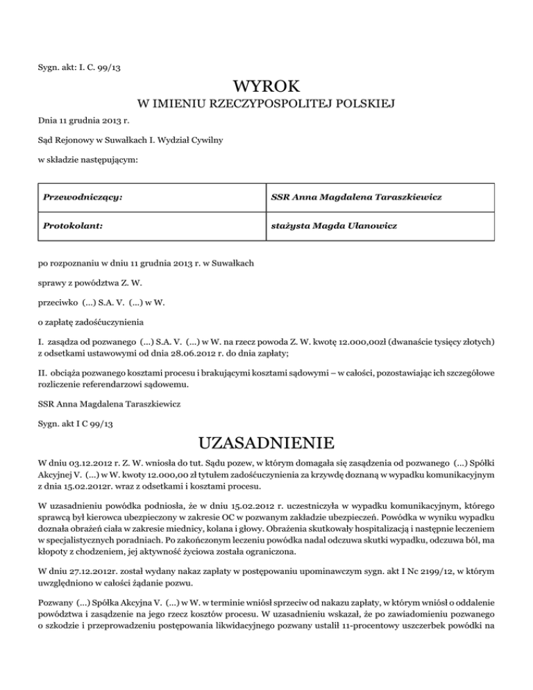 Sygn. akt: I. C. 99/13 WYROK W IMIENIU RZECZYPOSPOLITEJ POLSKIEJ Dnia 11 grudnia 2013 r. Sąd Rejonowy w Suwałkach I. Wydział Cywilny w składzie następującym: Przewodniczący: SSR Anna Magdalena Taraszkiewicz Protokolant: stażysta Magda Ułanowicz po rozpoznaniu w dniu 11 grudnia 2013 r. w Suwałkach sprawy z powództwa Z. W. przeciwko (...) S.A. V. (...) w W. o zapłatę zadośćuczynienia I. zasądza od pozwanego (...) S.A. V. (...) w W. na rzecz powoda Z. W. kwotę 12.000,00zł (dwanaście tysięcy złotych) z odsetkami ustawowymi od dnia 28.06.2012 r. do dnia zapłaty; II. obciąża pozwanego kosztami procesu i brakującymi kosztami sądowymi – w całości, pozostawiając ich szczegółowe rozliczenie referendarzowi sądowemu. SSR Anna Magdalena Taraszkiewicz Sygn. akt I C 99/13 UZASADNIENIE W dniu 03.12.2012 r. Z. W. wniosła do tut. Sądu pozew, w którym domagała się zasądzenia od pozwanego (...) Spółki Akcyjnej V. (...) w W. kwoty 12.000,00 zł tytułem zadośćuczynienia za krzywdę doznaną w wypadku komunikacyjnym z dnia 15.02.2012r. wraz z odsetkami i kosztami procesu. W uzasadnieniu powódka podniosła, że w dniu 15.02.2012 r. uczestniczyła w wypadku komunikacyjnym, którego sprawcą był kierowca ubezpieczony w zakresie OC w pozwanym zakładzie ubezpieczeń. Powódka w wyniku wypadku doznała obrażeń ciała w zakresie miednicy, kolana i głowy. Obrażenia skutkowały hospitalizacją i następnie leczeniem w specjalistycznych poradniach. Po zakończonym leczeniu powódka nadal odczuwa skutki wypadku, odczuwa ból, ma kłopoty z chodzeniem, jej aktywność życiowa została ograniczona. W dniu 27.12.2012r. został wydany nakaz zapłaty w postępowaniu upominawczym sygn. akt I Nc 2199/12, w którym uwzględniono w całości żądanie pozwu. Pozwany (...) Spółka Akcyjna V. (...) w W. w terminie wniósł sprzeciw od nakazu zapłaty, w którym wniósł o oddalenie powództwa i zasądzenie na jego rzecz kosztów procesu. W uzasadnieniu wskazał, że po zawiadomieniu pozwanego o szkodzie i przeprowadzeniu postępowania likwidacyjnego pozwany ustalił 11-procentowy uszczerbek powódki na zdrowiu i wypłacił powódce kwotę 14.000,00 zł tytułem zadośćuczynienia i 1.344,00 zł tytułem odszkodowania. Pozwany podniósł, że wypłacona powódce kwota tytułem zadośćuczynienia w pełni rekompensuje powódce cierpienia związane z wypadkiem. Żądana dodatkowo przez powódkę kwota 12.000,00 zł z tego tytułu jest zdaniem pozwanego wygórowana. Pozwany wskazał, że przy ustalaniu wysokości należnego powódce zadośćuczynienia wzięto pod uwagę rozmiar doznanej przez nią krzywdy, charakter obrażeń, długotrwałość leczenia, trwałość następstw na przyszłość itp. Sąd ustalił, co następuje: W dniu 15.02.2012r. w S. na ul. (...) doszło do wypadku drogowego w którym kierujący samochodem marki O. (...) nr rej. (...) W. D. nie zachowując należytej ostrożności zbliżając się do przejścia dla pieszych nie obserwował z wymagana starannością sytuacji drogowej w wyniku czego potrącił znajdującą się na przejściu dla pieszych Z. W. powodując u niej obrażenia ciała (okoliczności bezsporne, notatka urzędowa K. – w aktach szkody k. 76 koperta). Samochód O. (...) nr rej. (...) był ubezpieczony w zakresie odpowiedzialności cywilnej posiadaczy pojazdów mechanicznych w (...) Spółce Akcyjnej V. (...) w W. (potwierdzenie pokrycia ubezpieczeniowego - w aktach szkodowych). Z. W. w wypadku doznała obrażeń ciała w postaci: złamania kości łonowej, złamanie obu gałęzi kości łonowych, złamanie gałęzi dolnej kości kulszowej lewej, urazu głowy z raną tłuczoną okolicy czołowej, rany okolicy przedrzepkowej prawej, stłuczenia podudzia lewego (okoliczność bezsporna, dokumentacja medyczna k. 123-126, 128-134138-145, 147-150, opinia biegłego k. 178-182, 209-210 ). Bezpośrednio po zdarzeniu Z. W. została przewieziona karetką do Szpitalnego Oddziału Ratunkowego (...) Publicznego Szpitala Wojewódzkiego w S., gdzie była hospitalizowana do dnia 02.03.2012 r. na Oddziale O. – Urazowym. Po tym okresie Z. W. wypisano do domu jako leżącą z zaleceniem okresowych kontroli w (...). Przez około 1 miesiąc Z. W. była chora obłożnie. W tym czasie korzystała z pomocy i opieki osób trzecich. Następnie Z. W. rozpoczęła chodzenie przy asekuracji osób trzecich. Po upływie kolejnego miesiąca zaczęła chodzić samodzielnie. W okresie od 18.06.2012 r. do 29.06.2012 r. przebywała na leczeniu w Oddziale (...) Ośrodka (...) w S.. W wyniku zdarzenia Z. W. odniosła uszczerbek na zdrowiu w wysokości 16%, przy czym uszczerbek 3- procentowy związany był z powstaniem blizny w okolicy czołowej, uszczerbek 11-procentowy związany był ze złamaniem miednicy, zaś uszczerbek 2 procentowy związany był z uszkodzeniem głowy (dokumentacja medyczna k. 123-126, 128-134138-145, 147-150, opinia biegłego k. 178-182, 209-210, 224-226, 261-263). Obrażenia ciała Z. W. związane z wypadkiem z dnia 15.02.2012 r. spowodowały u niej bóle oraz cierpienia psychiczne. Z. W. odczuwała ból miednicy o nasileniu znacznym w okresie dwóch tygodni od wypadku. Ostre dolegliwości bólowe kolana ustąpiły po kilku dniach. Następnie dolegliwości bólowe się zmniejszały, jednakże do chwili obecnej występuje ból prawego biodra, którego ustąpienie jest wątpliwe. Z. W. nadal odczuwa bóle głowy. Przyjmuje leki przeciwbólowe. Odczuwanie bólu biodra wiąże się z trudnościami w poruszaniu się (opinia biegłego 178-182, 209-210, 224-226, 261-263, zeznania powódki k. 100v, 294v). Z. W. choruje od 1979 r. na chorobę G. B., leczy się w Poradni Chorób Tarczycy. Cierpi też na nadciśnienie tętnicze. (opinia biegłego 178-182, 209-210, 224-226, 261-263, zeznania powódki k. 100v, 294v). W dniu 09.03.2012r. Z. W. zgłosiła zakładowi ubezpieczeń sprawcy szkody jej zaistnienie, przedłożyła dokumentację medyczną dotycząca leczenia