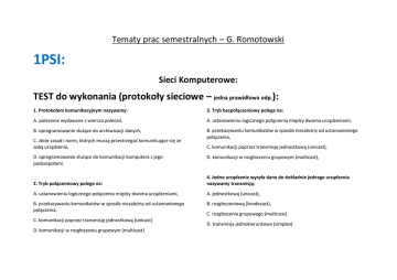 Tematy prac semestralnych – G. Romotowski 1PSI: Sieci Komputerowe: TEST do wykonania (protokoły sieciowe – jedna prawidłowa odp.): 1. Protokołem komunikacyjnym nazywamy: 3. Tryb bezpołączeniowy polega na: A. polecenie wydawane z wiersza poleceń, A. ustanowieniu logicznego połączenia między dwoma urządzeniami, B. oprogramowanie służące do archiwizacji danych, B. przekazywaniu komunikatów w sposób niezależny od ustanowionego połączenia, C. zbiór zasad i norm, których muszą przestrzegać komunikujące się ze sobą urządzenia, D. oprogramowanie służące do komunikacji komputera z jego podzespołami. C. komunikacji poprzez transmisję jednostkową (unicast), D. komunikacji w rozgłoszeniu grupowym (multicast), 2. Tryb połączeniowy polega na: 4. Jedno urządzenie wysyła dane do dokładnie jednego urządzenia nazywamy transmisją: A. ustanowieniu logicznego połączenia między dwoma urządzeniami, A. jednostkową (unicast), B. przekazywaniu komunikatów w sposób niezależny od ustanowionego połączenia, B. rozgłoszeniową (brodecast), C. komunikacji poprzez transmisję jednostkową (unicast) D. komunikacji w rozgłoszeniu grupowym (multicast) C. rozgłoszenia grupowego (multicast) D. transmisja jednokierunkowa (simplex) 5. Transmisja rozgłoszeniową jest transmisja w której: A. wiele urządzeń wysyła informacje do jednego urządzenia B. dane wysyłane przeznaczone są tylko do wybranej grupy urządzeń C. jedno urządzenie wysyła dane do dokładnie jednego urządzenia D. urządzenie nadawcze może wysłać informacje do wszystkich dostępnych urządzeń. 6. Transmisja rozgłoszenia grupowego (multicast) to transmisja w której: D. transmisją, w której jedno urządzenie wysyła dane do dokładnie jednego urządzenia. 8. Transmisją jednoczesna i dwukierunkowa nazywamy: A. simplex, B. half-duplex, C. multicast, D. full-duplex. A. wiele urządzeń wysyła informacje do jednego urządzenia 9. Transmisję dwukierunkową, naprzemienną (urządzenie może albo nadawać, albo odbierać informacje) nazywamy: B. dane wysyłane przeznaczone są tylko do wybranej grupy urządzeń A. half-duplex, C. jedno urządzenie wysyła dane do dokładnie jednego urządzenia D. urządzenie nadawcze może wysłać informacje do wszystkich dostępnych urządzeń. B. full-duplex, C. simplex, D. brodecast. 7. Transmisja jednokierunkowa (simplex) nazywamy: 10. Ile warstw zawiera w sobie model OSI: A. transmisją, w której wymiana informacji jest jednoczesna (w tym samym czasie), A. 4, B. transmisją, w której urządzenie może albo nadawać, albo odbierać informacje, C. 6, C. transmisją, w której odbiornik nie może przesłać odpowiedzi ani innych danych, B. 5, D. 7. 11. Warstwa ta świadczy usługi końcowe dla oprogramowania użytkownika: 14. Warstwa ta dzieli dane na segmenty, które są kolejno numerowane i wysyłane do stacji docelowej: A. warstwa prezentacji, A. warstwa transportowa, B. warstwa aplikacji, B. warstwa sesji, C. warstwa sieciowa, C. warstwa prezentacji, D. warstwa sesji. D. warstwa sieciowa. 12. Zadaniem tej warstwy jest przetworzenie danych pochodzących z warstwy aplikacji do warstw niższych, oraz danych pochodzących z warstw niższych do warstwy aplikacji. 15. Warstwa ta rozpoznaje jakie trasy łączą poszczególne komputery i sieci i na taj podstawie decyduje, którą z nich wybrać: A. warstwa transportowa, B. warstwa prezentacji, C. warstwa sieciowa, A. warstwa transportowa, B. warstwa sesji, C. warstwa łącza danych, D. warstwa sieciowa. D. warstwa fizyczna. 16. do zaadresowania pakietu w sieci potrzebne są dane: 13. warstwa sesji odpowiada za: A. nadzór warstwy fizycznej i steruje fizyczną wymianą bitów B. podział danych na segmenty, numerowanie i wysłanie do stacji docelowej, C. świadczenie usług końcowych dla oprogramowania użytkownika, D. zarządzanie przebiegiem komunikacji podczas połączenia między dwoma komputerami. A. adres MAC nadawcy i odbiorcy, B. adres IP nadawcy i odbiorcy, C. adres DNS, D. adres bramy urządzenia udostępniającego połączenie sieciowe. 17. do zaadresowania ramki w sieci potrzebne są dane: 19. Router nazywamy urządzeniem: A. adres MAC nadawcy i odbiorcy, A. warstwy 2, B. adres IP nadawcy i odbiorcy, B. warstwy 3, C. adres DNS, C. warstwy 4, D. adres bramy urządzenia udostępniającego połączenie sieciowe. D warstwy 5. 18. Proces wysyłania informacji i przesyłania danych do niższych warstw nazywamy: 20. Przełącznik (switch), most i karta sieciowa są urządzeniami: A. dekapsulacja, B. information down, C. enkapsulacja, A. warstwy 1, B. warstwy 2, C. warstwy 3, D warstwy 4. D. information up. 21. Koncentrator (hub) jest urządzeniem: A. warstwy 1, 18. Proces odbierania informacji i przesyłania danych do górnych warstw nazywamy: B. warstwy 2, A. dekapsulacja, C. warstwy 3, B. information down, D warstwy 4. C. enkapsulacja, D. information up. 22. Model TCP/IP składa się z: A. 3 warstw, B. 4 warstw, D. prowadzenie telekonferencji poprzez Internet. C. 5 warstw, D. 6 warstw. 23. Warstwa ta w modelu TCP/IP obejmuje funkcje trzech najwyższych warstw modelu OSI (aplikacji prezentacji i sesji). 26. Proces wyznaczania najlepszej trasy przesłania pakietów do miejsca przeznaczenia nazywamy: A. modelem TCP/IP B. dns A. warstwa transportowa, C. ping B. warstwa aplikacji, D. trasowanie lub routing C. warstwa Internetu, D. warstwa dostępu do sieci. 27. Protokół DNS odpowiedzialny jest za: A. połączenie klienta z odległym serwerem za pomocą wiersza poleceń, 24. Protokół SMTP odpowiedzialny jest za: B. komunikację między dwoma komputerami, A. połączenie klienta z odległym serwerem za pomocą wiersza poleceń, C. zamianę adresów IP (212.77.100.101) na adresy domenowe (www.wp.pl), B. komunikację między dwoma komputerami, C. odbieranie poczty elektronicznej, D. automatyczne przydzielanie adresów IP. D. wysłanie poczty elektronicznej. 28. Protokół DHCP odpowiedzialny jest za: 25. Prot