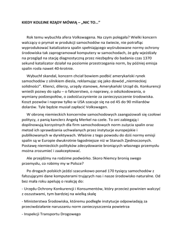 KIEDY KOLEJNE RZĄDY MÓWIĄ – „NIC TO…” Rok temu wybuchła afera Volkswagena. Na czym polegała? Wielki koncern walczący o prymat w produkcji samochodów na świecie, nie potrafiąc wyprodukować katalizatora spalin spełniającego wyśrubowane normy ochrony środowiska tak zaprogramował komputery w samochodach, że gdy wjeżdżały na przegląd na stację diagnostyczną przez niezbędny do badania czas 1370 sekund katalizator działał na poziomie przestrzegania norm, by później emisja spalin rosła nawet 40-krotnie. Wybuchł skandal, koncern chciał bowiem podbić amerykański rynek samochodów z silnikiem diesla, reklamując się jako dowód „niemieckiej solidności”. Klienci, dilerzy, urzędy stanowe, Amerykański Urząd ds. Konkurencji wnieśli pozwy do sądu – o fałszerstwo, o naprawy, o odszkodowania, o wymiany podzespołów, o zadośćuczynienie za zanieczyszczenie środowiska. Koszt pozwów i napraw tylko w USA szacuje się na od 45 do 90 miliardów dolarów. Tyle będzie musiał zapłacić Volkswagen. W obronę niemieckich koncernów samochodowych zaangażowali się czołowi politycy, z panią kanclerz Angelą Merkel na czele. To oni zabiegają i dopilnowują korzystnych dla firm samochodowych norm zużycia spalin oraz metod ich sprawdzania uchwalanych przez instytucje europejskie i publikowanych w dyrektywach. Właśnie z tego powodu do dziś normy emisji spalin są w Europie dwukrotnie łagodniejsze niż w Stanach Zjednoczonych. Postawę niemieckich polityków zdecydowanie broniących własnego przemysłu można zrozumieć i zaakceptować. Ale przejdźmy na rodzime podwórko. Skoro Niemcy bronią swego przemysłu, co robimy my w Polsce? Po drogach polskich jeździ szacunkowo ponad 170 tysięcy samochodów z fałszującymi dane komputerami trujących nas i nasze środowisko naturalne. Od bez mała roku apeluję o reakcję do: - Urzędu Ochrony Konkurencji i Konsumentów, który przecież powinien walczyć z oszustwami, tym bardziej na wielką skalę - Ministerstwa Środowiska, któremu podległe instytucje odpowiadają za przeciwdziałanie naruszaniu norm zanieczyszczenia powietrza - Inspekcji Transportu Drogowego Mówiąc krótko, pytam urzędy, instytucje, ministerstwa specjalnie powołane i opłacane z naszych podatków do interweniowania w sprawach dotyczących ochrony środowiska. Zatrudniają one przecież tysiące pracowników, jako cel mają wyznaczoną obronę polskiego konsumenta, polskiego państwa, naszej przyrody. Dla przykładu podam, że UOKiK zatrudnia około 500 osób i ma budżet przekraczający 66 milionów złotych. Otóż od bez mała roku wszystkie wyżej wymienione instytucje milczą i nie podjęły żadnych skutecznych działań w sprawie afery VW. Oto fakt mówiący jednoznacznie, jak rozumieją one obronę polskiego interesu na wszystkich płaszczyznach. Czego to dowodzi? Po pierwsze skali infiltracji najważniejszych urzędów, instytucji, ministerstw przez lobby firm zagranicznych. Dodajmy – zmieniają się rządy, ale nie polityka wobec kapitału zagranicznego. Po drugie dowodzi to strachu urzędników przed podjęciem działań naruszających interesy „możnych” oraz ich poczucia bezsilności. A na koniec potwierdza to, że przeświadczenie o bezkarności i dominacji zagranicznych firm, instytucji, lobby w Polsce, które uznają, że „tu mogą wszystko” jest słuszne. Można nas traktować jako sługę i podnóżek. Potwierdzeniem tej tezy niech będą fakty związane z działalnością Volkswagena w Polsce. Firma za poprzednich rządów zawarła bardzo korzystną umowę na budowę zakładu we Wrześni koło Poznania. Otrzymała wieloletnie zwolnienie podatkowe (czy ktoś z polskich przedsiębiorców może o czymś takim marzyć?). Dodatkowym „smaczkiem” jest fakt, o którym ani poprzedni, ani obecny rząd wolą milczeć, że państwo polskie zobowiązało się wydatkować dodatkową kwotę, wielu milionów złotych (nikt nie chce ujawnić ile) na edukację miejscowej ludności w zakresie kultury niemieckiej, naukę języka, poznanie osobowości i tożsamości niemieckiej. Mnie pozostaje tylko dodać, że wszystko to dzieje się we Wrześni, która w historii Polski zapisała się jako miasto, gdzie dzieci polskie odmówiły nauki religii z niemieckiego katechizmu i zażądały polskiego. Oto jak my potrafimy wykpić bohaterów własnej historii, sami mając gębę pełną bogoojczyźnianych frazesów. Ale to nie koniec zawirowań wokół koncernu VW w Polsce. Dowodem, że czuje się on u nas jak u siebie, a ja śmiem twierdzić, że nawet lepiej, bo całkowicie bezkarnie ,jest fakt zamiaru budowy koło Wrześni hotelu. Zgadnijcie Państwo dla kogo? Otóż dla sprowadzanych według zamierzeń do Polski robotników-imigrantów. Mają być oni tańsi od Polaków, których i tak koncern nie zatrudnia a zlecił to firmie pośredniczącej, bo nie chce mieć kłopotów z personelem i związkami zawodowymi. Jak widać, tu gdzie konkrety, pieniądze, interesy nasi urzędnicy i politycy z bożej łaski, tchórzem i korupcją podszyci nawet „walecznego słowa” nie potrafią wypowiedzieć, a co dopiero konsekwentnie bronić naszego interesu. I dlatego cieszę się, że w Poznaniu organizuje się środowisko właścicieli samochodów z wadliwym katalizatorem firmy VW. Niech wystąpią z roszczeniami prywatnymi przeciw VW, bo ich skala może sięgnąć 10 miliardów złotych. Dlatego proszę rządzących – jeśli nie potraficie pomóc, to chociaż nie przeszkadzajcie. Inicjatorom zaś życzę – zorganizujcie się po poznańsku, uczciwie i sprawnie, nie dajcie się rozbić „od środka” przez „życzliwych”, bo takie próby Was spotkają. A ja ściskam Wam prawicę i trzymam za Was kciuki.