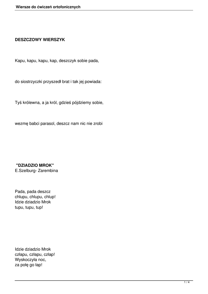 Wiersze do ćwiczeń ortofonicznych DESZCZOWY WIERSZYK Kapu, kapu, kapu, kap, deszczyk sobie pada, do siostrzyczki przyszedł brat i tak jej powiada: Tyś królewna, a ja król, gdzieś pójdziemy sobie, wezmę babci parasol, deszcz nam nic nie zrobi "DZIADZIO MROK" E.Szelburg- Zarembina Pada, pada deszcz chlupu, chlupu, chlup! Idzie dziadzio Mrok tupu, tupu, tup! Idzie dziadzio Mrok człapu, człapu, człap! Wyskoczyła noc, za połę go łap! 1/4 Wiersze do ćwiczeń ortofonicznych Zmyka dziadzio Mrok tupu, tupu, tup! A noc za nim brnie chlupu, chlupu, chlup! SZUMIĄCA PRZYRODA Szumi, szumi wietrzyk – szszsz.. Szumi, szumi deszczyk – szszsz... Szumią, szumią drzewa – szszsz... Wiosna (lato, jesień, zima) wita nas! Szumi, szumi woda – szszsz... Szumi, szumi las – szszsz... Szumią, szumią pola – szszsz... Wiosna wita nas! DWIE MUSZKI E. Zarembina Jedna muszka – czarna muszka, 2/4 Wiersze do ćwiczeń ortofonicznych druga Muszka – biała. Czarna muszka białej Muszce spać dziś nie dawała. A sio, nie brzęcz, czarna muszko, biała Muszka chora. Nie posłuchasz? To przyniosę z lasu muchomora. (ćwiczenie mięśni języka na głosce "sz") JEDZIE POCIĄG Jedzie pociąg fu, fu, fu Trąbi trąbka tru, tu, tu 3/4 Wiersze do ćwiczeń ortofonicznych A bębenek bum, bum, bum Na to żabki kum, kum, kum Konik człapie człap, człap, człap Woda bzyczy bzy, bzy, bzy A wąż syczy sy, sy, sy Baran beczy be, be, be A owieczka me, me, me (Dzieci próbują naśladować odgłosy). 4/4