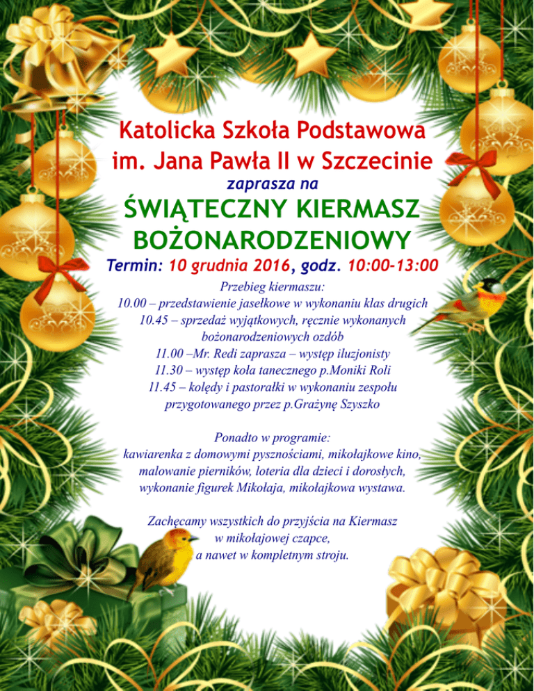 Katolicka Szkoła Podstawowa im. Jana Pawła II w Szczecinie zaprasza na ŚWIĄTECZNY KIERMASZ BOŻONARODZENIOWY Termin: 10 grudnia 2016, godz. 10:00-13:00 Przebieg kiermaszu: 10.00 – przedstawienie jasełkowe w wykonaniu klas drugich 10.45 – sprzedaż wyjątkowych, ręcznie wykonanych bożonarodzeniowych ozdób 11.00 –Mr. Redi zaprasza – występ iluzjonisty 11.30 – występ koła tanecznego p.Moniki Roli 11.45 – kolędy i pastorałki w wykonaniu zespołu przygotowanego przez p.Grażynę Szyszko Ponadto w programie: kawiarenka z domowymi pysznościami, mikołajkowe kino, malowanie pierników, loteria dla dzieci i dorosłych, wykonanie figurek Mikołaja, mikołajkowa wystawa. Zachęcamy wszystkich do przyjścia na Kiermasz w mikołajowej czapce, a nawet w kompletnym stroju.
