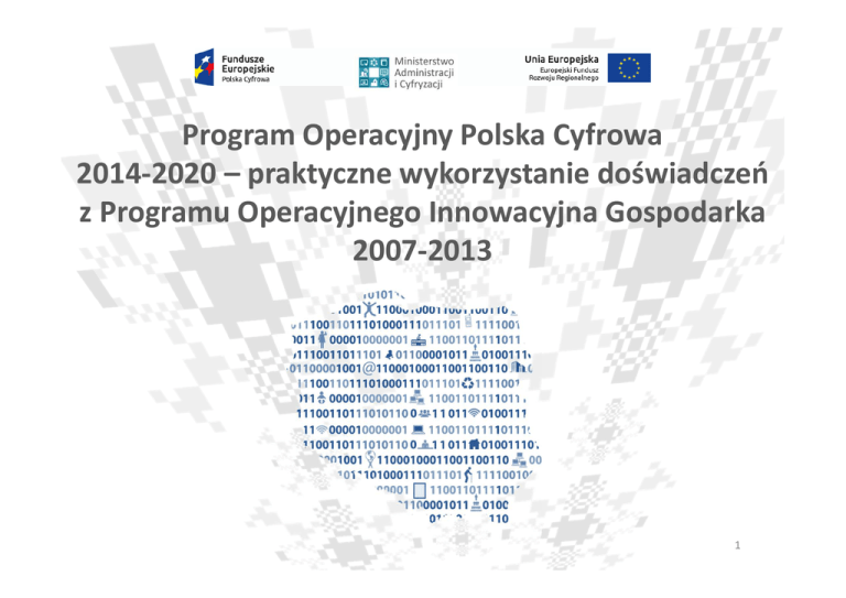Program Operacyjny Polska Cyfrowa 2014-2020 – praktyczne wykorzystanie doświadczeń z Programu Operacyjnego Innowacyjna Gospodarka 2007-2013 1 Cel główny Programu Operacyjnego Polska Cyfrowa (PO PC) Wzmocnienie cyfrowych fundamentów dla rozwoju kraju Główne cele Programu to: szeroki dostęp do internetu, efektywne i przyjazne użytkownikom e-usługi publiczne, stale rosnący poziom kompetencji cyfrowych społeczeństwa. 2 Cele PO PC Oś II e-administracja i otwarty rząd 2 Wysoka dostępność i jakość e-usług publicznych 3 Cyfryzacja procesów back-office Alokacja 949,60 mln euro w administracji rządowej 4 Cyfrowa dostępność 1 i użyteczność informacji sektora publicznego Wyeliminowanie terytorialnych różnic w możliwości dostępu do szerokopasmowego internetu o wysokich przepustowościach Oś I Powszechny dostęp do szybkiego internetu Alokacja 1 020,22 mln euro Oś III cyfrowa aktywizacja społeczeństwa 5 Alokacja 145,00 mln euro Zwiększenie stopnia oraz poprawa umiejętności korzystania z internetu, w tym e-usług publicznych 3 Oś I - Powszechny dostęp do szybkiego internetu Celem osi jest zmniejszenie różnic w dostępie do szerokopasmowego internetu oraz dalszy rozwój i uzupełnienie istniejących sieci dostępowych, szkieletowych i dystrybucyjnych. Punktem wyjścia dla określenia obszarów wsparcia będą m.in. wyniki inwentaryzacji infrastruktury telekomunikacyjnej (Prezesa Urzędu Komunikacji Elektronicznej). Beneficjenci realizujący projekty to: przedsiębiorcy telekomunikacyjni lub jednostki samorządu terytorialnego oraz ich związki i stowarzyszenia (gdy przedsiębiorcy telekomunikacyjni nie będą zainteresowani realizacją inwestycji na danym terenie). 4 Oś II – E-administracja i otwarty rząd Celem osi jest rozwój i udostępnianie usług elektronicznych, informacji sektora publicznego (ISP), jak również umożliwienie ich ponownego wykorzystania. Dzięki temu możliwe będzie zapewnienie lepszej jakości usług publicznych, zwiększenie stopnia przejrzystości funkcjonowania administracji oraz zapewnienie otwartego kontaktu z obywatelami i przedsiębiorcami. Beneficjentami realizującymi projektu będą przede wszystkim jednostki administracji rządowej oraz jednostki im podległe lub przez nie nadzorowane. W ramach osi będą rozwijane e-usługi w projektach, których realizację rozpoczęto w ramach Programu Operacyjnego Innowacyjna Gospodarka. Przewiduje się kontynuację projektów w szczególności w obszarach związanych z poprawą warunków prowadzenia działalności gospodarczej, podatków i ceł, ochrony zdrowia czy sądownictwa. 5 Oś III – Cyfrowe kompetencje społeczeństwa Celem osi jest zwiększenie aktywności i jakości korzystania z internetu przez obywateli, których wiedza w tym zakresie jest obecnie na bardzo różnym poziomie. Działania będą miały zatem charakter głównie szkoleniowo-doradczy oraz edukacyjno-informacyjny ukierunkowany na rozwój kompetencji cyfrowych. Głównymi beneficjentami będą: organizacje pozarządowe, instytucje publiczne z obszaru nauki, edukacji, kultury oraz szkoły wyższe, jednostki samorządu terytorialnego. III Oś stanowi rozwinięcie Działania 8.3 PO IG - Przeciwdziałanie wykluczeniu cyfrowemu – e-Inclusion. 6 Harmonogram naborów konkursowych Działanie 1.1 Wyeliminowanie terytorialnych różnic w możliwości dostępu do szerokopasmowego internetu o wysokich przepustowościach – 30.09.br. ogłoszono konkurs – nabór projektów będzie trwał od 2.11.2015 r. do 30.12.2015 r. Działanie 2.1 Wysoka dostępność i jakość e-usług publicznych - pierwszy konkurs został ogłoszony 30 grudnia 2014 r. (w ramach konkursu złożono 39 wniosków o dofinansowanie – obecnie trwa ocena merytoryczna), ogłoszenie kolejnego konkurs planowane jest na IV kw. 2015 r. Działanie 2.2 Cyfryzacja procesów back-office w administracji rządowej - IV kw. 2015 r. Poddziałanie 2.3.1 Cyfrowe udostępnienie informacji sektora publicznego ze źródeł administracyjnych i zasobów nauki – 28 sierpnia br. ogłoszono konkurs – nabór będzie trwał od 30.09.2015 do 29.02.2016 r. Poddziałanie 2.3.2 Cyfrowe udostępnienie zasobów kultury 28.08.br ogłoszono konkurs – nabór będzie trwał 30.09.2015 r. do 29.01.2016 r. – Działanie 2.4 Tworzenie usług i aplikacji wykorzystujących e-usługi publiczne i informacje sektora publicznego – 2016 r. Działanie 3.1 Działania szkoleniowe na rzecz rozwoju kompetencji cyfrowych – 30.09.br. ogłoszono konkurs – nabór będzie trwał od 2.11.2015 r. do 2.02.2016 r. 7 Doświadczenia z perspektywy 2007-2013 – wdrożono następujące rozwiązania koncentracja interwencji w zakresie krajowych e-usług publicznych w jednym krajowym programie - kompleksowe i strategiczne podejście do rozwoju technologii informacyjnokomunikacyjnych (TIK); oparcie planu inwestycji na PZIP, co pozwoliło na odpowiednio wczesne zdefiniowanie projektów o priorytetowym charakterze; objęcie projektów skoordynowanym wsparciem doradczym już na etapie przygotowania; ujęcie planowanych inwestycji w Wieloletnim Planie Finansowym państwa, szacowanie kosztów funkcjonowania systemu i wymaganych szkoleń dla użytkowników już na etapie przygotowania projektu, wraz z uwzględnieniem wymiernych korzyści finansowych wynikających z wprowadzenia do użytkowania; zapewnienie mechanizmów współpracy w wyborze projektów między systemem realizacji POPC a instytucjami zarządzającymi RPO (powołanie przy Ministrze Administracji i Cyfryzacji Zespołu ds. koordynacji działań w obszarze e-administracji, udostępniania informacji sektora publicznego oraz rozwoju kompetencji cyfrowych; 8 Doświadczenia z perspektywy 2007-2013 – wdrożono następujące rozwiązania zapewnienie odpowiednich kryteriów wyboru projektów, odnoszących się m.in. do dokonania ex-ante analizy niezbędnych zmian prawnych oraz wykazania przez beneficjenta powiązań miedzy wdrażanymi rozwiązan