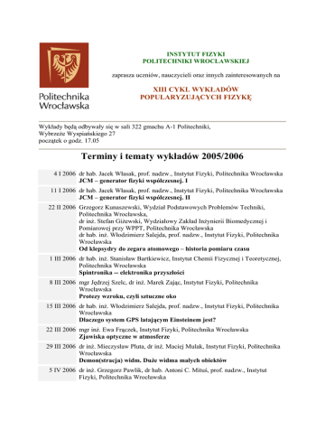 Terminy i tematy wykładów 2005/2006 - Instytut Fizyki