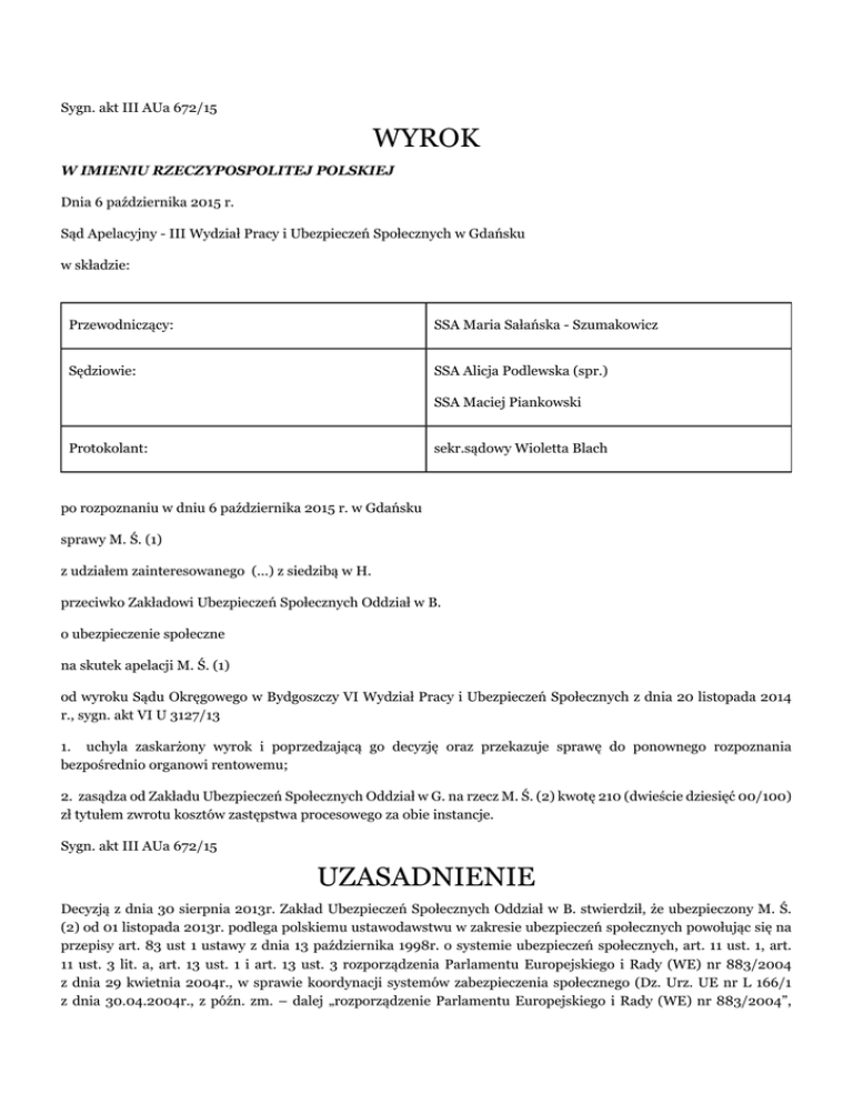 Sygn. akt III AUa 672/15 WYROK W IMIENIU RZECZYPOSPOLITEJ POLSKIEJ Dnia 6 października 2015 r. Sąd Apelacyjny - III Wydział Pracy i Ubezpieczeń Społecznych w Gdańsku w składzie: Przewodniczący: SSA Maria Sałańska - Szumakowicz Sędziowie: SSA Alicja Podlewska (spr.) SSA Maciej Piankowski Protokolant: sekr.sądowy Wioletta Blach po rozpoznaniu w dniu 6 października 2015 r. w Gdańsku sprawy M. Ś. (1) z udziałem zainteresowanego (...) z siedzibą w H. przeciwko Zakładowi Ubezpieczeń Społecznych Oddział w B. o ubezpieczenie społeczne na skutek apelacji M. Ś. (1) od wyroku Sądu Okręgowego w Bydgoszczy VI Wydział Pracy i Ubezpieczeń Społecznych z dnia 20 listopada 2014 r., sygn. akt VI U 3127/13 1. uchyla zaskarżony wyrok i poprzedzającą go decyzję oraz przekazuje sprawę do ponownego rozpoznania bezpośrednio organowi rentowemu; 2. zasądza od Zakładu Ubezpieczeń Społecznych Oddział w G. na rzecz M. Ś. (2) kwotę 210 (dwieście dziesięć 00/100) zł tytułem zwrotu kosztów zastępstwa procesowego za obie instancje. Sygn. akt III AUa 672/15 UZASADNIENIE Decyzją z dnia 30 sierpnia 2013r. Zakład Ubezpieczeń Społecznych Oddział w B. stwierdził, że ubezpieczony M. Ś. (2) od 01 listopada 2013r. podlega polskiemu ustawodawstwu w zakresie ubezpieczeń społecznych powołując się na przepisy art. 83 ust 1 ustawy z dnia 13 października 1998r. o systemie ubezpieczeń społecznych, art. 11 ust. 1, art. 11 ust. 3 lit. a, art. 13 ust. 1 i art. 13 ust. 3 rozporządzenia Parlamentu Europejskiego i Rady (WE) nr 883/2004 z dnia 29 kwietnia 2004r., w sprawie koordynacji systemów zabezpieczenia społecznego (Dz. Urz. UE nr L 166/1 z dnia 30.04.2004r., z późn. zm. – dalej „rozporządzenie Parlamentu Europejskiego i Rady (WE) nr 883/2004”, „rozporządzenie podstawowe”), art. 14 ust. 5 lit. b i art. 16 ust. 2 i 3 rozporządzenia Parlamentu Europejskiego i Rady (WE) nr 987/2009 z dnia 16 września 2009r., dotyczącego wykonywania rozporządzenia (WE) nr 883/2004 w sprawie koordynacji systemów ubezpieczenia społecznego (Dz. Urz. UE nr L 284/1 z dnia 30.10.2009r. – dalej: „rozporządzenie Parlamentu Europejskiego i Rady (WE) nr 883/2004”, „rozporządzenie wykonawcze”). W uzasadnieniu decyzji Zakład wyjaśnił, iż zgodnie z art. 13 ust. 3 rozporządzenia Parlamentu Europejskiego i Rady (WE) nr 883/2004, osoba, która normalnie wykonuje pracę najemną i pracę na własny rachunek w różnych Państwach Członkowskich podlega ustawodawstwu Państwa Członkowskiego, w którym wykonuje pracę najemną lub, jeżeli wykonuje taką pracę w dwóch lub kilku Państwach Członkowskich, ustawodawstwu określonemu zgodnie z przepisami art. 13 ust. 1 ww. rozporządzenia, co oznacza, iż taka osoba podlega alternatywnie: ustawodawstwu państwa członkowskiego, w którym ma miejsce zamieszkania, jeżeli wykonuje znaczną część pracy w tym państwie członkowskim; jeżeli nie wykonuje znacznej części pracy w państwie członkowskim, w którym ma miejsce zamieszkania – ustawodawstwu państwa członkowskiego, w którym znajduje się siedziba lub miejsce wykonywania działalności przedsiębiorstwa lub pracodawcy, jeżeli osoba zatrudniona jest przez jedno przedsiębiorstwo lub jednego pracodawcę. Pozwany stwierdził jednakże, że praca ubezpieczonego na terenie Czech oraz Słowacji na rzecz firmy posiadającej siedzibę w B. (a w późniejszym okresie w H.), miała charakter pracy marginalnej w rozumieniu art. 14 ust. 5 lit. b rozporządzenia Parlamentu Europejskiego i Rady (WE) nr 987/2009, zatem nie powinna być brana pod uwagę do celów określenia mającego zastosowanie ustawodawstwa na mocy art. 13 rozporządzenia podstawowego. Dodatkowo organ rentowy wskazał, iż powiadomione w trybie art. 16 ust 2 rozporządzenia Parlamentu Europejskiego i Rady (WE) nr 987/2009, instytucje ds. ubezpieczeń społecznych z Niemiec, Czech oraz Słowacji nie wniosły zastrzeżeń do ustalonego przez Oddział ZUS w B. ustawodawstwa polskiego, jako właściwego. Odwołanie od powyższej decyzji wywiódł M. Ś. (1) zarzucając: 1. Naruszenie art. 13 ust. 3 w zw. z art. 13 ust. 1 lit. b (i) rozporządzenia Parlamentu Europejskiego i Rady (WE) nr 883/2004, poprzez brak jego zastosowania oraz uznania, że jako pracownik niemieckiego pracodawcy (...) tymczasowo podlegał ustawodawstwu niemieckiemu w zakresie ubezpieczeń społecznych; 2. Naruszenie art. 14 ust. 5b rozporządzenia Parlamentu Europejskiego i Rady (WE) nr 987/2009 poprzez jego zastosowanie i błędne uznanie, iż praca M. Ś. (1) na rzecz (...) stanowiła pracę o charakterze marginalnym, i jako taka nie była brana pod uwagę do celów określenia mającego zastosowanie ustawodawstwa na mocy art. 13 rozporządzenia podstawowego. Skarżący wnosił o zmianę decyzji ZUS poprzez uznanie, iż na podstawi art. 13 ust. 3 w zw. z art. 13 ust. 1 lit b (i) rozporządzenia podstawowego w związku z art. 16 rozporządzenia wykonawczego, będąc pracownikiem najemnym tymczasowo, od dnia zawarcia umowy o pracę, podlegał ustawodawstwu niemieckiemu, jako właściwemu ze względu na siedzibę zatrudniającego. Sąd Okręgowy w Bydgoszczy VI Wydział Pracy i Ubezpieczeń Społecznych wyrokiem z dnia 20 listopada 2014 roku w sprawie VI U 3127/13 odwołanie M. Ś. (1) oddalił, przyjmując za podstawę rozstrzygnięcia następujące ustalenia i rozważania. Ubezpieczony M. Ś. (1) od dnia 8 listopada 2010r., prowadził pod firmą (...) pozarolniczą działalność gospodarczą, której przedmiotem były: działalność fotograficzna (działalność główna), transport drogowy towarów, pozostała działalność usługowa, gdzie indziej nieklasyfikowana, sprzedaż detaliczna pozostałych nowych wyrobów prowadzona w wyspecjalizowanych sklepach, działalność agencji reklamowych oraz wykonywanie fotokopii, przygotowywanie dokumentów i pozostałą specjalistyczna działalność związana z prowadzeniem biura. W dniu 1 lis