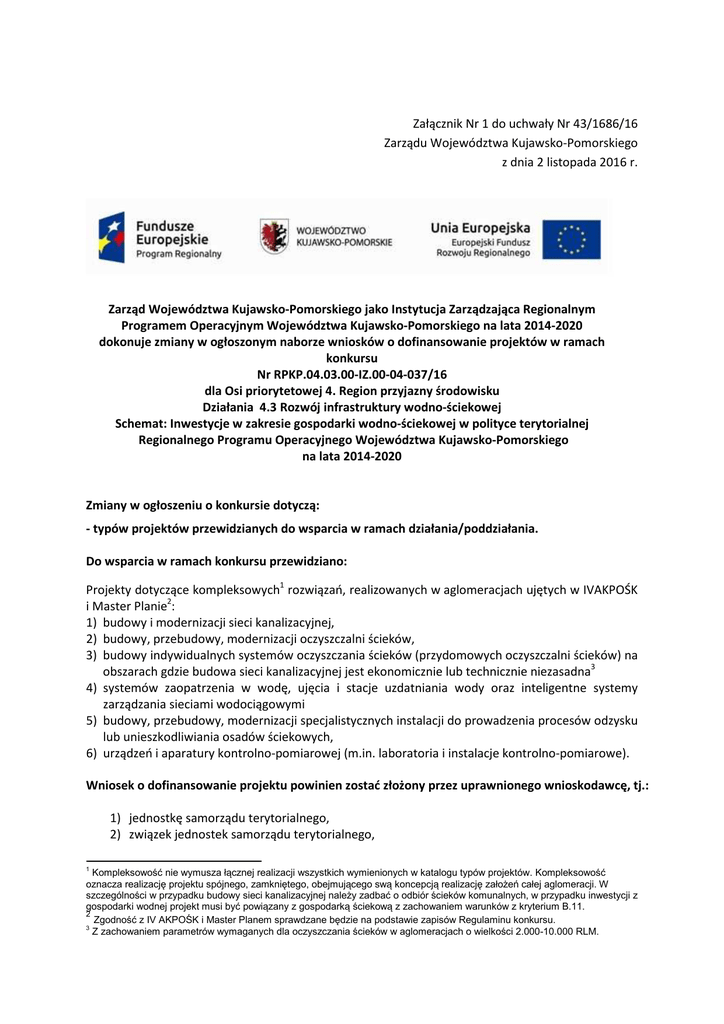 Załącznik Nr 1 do uchwały Nr 43/1686/16 Zarządu Województwa Kujawsko-Pomorskiego z dnia 2 listopada 2016 r. Zarząd Województwa Kujawsko-Pomorskiego jako Instytucja Zarządzająca Regionalnym Programem Operacyjnym Województwa Kujawsko-Pomorskiego na lata 2014-2020 dokonuje zmiany w ogłoszonym naborze wniosków o dofinansowanie projektów w ramach konkursu Nr RPKP.04.03.00-IZ.00-04-037/16 dla Osi priorytetowej 4. Region przyjazny środowisku Działania 4.3 Rozwój infrastruktury wodno-ściekowej Schemat: Inwestycje w zakresie gospodarki wodno-ściekowej w polityce terytorialnej Regionalnego Programu Operacyjnego Województwa Kujawsko-Pomorskiego na lata 2014-2020 Zmiany w ogłoszeniu o konkursie dotyczą: - typów projektów przewidzianych do wsparcia w ramach działania/poddziałania. Do wsparcia w ramach konkursu przewidziano: Projekty dotyczące kompleksowych1 rozwiązań, realizowanych w aglomeracjach ujętych w IVAKPOŚK i Master Planie2: 1) budowy i modernizacji sieci kanalizacyjnej, 2) budowy, przebudowy, modernizacji oczyszczalni ścieków, 3) budowy indywidualnych systemów oczyszczania ścieków (przydomowych oczyszczalni ścieków) na obszarach gdzie budowa sieci kanalizacyjnej jest ekonomicznie lub technicznie niezasadna3 4) systemów zaopatrzenia w wodę, ujęcia i stacje uzdatniania wody oraz inteligentne systemy zarządzania sieciami wodociągowymi 5) budowy, przebudowy, modernizacji specjalistycznych instalacji do prowadzenia procesów odzysku lub unieszkodliwiania osadów ściekowych, 6) urządzeń i aparatury kontrolno-pomiarowej (m.in. laboratoria i instalacje kontrolno-pomiarowe). Wniosek o dofinansowanie projektu powinien zostać złożony przez uprawnionego wnioskodawcę, tj.: 1) jednostkę samorządu terytorialnego, 2) związek jednostek samorządu terytorialnego, 1 Kompleksowość nie wymusza łącznej realizacji wszystkich wymienionych w katalogu typów projektów. Kompleksowość oznacza realizację projektu spójnego, zamkniętego, obejmującego swą koncepcją realizację założeń całej aglomeracji. W szczególności w przypadku budowy sieci kanalizacyjnej należy zadbać o odbiór ścieków komunalnych, w przypadku inwestycji z gospodarki wodnej projekt musi być powiązany z gospodarką ściekową z zachowaniem warunków z kryterium B.11. 2 Zgodność z IV AKPOŚK i Master Planem sprawdzane będzie na podstawie zapisów Regulaminu konkursu. 3 Z zachowaniem parametrów wymaganych dla oczyszczania ścieków w aglomeracjach o wielkości 2.000-10.000 RLM. 3) 4) 5) 6) 7) stowarzyszenie jednostek samorządu terytorialnego, samorządową jednostkę organizacyjną, inny podmiot posiadający osobowość prawną, przedsiębiorstwo realizujące zadania publiczne w zakresie gospodarki wodno-ściekowej, partnera prywatnego we współpracy z podmiotami publicznymi w przypadku projektów realizowanych w formule partnerstwa publiczno-prywatnego. Instytucja Zarządzająca RPO dokona oceny i wyboru projektów w oparciu o Kryteria wyboru projektów zatwierdzone uchwałą Komitetu Monitorującego Regionalny Program Operacyjny Województwa Kujawsko-Pomorskiego na lata 2014-2020 stanowiące załącznik nr 5 do Regulaminu konkursu. Wielkość środków przeznaczonych na konkurs wynosi 26 181 600,00 zł pochodzących z Europejskiego Funduszu Rozwoju Regionalnego (dalej: EFRR). Maksymalny poziom dofinansowania ze środków EFRR wynosi 85 % wydatków kwalifikowanych na poziomie projektu, w przypadku projektów nie objętych pomocą publiczną. W przypadku projektów objętych pomocą publiczną maksymalny poziom dofinansowania ze środków EFRR powinien zostać ustalony zgodnie z wymogami właściwych programów pomocowych wskazanych w rozdziale 2 pkt 3 Regulaminu konkursu. Wnioskodawca jest uprawniony do złożenia jednego projektu objętego jednym wnioskiem o dofinansowanie projektu w ramach przedmiotowego konkursu. Powyższe oznacza, że wnioskodawca nie może złożyć dwóch wniosków o dofinansowanie projektu, a złożony wniosek powinien dotyczyć wyłącznie jednego projektu4. Konkurs ma charakter zamknięty. Wnioski o dofinansowanie projektu należy składać od 22.09.2016 r. do 25.11.2016 r. Planowany termin rozstrzygnięcia konkursu to kwiecień 2017 r. Formularz wniosku o dofinansowanie projektu należy w pierwszej kolejności wypełnić i wysłać w Generatorze Wniosków o Dofinansowanie dla RPO WK-P 2014-2020 (dalej: GWD)5. Następnie należy wydrukować i złożyć ostateczną wersję formularza wniosku o dofinansowanie projektu wraz z załącznikami i pismem przewodnim w Urzędzie Marszałkowskim Województwa KujawskoPomorskiego, w terminie naboru. Dokumentację projektową należy złożyć w 2 egzemplarzach, zgodnie z zapisami rozdziału 4 Regulaminu konkursu. Wnioski o dofinansowanie projektu złożone wyłącznie w GWD lub bez wykorzystania GWD nie będą traktowane jako złożone w odpowiedzi na konkurs, tym samym nie będą podlegały ocenie. Miejscem składania wniosków jest Punkt Informacyjno-Podawczy Urzędu Marszałkowskiego Województwa Kujawsko-Pomorskiego w Toruniu, Pl. Teatralny 2, parter. Wniosek o dofinansowanie projektu w wersji papierowej należy złożyć w godzinach pracy Urzędu: od poniedziałku do piątku: w poniedziałki, środy i czwartki od 7.30 do 15.30, we wtorki od 7.30 do 17.00, w piątki od 7.30 do 14.00. Wniosek o dofinansowanie projektu może być dostarczony: 4 Projekt, zgodnie z zapisami art. 2 pkt 18 ustawy z dnia 11 lipca 2014 r. o zasadach realizacji programów w zakresie polityki spójności finansowanych w perspektywie finansowej 2014–2020 (Dz. U. z 2016 r. poz. 217) to: przedsięwzięcie zmierzające do osiągnięcia założonego celu określonego wskaźnikami, z określonym początkiem i końcem realizacji, zgłoszone do objęcia albo objęte współfinansowaniem UE jednego z funduszy strukturalnych albo Funduszu Spójności w ramach programu operacyjnego. 5 W przypadku stwierdzenia błędów w funkcjonowaniu Gene