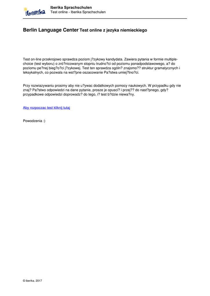 Iberika Sprachschulen Test online - Iberika Sprachschulen Berlin Language Center Test online z jezyka niemieckiego Test on-line przekrojowo sprawdza poziom j?zykowy kandydata. Zawiera pytania w formie multiplechoice (test wyboru) o zró?nicowanym stopniu trudno?ci od poziomu ponadpodstawowego, a? do poziomu pe?nej bieg?o?ci j?zykowej. Test ten sprawdza ogóln? znajomo?? struktur gramatycznych i leksykalnych, co pozwala na wst?pne oszacowanie Pa?stwa umiej?tno?ci. Przy rozwiazywaniu prosimy aby nie u?ywac dodatkowych pomocy naukowych. W przypadku gdy nie znaj? Pa?stwo odpowiedzi na dane pytanie, prosze je opusci? i przej?? do nast?pnego, gdy? przypadkowe odpowiedzi doprowadz? do tego, i? test b?dzie niewa?ny. Aby rozpoczac test kliknij tutaj Powodzenia :) © iberika. 2017 Powered by TCPDF (www.tcpdf.org)
