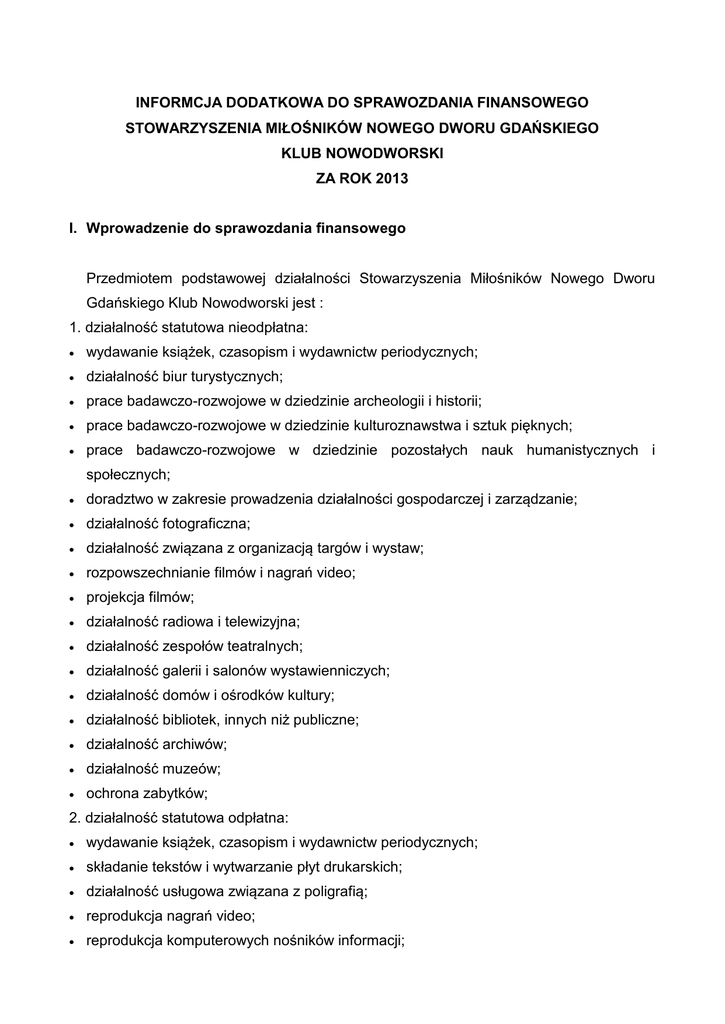 INFORMCJA DODATKOWA DO SPRAWOZDANIA FINANSOWEGO STOWARZYSZENIA MIŁOŚNIKÓW NOWEGO DWORU GDAŃSKIEGO KLUB NOWODWORSKI ZA ROK 2013 I. Wprowadzenie do sprawozdania finansowego Przedmiotem podstawowej działalności Stowarzyszenia Miłośników Nowego Dworu Gdańskiego Klub Nowodworski jest : 1. działalność statutowa nieodpłatna: wydawanie książek, czasopism i wydawnictw periodycznych; działalność biur turystycznych; prace badawczo-rozwojowe w dziedzinie archeologii i historii; prace badawczo-rozwojowe w dziedzinie kulturoznawstwa i sztuk pięknych; prace badawczo-rozwojowe w dziedzinie pozostałych nauk humanistycznych i społecznych; doradztwo w zakresie prowadzenia działalności gospodarczej i zarządzanie; działalność fotograficzna; działalność związana z organizacją targów i wystaw; rozpowszechnianie filmów i nagrań video; projekcja filmów; działalność radiowa i telewizyjna; działalność zespołów teatralnych; działalność galerii i salonów wystawienniczych; działalność domów i ośrodków kultury; działalność bibliotek, innych niż publiczne; działalność archiwów; działalność muzeów; ochrona zabytków; 2. działalność statutowa odpłatna: wydawanie książek, czasopism i wydawnictw periodycznych; składanie tekstów i wytwarzanie płyt drukarskich; działalność usługowa związana z poligrafią; reprodukcja nagrań video; reprodukcja komputerowych nośników informacji; sprzedaż detaliczna w niewyspecjalizowanych sklepach z przewagą żywności, napojów i wyrobów tytoniowych; działalność biur turystycznych; doradztwo w zakresie prowadzenia działalności gospodarczej i zarządzanie; działalność fotograficzna; działalność związana z tłumaczeniami i usługami sekretarskimi; działalność związana z organizacją targów i wystaw; produkcja filmów i nagrań; kształcenie ustawiczne dorosłych i pozostałe formy kształcenia; rozpowszechnianie filmów i nagrań video; projekcja filmów; działalność radiowa i telewizyjna; działalność zespołów teatralnych; działalność galerii i salonów wystawienniczych; działalność domów i ośrodków kultury; działalność bibliotek, innych niż publiczne; działalność archiwów; działalność muzeów. Stowarzyszenie Miłośników Nowego Dworu Gdańskiego Klub Nowodworski jest zarejestrowane w Krajowym Rejestrze Sądowym pod numerem 0000020430. Sprawozdanie finansowe obejmuje rok obrotowy od 01.01.2013 do 31.12.2013 r. Sprawozdanie finansowe sporządzone zostało na podstawie ksiąg rachunkowych prowadzonych w roku obrotowym zgodnie z przyjętymi i wprowadzonymi zasadami rachunkowymi (Uchwała Zarządu z dnia 02.04.2007 r.). Wykazane w bilansie na koniec roku obrotowego aktywa i pasywa wykazano w wartości nominalnej. Stowarzyszenie Miłośników Nowego Dworu Gdańskiego Klub Nowodworski nie prowadzi działalności gospodarczej. Na dzień 31.12.2013 Stowarzyszenie zatrudniało trzech pracowników. Ponadto czynności dotyczące realizacji zadań statutowych prowadzą członkowie Klubu Nowodworskiego nieodpłatnie. II. Omówienie wybranych zagadnień 1. Należności na 31.12.2013 roku wynoszą 6.495,17 w tym: a) należności z tytułu pozostałych rozrachunków (nadpłaty) 26,82 TP S.A. 26,82 Politechnika Gdańska 65,00 b) należności z tytułu dostaw i usług Gmina Nowy Dwór Gdański Leszek Szczepkowski 5.246,22 4.546,22 c) należności z tytułu podatków, ceł, Składek ZUS PIT-4R FUZ d) pozostałe należności nadpłata wynagrodzenia M.Ciechanowska 700,00 459,63 1,00 458,63 697,50 697,50 2. Środki piniężne na dzień 31.12.2013 roku wynoszą 10.625,38 i są to: środki pieniężne zgromadzone na rachunkach bankowych środki pieniężne w kasie 10.619,33 6,05 3. Zobowiązania i rezerwy na 31.12.2013 roku wynoszą 1.980,98 w tym: a) zobowiązania z tytułu dostaw i usług 647,60 Biuro rachunkowe ABISAL ABIM s.c. 14,15 AIDER Marek Krause 130,00 Gdański Kantor Wydawniczy 303,45 b) zobowiązania z tytułu podatków, ceł, składek ZUS FUS 200,00 1.333,38 1.333,38 4. Rozliczenia międzyokresowe kosztów na dzień 31.12.2013 roku wynoszą 148,49 i jest to: abonament za przedłużenie domeny 148,49 5. Koszty finansowe na dzień 31.12.2013 roku wynoszą 190,14 i są to: odsetki od pożyczki 190,14 6. Przychody finansowe na dzień 31.12.2013 roku wynoszą 6.555,12 i są to: umorzona pożyczka odsetki od środków na rachunku bankowym 6.555,00 0,12 III. Koszty działalności statutowej i administracyjnej Stowarzyszenia Miłośników Nowego Dworu Gdańskiego Klub Nowodworski w 2013 roku wyniosły: Przychody z działalności statutowej (składki członkowskie) Przychody z działalności statutowej Przychody finansowe Ogółem przychody Darowizny Realizowane projekty Żuławski Park Historyczny OPP – 1 % Pozostałe przychody z działalnosci statutowej Przychody z działalności statutowej 854,00 292.520,99 6.555,12 299.930,11 29.460,02 132.542,59 40.188,00 699,40 89.630,98 292.520,99 Realizowane projekty 1. Bioblitz – metoda regionalnej edukacji ekologicznej 3.000,00 2. Akcja Tuga – Wiosenne porządki 1.000,00 3. Jest wiele do odkrycia 4.000,00 4. Muzeum Żuławskie - serce Szlaku Mennonitów 8.670,00 5. Przywrócić szacunek zabytkom w delcie Wisły 6. Wolontariat to jest to 106.322,59 5.100,00 7. Duchy Nowego Dworu Gdańskiego Koszty statutowe 4.450,00 242.047,31 Koszty administracyjne 42.840,13 Koszty finansowe 190,14 Ogółem koszty 285.077,58 Koszty realizowanych projektów 1. Bioblitz – metoda regionalnej edukacji ekologicznej 5.585,00 2. Jest wiele do odkrycia 6.480,56 3. Muzeum Żuławskie - serce Szlaku Mennonitów 7.000,00 4. Duchy Nowego Dworu Gdańskiego 4.395,71 5. Akcja Tuga – Wiosenne porządki 1.000,00 6. Przywrócić szacunek zabytkom w delcie Wisły 7. Wolontariat to jest to 117.811,80 5.253,02 Przychody 299.930,11 Koszty 285.077,58