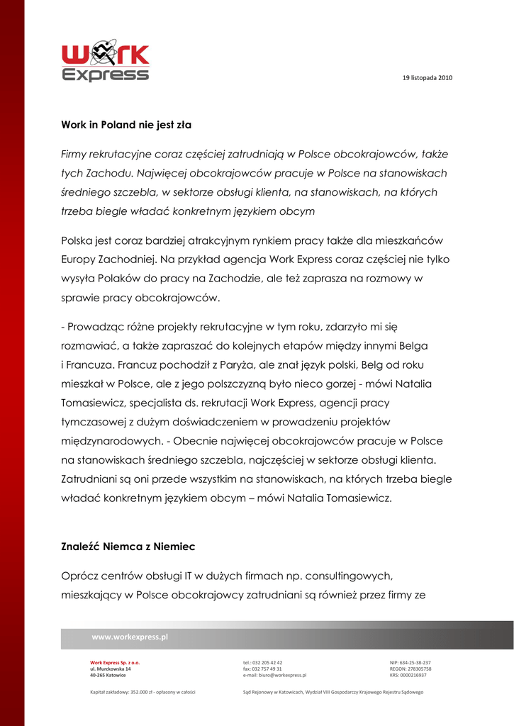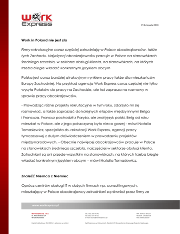 19 listopada 2010 Work in Poland nie jest zła Firmy rekrutacyjne coraz częściej zatrudniają w Polsce obcokrajowców, także tych Zachodu. Najwięcej obcokrajowców pracuje w Polsce na stanowiskach średniego szczebla, w sektorze obsługi klienta, na stanowiskach, na których trzeba biegle władać konkretnym językiem obcym Polska jest coraz bardziej atrakcyjnym rynkiem pracy także dla mieszkańców Europy Zachodniej. Na przykład agencja Work Express coraz częściej nie tylko wysyła Polaków do pracy na Zachodzie, ale też zaprasza na rozmowy w sprawie pracy obcokrajowców. - Prowadząc różne projekty rekrutacyjne w tym roku, zdarzyło mi się rozmawiać, a także zapraszać do kolejnych etapów między innymi Belga i Francuza. Francuz pochodził z Paryża, ale znał język polski, Belg od roku mieszkał w Polsce, ale z jego polszczyzną było nieco gorzej - mówi Natalia Tomasiewicz, specjalista ds. rekrutacji Work Express, agencji pracy tymczasowej z dużym doświadczeniem w prowadzeniu projektów międzynarodowych. - Obecnie najwięcej obcokrajowców pracuje w Polsce na stanowiskach średniego szczebla, najczęściej w sektorze obsługi klienta. Zatrudniani są oni przede wszystkim na stanowiskach, na których trzeba biegle władać konkretnym językiem obcym – mówi Natalia Tomasiewicz. Znaleźć Niemca z Niemiec Oprócz centrów obsługi IT w dużych firmach np. consultingowych, mieszkający w Polsce obcokrajowcy zatrudniani są również przez firmy ze www.workexpress.pl Work Express Sp. z o.o. ul. Murckowska 14 40-265 Katowice tel.: 032 205 42 42 fax: 032 757 49 31 e-mail: [email protected] NIP: 634-25-38-237 REGON: 278305758 KRS: 0000216937 Kapitał zakładowy: 352.000 zł - opłacony w całości Sąd Rejonowy w Katowicach, Wydział VIII Gospodarczy Krajowego Rejestru Sądowego swojego kraju na stanowiskach przedstawicieli handlowych i ich zadanie to pozyskiwanie nowych klientów. Poszukując obcokrajowców eksperci Work Express zaczynają od tych, którzy mieszkają w Polsce. Jeśli np. klient chce zatrudnić rodowitego Niemca, rekruterzy najpierw docierają do tych kandydatów, którzy już pracują w naszym kraju. Dużo bardziej skomplikowany jest proces rekrutacji obcokrajowca. - Na bieżąco analizujemy i śledzimy rynek pracy i znamy oczekiwania kandydatów, wysokość wynagrodzeń w danej profesji w Polsce: zarówno realnych jak i oczekiwanych. Jesteśmy też w stanie ocenić, ile osób posiada odpowiednie kompetencje w danej branży. Po takiej analizie bardzo szybko orientujemy się, czy będzie relatywnie łatwo znaleźć daną osobę, czy też znalezienie jej graniczy z cudem. W tej drugiej sytuacji musimy razem z klientem zastanowić się nad innymi możliwościami. Kiedy musimy pozyskać kandydata np. z Niemiec też musimy odpowiedzieć sobie na te wszystkie pytania, a to wymaga analizy rynku niemieckiego – mówi ekspertka Work Express. Dodaje, że taka analiza zawsze wpływa na czas realizacji zlecenia, które może się przez to wydłużyć nawet o 3 tygodnie. Płaca już nie odstrasza Najczęstszym powodem, dla którego obcokrajowcy decydują się na podjęcie pracy w Polsce jest rodzina, którą mają lub zamierzają tu założyć. Ale także zarobki nie odstraszają już tak, jak jeszcze pięć lat temu. Są one na drugim miejscu w hierarchii powodów przeprowadzki. www.workexpress.pl Work Express Sp. z o.o. ul. Murckowska 14 40-265 Katowice tel.: 032 205 42 42 fax: 032 757 49 31 e-mail: [email protected] NIP: 634-25-38-237 REGON: 278305758 KRS: 0000216937 Kapitał zakładowy: 352.000 zł - opłacony w całości Sąd Rejonowy w Katowicach, Wydział VIII Gospodarczy Krajowego Rejestru Sądowego - Z moich obserwacji wynika, że obcokrajowcy, którzy musieliby za pracą sprowadzić się do Polski, mają zwykle wyższe oczekiwania finansowe niż Polacy. Nie zauważyłam jednak, żeby obcokrajowcy w Polsce byli traktowani lepiej niż Polacy czy też w jakiś szczególny sposób – mówi Natalia Tomasiewicz. – Z drugiej strony, jeśli pracodawcy zależy na osobie z danymi kompetencjami znajomością języka i doświadczeniem w danej branży, to będzie gotów spełnić jej oczekiwania finansowe bez względu na to, czy kandydat jest Polakiem, czy obcokrajowcem. Zdaniem ekspertki Work Express, choć w Polsce częściej niż pięć lat temu zdarzają się rekrutacje pracowników zza granicy to jednak dla zlecających rekrutacje zwykle najważniejsze są kompetencje, a nie narodowość. - W tym roku zdarzyła się wręcz sytuacja odwrotna. Firma niemiecka chciała otworzyć przedstawicielstwo w Polsce i szukała osoby z konkretnymi kwalifikacjami w Polsce. Takiej rekrutacji oczywiście jesteśmy się w stanie podjąć po dokładnym przeanalizowaniu rynku i skonfrontowaniem, czy to, co dana firma proponuje pracownikom jest zgodne z oczekiwaniami osób pracujących na takich stanowiskach – mówi Natalia Tomasiewicz. Dodaje, że sam proces rekrutacji nie różni się zasadniczo od poszukiwania pracownika z Polski. Etapy rekrutacji (analiza i rozpoznanie rynku, wywiady telefonicznie, zaproszenia do rozmów, spotkania bezpośrednie, sesje testowe) są takie same i uniwersalne, aczkolwiek wszystko zależy od tego, jakie oczekiwania ma konkretny klient. www.workexpress.pl Work Express Sp. z o.o. ul. Murckowska 14 40-265 Katowice tel.: 032 205 42 42 fax: 032 757 49 31 e-mail: [email protected] NIP: 634-25-38-237 REGON: 278305758 KRS: 0000216937 Kapitał zakładowy: 352.000 zł - opłacony w całości Sąd Rejonowy w Katowicach, Wydział VIII Gospodarczy Krajowego Rejestru Sądowego *** Work Express (www.workexpress.pl) to certyfikowana agencja doradztwa personalnego i pracy tymczasowej, która działa na rynku od 2004 r. Firma oferuje szeroką gamę usług z zakresu pracy tymczasowej i rekrutacji personelu, pozostając jednym z liderów w zakresie leasingu pracowniczego. Centrala firmy znajduje się w Katowicach, a oddziały w Częstochowie, Gliwicach, Grodzisku