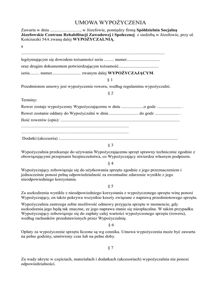 UMOWA WYPOŻYCZENIA Zawarta w dniu ..........................., w Józefowie, pomiędzy firmą Spółdzielnia Socjalną Józefowskie Centrum Rehabilitacji Zawodowej i Społecznej z siedzibą w Józefowie, przy ul. Kościuszki 54A zwaną dalej WYPOŻYCZALNIĄ, a ................................................................................................................................. legitymującym się dowodem tożsamości seria ......... numer.............................. oraz drugim dokumentem potwierdzającym tożsamość.................................... seria......... numer.......................... zwanym dalej WYPOŻYCZAJĄCYM. §1 Przedmiotem umowy jest wypożyczenie roweru, według regulaminu wypożyczalni. §2 Terminy: Rower zostaje wypożyczony Wypożyczającemu w dniu ....................o godz ...................... . Rower zostanie oddany do Wypożyczalni w dniu .......................... do godz ...................... . Ilość rowerów (opis): ........................................................................................................... ........................................................................................................... ........................................................................................................... Dodatki:(akcesoria) :.......................................................................................................... §3 Wypożyczalnia przekazuje do używania Wypożyczającemu sprzęt sprawny technicznie zgodnie z obowiązującymi przepisami bezpieczeństwa, co Wypożyczający stwierdza własnym podpisem. §4 Wypożyczający zobowiązuje się do użytkowania sprzętu zgodnie z jego przeznaczeniem i jednocześnie ponosi pełną odpowiedzialność za ewentualne zdarzenie wynikłe z jego nieodpowiedniego korzystania. §5 Za uszkodzenia wynikłe z nieodpowiedniego korzystania z wypożyczonego sprzętu winę ponosi Wypożyczający, on także pokrywa wszystkie koszty związane z naprawą przedmiotowego sprzętu. Wypożyczalnia zastrzega sobie możliwość odmowy przyjęcia sprzętu w momencie, gdy uszkodzenia jego będą tak znaczne, ze jego naprawa stanie się nieopłacalna. W takim przypadku Wypożyczający zobowiązuje się do zapłaty całej wartości wypożyczonego sprzętu (roweru), według rachunków przedstawionych przez Wypożyczalnię. §6 Opłaty za wypożyczenie sprzętu liczone są wg cennika. Umowa wypożyczenia może być zawarta na pełne godziny, umówiony czas lub na pełne doby. §7 Za wady ukryte w częściach, materiałach i dodatkach (akcesoriach) wypożyczalnia nie ponosi odpowiedzialności. §8 Opłaty za wypożyczenie roweru pobierana jest z góry gotówką za cały okres wypożyczenia. W przypadku przekroczenia terminu zwrotu roweru, Wypożyczalnia zastrzega sobie możliwość naliczania kary za zwłokę w wysokości opłaty za wypożyczanie roweru na jeden dzień, przy każdym dniu zwłoki w oddaniu sprzętu §9 Do innych nie uregulowanych przepisów niniejszej umowy zastosowanie znajdują przepisy Kodeksu Cywilnego. Wszystkie spory wynikłe w drodze zawartej umowy rozstrzygane będą przez Sąd Rejonowy właściwy dla adresu Wypożyczalni. § 10 Umowę sporządzoną w dwóch jednobrzmiących egzemplarzach, po jednym dla każdej ze stron. ................................................. ................................................ Przedstawiciel Wypożyczalni Wypożyczający
