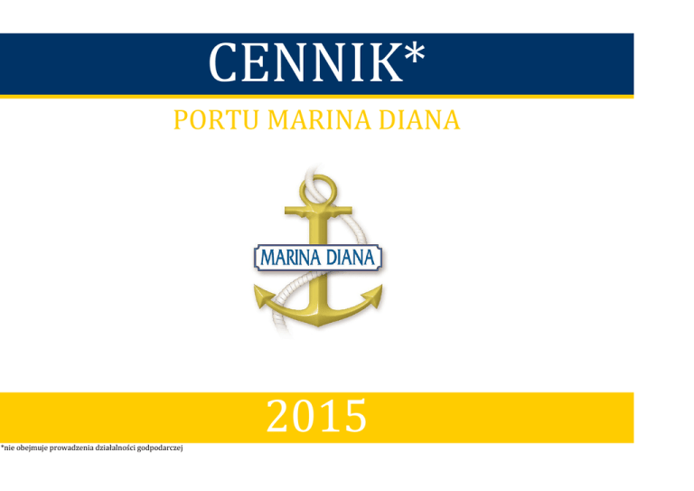 CENNIK* PORTU MARINA DIANA 2015 *nie obejmuje prowadzenia działalności godpodarczej RABATY8 10% 8% 8% 5% jednorazowa opłata do 31 października płatność w dwóch równych datach: I rata do 31.10 II rata do 30.04 jednorazowa opłata do 28.02 ZIMA2 + SEZON1 SEZON1 jednorazowa opłata do 30.04 5% DLA STAŁYCH KLIENTÓW PRZECHOWYWANIE SPRZĘTU NA PARKINGU3,4 ROZMIAR poniżej 5,01 m od 5,01 m do 7,00 m od 7,00 m do 9,00 m powyżej 9,00 m SKUTERY WODNE poniżej 4,31 m ZIMA2 500 750 800 CENY USTALANE INDYWIDUALNIE 500 TYDZIEŃ 260 280 300 MIESIĄC 780 800 900 SEZON1 3000 3600 4500 SUCHY DOK + SLIP5 250 - 650 2500 SEZON - trwa od 01.05 do 31.10 1 ZIMA - trwa od 01.11 do 30.04 2 Wszystkie ceny brutto podane w zł [PLN] 3 Ceny za przechowywanie łodzi na własnej przyczepie 4 Przechowywanie jednostki na własnej przyczepie, slipowania na żądanie klienta przez Bosmana Portu 5 Przełożenie jachtu - brak przyczepy, przełożenie z przyczepy na kobyłki, styropiany itp. 6 W cenie cumowania jachtu jest: parking przyczepy podłodziowej, parking samochodu na parkingu "leśnym", obsługa Bosmana, ochrona 24h, rabat 10% na Restaurację i Hotel Marina Diana 7 Rabaty nie łączą się 8 Miejsca przy bojach oraz miejsca wyznaczone przez pracownika Portu 9 USŁUGI DODATKOWE3 MYCIE JACHTU SLIP (w jedną stronę) DNO I BURTY ŚRODEK SAMODZIELNIE PRZEZ BOSMANA 150 - 300 300 40 60 PRZEŁOŻENIE JACHTU6 50 - 150 CUMOWANIE W PORCIE3,7 ILOŚĆ SLIPÓW KATEGORIA CENOWA I II III do 6h (dzień) IV V VI VII9 bez opłat - DOBA 120 110 100 80 60 50 40 - TYDZIEŃ 490 450 420 340 270 250 200 - MIESIĄC 1460 1200 1160 1000 800 600 520 - SEZON1 7300 6000 5300 4000 3600 2880 2600 2 SEZON - trwa od 01.05 do 31.10 1 ZIMA - trwa od 01.11 do 30.04 2 Wszystkie ceny brutto podane w zł [PLN] 3 Ceny za przechowywanie łodzi na własnej przyczepie 4 Przechowywanie jednostki na własnej przyczepie, slipowania na żądanie klienta przez Bosmana Portu 5 Przełożenie jachtu - brak przyczepy, przełożenie z przyczepy na kobyłki, styropiany itp. 6 W cenie cumowania jachtu jest: parking przyczepy podłodziowej, parking samochodu na parkingu "leśnym", obsługa Bosmana, ochrona 24h, rabat 10% na Restaurację i Hotel Marina Diana 7 Rabaty nie łączą się 8 Miejsca przy bojach oraz miejsca wyznaczone przez pracownika Portu 9