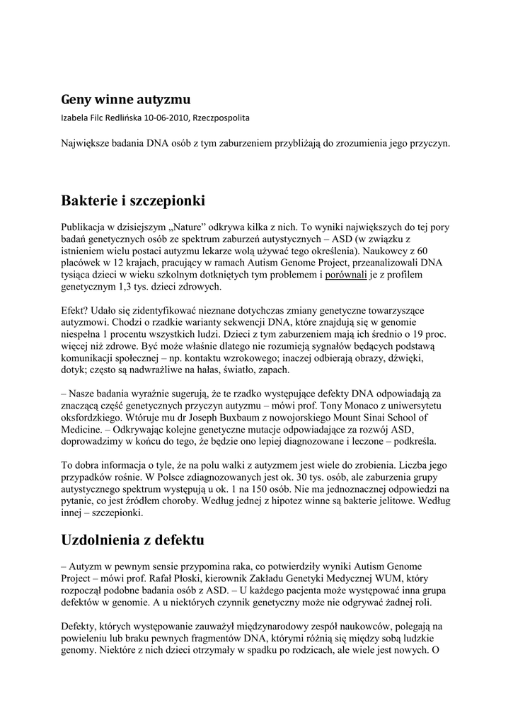 Geny winne autyzmu Izabela Filc Redlińska 10-06-2010, Rzeczpospolita Największe badania DNA osób z tym zaburzeniem przybliżają do zrozumienia jego przyczyn. Bakterie i szczepionki Publikacja w dzisiejszym „Nature” odkrywa kilka z nich. To wyniki największych do tej pory badań genetycznych osób ze spektrum zaburzeń autystycznych – ASD (w związku z istnieniem wielu postaci autyzmu lekarze wolą używać tego określenia). Naukowcy z 60 placówek w 12 krajach, pracujący w ramach Autism Genome Project, przeanalizowali DNA tysiąca dzieci w wieku szkolnym dotkniętych tym problemem i porównali je z profilem genetycznym 1,3 tys. dzieci zdrowych. Efekt? Udało się zidentyfikować nieznane dotychczas zmiany genetyczne towarzyszące autyzmowi. Chodzi o rzadkie warianty sekwencji DNA, które znajdują się w genomie niespełna 1 procentu wszystkich ludzi. Dzieci z tym zaburzeniem mają ich średnio o 19 proc. więcej niż zdrowe. Być może właśnie dlatego nie rozumieją sygnałów będących podstawą komunikacji społecznej – np. kontaktu wzrokowego; inaczej odbierają obrazy, dźwięki, dotyk; często są nadwrażliwe na hałas, światło, zapach. – Nasze badania wyraźnie sugerują, że te rzadko występujące defekty DNA odpowiadają za znaczącą część genetycznych przyczyn autyzmu – mówi prof. Tony Monaco z uniwersytetu oksfordzkiego. Wtóruje mu dr Joseph Buxbaum z nowojorskiego Mount Sinai School of Medicine. – Odkrywając kolejne genetyczne mutacje odpowiadające za rozwój ASD, doprowadzimy w końcu do tego, że będzie ono lepiej diagnozowane i leczone – podkreśla. To dobra informacja o tyle, że na polu walki z autyzmem jest wiele do zrobienia. Liczba jego przypadków rośnie. W Polsce zdiagnozowanych jest ok. 30 tys. osób, ale zaburzenia grupy autystycznego spektrum występują u ok. 1 na 150 osób. Nie ma jednoznacznej odpowiedzi na pytanie, co jest źródłem choroby. Według jednej z hipotez winne są bakterie jelitowe. Według innej – szczepionki. Uzdolnienia z defektu – Autyzm w pewnym sensie przypomina raka, co potwierdziły wyniki Autism Genome Project – mówi prof. Rafał Płoski, kierownik Zakładu Genetyki Medycznej WUM, który rozpoczął podobne badania osób z ASD. – U każdego pacjenta może występować inna grupa defektów w genomie. A u niektórych czynnik genetyczny może nie odgrywać żadnej roli. Defekty, których występowanie zauważył międzynarodowy zespół naukowców, polegają na powieleniu lub braku pewnych fragmentów DNA, którymi różnią się między sobą ludzkie genomy. Niektóre z nich dzieci otrzymały w spadku po rodzicach, ale wiele jest nowych. O części z nich wiadomo, że mają związek z upośledzeniem umysłowym. Podczas gdy każdy defekt z osobna odpowiada za niewielki ułamek przypadków autyzmu, to razem mają spory w nim udział. – W związku z istnieniem tak dużej ilości genów mogących wpływać na rozwój autyzmu przypuszcza się, że część z nich odpowiada zarazem za wyjątkowe uzdolnienia – mówi Michał Wroniszewski, psychiatra i dyrektor Ośrodka dla Dzieci i Osób Dorosłych z Autyzmem Fundacji Synapsis w Warszawie. Takie specyficzne, „wyspowe” talenty, np. muzyczne czy wyjątkową pamięć, ma co dziesiąta osoba z tym zaburzeniem. Jedną z nich był Peek, który pół roku temu zmarł na atak serca.