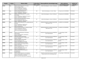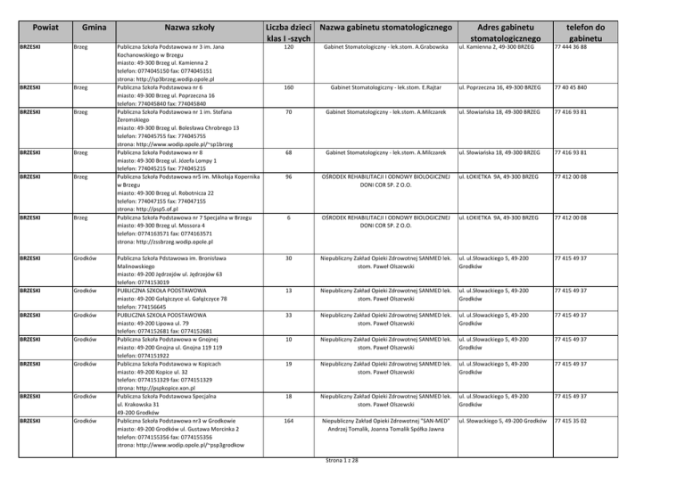 Powiat Gmina BRZESKI Brzeg BRZESKI Brzeg BRZESKI Brzeg BRZESKI Brzeg BRZESKI Brzeg BRZESKI Brzeg BRZESKI Grodków BRZESKI Grodków BRZESKI Grodków BRZESKI Grodków BRZESKI Grodków BRZESKI Grodków BRZESKI Grodków Nazwa szkoły Liczba dzieci Nazwa gabinetu stomatologicznego klas I -szych Publiczna Szkoła Podstawowa nr 3 im. Jana Kochanowskiego w Brzegu miasto: 49-300 Brzeg ul. Kamienna 2 telefon: 0774045150 fax: 0774045151 strona: http://sp3brzeg.wodip.opole.pl Publiczna Szkoła Podstawowa nr 6 miasto: 49-300 Brzeg ul. Poprzeczna 16 telefon: 774045840 fax: 774045840 Publiczna Szkoła Podstawowa nr 1 im. Stefana Żeromskiego miasto: 49-300 Brzeg ul. Bolesława Chrobrego 13 telefon: 774045755 fax: 774045755 strona: http://www.wodip.opole.pl/~sp1brzeg Publiczna Szkoła Podstawowa nr 8 miasto: 49-300 Brzeg ul. Józefa Lompy 1 telefon: 774045215 fax: 774045215 Publiczna Szkoła Podstawowa nr5 im. Mikołaja Kopernika w Brzegu miasto: 49-300 Brzeg ul. Robotnicza 22 telefon: 774047155 fax: 774047155 strona: http://psp5.of.pl Publiczna Szkoła Podstawowa nr 7 Specjalna w Brzegu miasto: 49-300 Brzeg ul. Mossora 4 telefon: 0774163571 fax: 0774163571 strona: http://zssbrzeg.wodip.opole.pl 120 Gabinet Stomatologiczny - lek.stom. A.Grabowska 160 Publiczna Szkoła Pdstawowa im. Bronisława Malinowskiego miasto: 49-200 Jędrzejów ul. Jędrzejów 63 telefon: 0774153019 PUBLICZNA SZKOŁA PODSTAWOWA miasto: 49-200 Gałążczyce ul. Gałążczyce 78 telefon: 774156645 PUBLICZNA SZKOŁA PODSTAWOWA miasto: 49-200 Lipowa ul. 79 telefon: 0774152681 fax: 0774152681 Publiczna Szkoła Podstawowa w Gnojnej miasto: 49-200 Gnojna ul. Gnojna 119 119 telefon: 0774151922 Publiczna Szkoła Podstawowa w Kopicach miasto: 49-200 Kopice ul. 32 telefon: 0774151329 fax: 0774151329 strona: http://pspkopice.xon.pl Publiczna Szkoła Podstawowa Specjalna ul. Krakowska 31 49-200 Grodków Publiczna Szkoła Podstawowa nr3 w Grodkowie miasto: 49-200 Grodków ul. Gustawa Morcinka 2 telefon: 0774155356 fax: 0774155356 strona: http://www.wodip.opole.pl/~psp3grodkow Adres gabinetu stomatologicznego telefon do gabinetu ul. Kamienna 2, 49-300 BRZEG 77 444 36 88 Gabinet Stomatologiczny - lek.stom. E.Rajtar ul. Poprzeczna 16, 49-300 BRZEG 77 40 45 840 70 Gabinet Stomatologiczny - lek.stom. A.Milczarek ul. Słowiaoska 18, 49-300 BRZEG 77 416 93 81 68 Gabinet Stomatologiczny - lek.stom. A.Milczarek ul. Słowiaoska 18, 49-300 BRZEG 77 416 93 81 96 OŚRODEK REHABILITACJI I ODNOWY BIOLOGICZNEJ DONI COR SP. Z O.O. ul. ŁOKIETKA 9A, 49-300 BRZEG 77 412 00 08 6 OŚRODEK REHABILITACJI I ODNOWY BIOLOGICZNEJ DONI COR SP. Z O.O. ul. ŁOKIETKA 9A, 49-300 BRZEG 77 412 00 08 30 Niepubliczny Zakład Opieki Zdrowotnej SANMED lek. stom. Paweł Olszewski ul. ul.Słowackiego 5, 49-200 Grodków 77 415 49 37 13 Niepubliczny Zakład Opieki Zdrowotnej SANMED lek. stom. Paweł Olszewski ul. ul.Słowackiego 5, 49-200 Grodków 77 415 49 37 33 Niepubliczny Zakład Opieki Zdrowotnej SANMED lek. stom. Paweł Olszewski ul. ul.Słowackiego 5, 49-200 Grodków 77 415 49 37 10 Niepubliczny Zakład Opieki Zdrowotnej SANMED lek. stom. Paweł Olszewski ul. ul.Słowackiego 5, 49-200 Grodków 77 415 49 37 19 Niepubliczny Zakład Opieki Zdrowotnej SANMED lek. stom. Paweł Olszewski ul. ul.Słowackiego 5, 49-200 Grodków 77 415 49 37 18 Niepubliczny Zakład Opieki Zdrowotnej SANMED lek. stom. Paweł Olszewski ul. ul.Słowackiego 5, 49-200 Grodków 77 415 49 37 164 Niepubliczny Zakład Opieki Zdrowotnej "SAN-MED" Andrzej Tomalik, Joanna Tomalik Spółka Jawna ul. Słowackiego 5, 49-200 Grodków 77 415 35 02 Strona 1 z 28 Powiat Gmina BRZESKI Grodków BRZESKI Lewin Brzeski BRZESKI Lewin Brzeski BRZESKI Lewin Brzeski BRZESKI Lubsza BRZESKI Lubsza BRZESKI Lubsza BRZESKI Lubsza BRZESKI Lubsza BRZESKI Olszanka BRZESKI Olszanka BRZESKI Olszanka BRZESKI Olszanka Nazwa szkoły Publiczna Szkoła Podstawowa w Kolnicy miasto: 49-200 Kolnica ul. 105 telefon: 774152213 Publiczna Szkoła Podstawowa miasto: 49-330 Łosiów ul. Słowackiego 9 telefon: 0774125326 fax: 0774125326 Publiczna Szkoła Podstawowa miasto: 49-340 Lewin Brzeski ul. T. Kościuszki 61 telefon: 0774127591 fax: 0774127638 strona: http://sp_lewin_brzeski.wodip.opole.pl Publiczna Szkoła Podstawowa miasto: 49-345 Skorogoszcz ul. Zamkowa 6 telefon: 0774121753 fax: 0774121753 strona: http://www.wodip.opole.pl/~spskorogoszcz Liczba dzieci Nazwa gabinetu stomatologicznego klas I -szych Adres gabinetu stomatologicznego telefon do gabinetu 25 Niepubliczny Zakład Opieki Zdrowotnej "SAN-MED" Andrzej Tomalik, Joanna Tomalik Spółka Jawna ul. Słowackiego 5, 49-200 Grodków 77 415 35 02 40 Gabinet Stomatologiczny - lek.stom. Z.JakubowskaJuraszczyk ul. Kościuszki 52, 49-340 LEWIN BRZESKI 77 415 01 10 122 Gabinet Stomatologiczny lek. stom. Barbara Beker ul. ul. Kościuszki 61/1, 49-340 Lewin 77 412 75 91 Brzeski 21 Gabinet Stomatologiczny lek. stom. Barbara Beker ul. ul. Kościuszki 61/1, 49-340 Lewin 77 412 75 91 Brzeski Publiczna Szkoła Podstawowa im. Jana Pawła II miasto: 49-315 Mąkoszyce ul. Pocztowa 4 telefon: 0774124490 fax: 0774124490 strona: http://www.psp.makoszyce.fr.pl Publiczna Szkoła Podstawowa Stowarzyszenia Przyjaciół Szkół Katolickich w Michałowicach 18 40-314 Michałowice Poczta: Pisarzowice telefon: 0774119005 fax: 0774119005 Publiczna Szkoła Podstawowa w Dobrzyniu miasto: 49-312 Dobrzyo ul. 35 telefon: 0774118226 fax: 0774118226 Publiczna Szkoła Podstawowa w Lubszy miasto: 49-313 Lubsza ul. Szkolna 2 telefon: 0774120841 fax: 0774120840 strona: http://www.wodip.opole.pl/~psplubsza Publiczna Szkoła Podstawowa w Czepielowicach miasto: 49-314 Czepielowice ul. 31 telefon: 0774120220 fax: 0774120221 strona: http://www.wodip.opole.pl/~sp_czepielowice 40 Gabinet Stomatologiczny - lek.stom. D.Mikołajczak ul. SZYDŁOWICE 26, 49-312 SZYDŁOWICE 77 412 69 82 20 Gabinet Stomatologiczny - lek.stom. D.Mikołajczak ul. SZYDŁOWICE 26, 49-312 SZYDŁOWICE 77 412 69 82 18 Gabinet Stomatologiczny - lek.stom. D.Mikołajczak ul