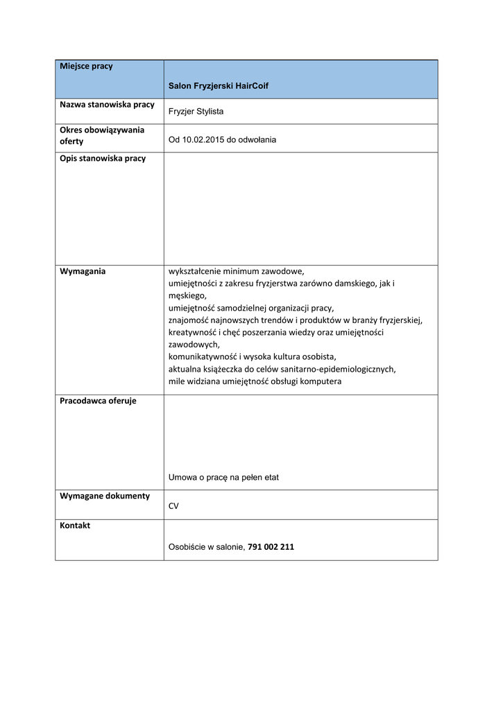 Miejsce pracy Salon Fryzjerski HairCoif Nazwa stanowiska pracy Okres obowiązywania oferty Fryzjer Stylista Od 10.02.2015 do odwołania Opis stanowiska pracy Wymagania wykształcenie minimum zawodowe, umiejętności z zakresu fryzjerstwa zarówno damskiego, jak i męskiego, umiejętność samodzielnej organizacji pracy, znajomość najnowszych trendów i produktów w branży fryzjerskiej, kreatywność i chęć poszerzania wiedzy oraz umiejętności zawodowych, komunikatywność i wysoka kultura osobista, aktualna książeczka do celów sanitarno-epidemiologicznych, mile widziana umiejętność obsługi komputera Pracodawca oferuje Umowa o pracę na pełen etat Wymagane dokumenty CV Kontakt Osobiście w salonie, 791 002 211