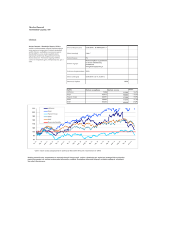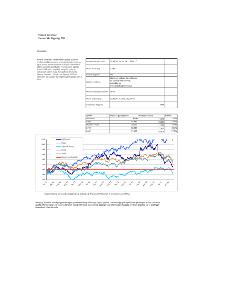 Nordea Gwarant Niemieckie Giganty 100 Informacja Nordea Gwarant – Niemieckie Giganty 100% to produkt strukturyzowany w formie ubezpieczenia na życie oparty na notowaniach 5 dużych niemieckich spółek. Zdaniem analityków renomowanej agencji Standard&Poors, ceny akcji wszystkich pięciu wybranych spółek mają duży potencjał wzrostu. Nordea Gwarant – Niemieckie Giganty 100% to szansa na osiągnięcie zysku przewyższającego zysk z lokat. Umowa Ubezpieczenia 12.09.2011 r. do 14.11.2014 r.* Okres inwestycji 3 lata * Poziom Kuponu 7% Wartośc wykupu Wartości wykupu są podawane na stronie internetowej produktu na www.pkoubezpieczenia.pl Ochrona ubezpieczeniowa 101% Okres subskrypcji 12.09.2011r. do 07.10.2011r. 100% Gwarancja Kapitału Spółka Lufthansa 220 200 Wartość początkowa zmiana Wartość obecna 9,866 11,090 12,4% Bayer 45,912 98,880 115,4% Thyssen Krupp 20,597 17,320 -15,9% BMW 58,489 77,410 32,3% BASF 51,655 65,610 27,0% Lufthansa Bayer Thyssen Krupp 180 BMW 160 BASF Gwarancja Kapitału 140 120 100 80 60 * jeśli w trakcie okresu ubezpiczenia nie spełnią się Warunek I i Warunek II (wymienione w OWU) Niniejszy materiał został przygotowany na podstawie danych historycznych, zgodnie z obowiązującymi regulacjami prawnymi. Ma on charakter czysto informacyjny i nie stanowi zarazem pełnej informacji o produkcie. Szczegółowe informacje dotyczące produktu znajdują się w Ogólnych Warunkach Ubezpieczenia.