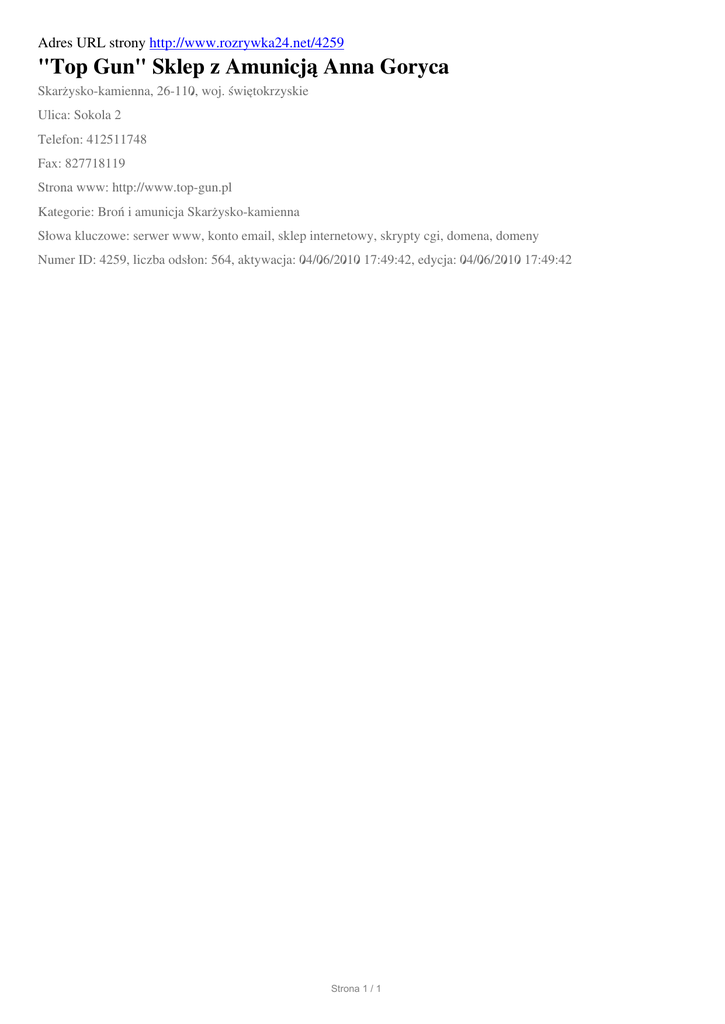 Adres URL strony http://www.rozrywka24.net/4259 "Top Gun" Sklep z Amunicją Anna Goryca Skarżysko-kamienna, 26-110, woj. świętokrzyskie Ulica: Sokola 2 Telefon: 412511748 Fax: 827718119 Strona www: http://www.top-gun.pl Kategorie: Broń i amunicja Skarżysko-kamienna Słowa kluczowe: serwer www, konto email, sklep internetowy, skrypty cgi, domena, domeny Numer ID: 4259, liczba odsłon: 564, aktywacja: 04/06/2010 17:49:42, edycja: 04/06/2010 17:49:42 Strona 1 / 1