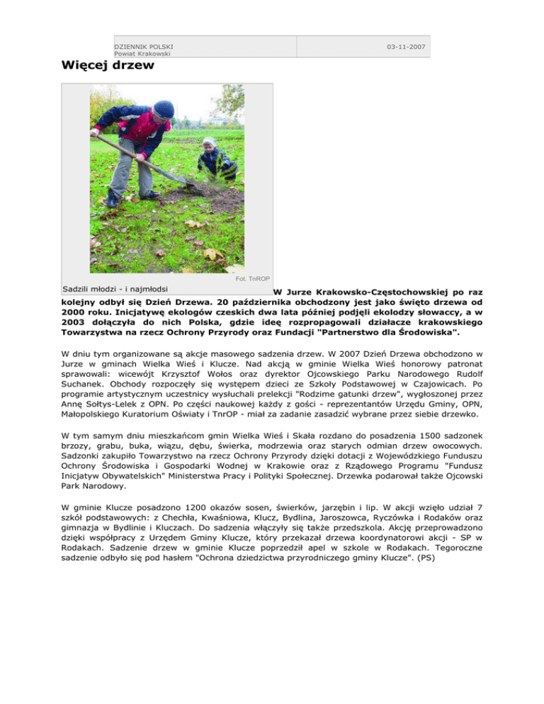 DZIENNIK POLSKI Powiat Krakowski 03-11-2007 Więcej drzew Fot. TnROP Sadzili młodzi - i najmłodsi W Jurze Krakowsko-Częstochowskiej po raz kolejny odbył się Dzień Drzewa. 20 października obchodzony jest jako święto drzewa od 2000 roku. Inicjatywę ekologów czeskich dwa lata później podjęli ekolodzy słowaccy, a w 2003 dołączyła do nich Polska, gdzie ideę rozpropagowali działacze krakowskiego Towarzystwa na rzecz Ochrony Przyrody oraz Fundacji "Partnerstwo dla Środowiska". W dniu tym organizowane są akcje masowego sadzenia drzew. W 2007 Dzień Drzewa obchodzono w Jurze w gminach Wielka Wieś i Klucze. Nad akcją w gminie Wielka Wieś honorowy patronat sprawowali: wicewójt Krzysztof Wołos oraz dyrektor Ojcowskiego Parku Narodowego Rudolf Suchanek. Obchody rozpoczęły się występem dzieci ze Szkoły Podstawowej w Czajowicach. Po programie artystycznym uczestnicy wysłuchali prelekcji "Rodzime gatunki drzew", wygłoszonej przez Annę Sołtys-Lelek z OPN. Po części naukowej kaŜdy z gości - reprezentantów Urzędu Gminy, OPN, Małopolskiego Kuratorium Oświaty i TnrOP - miał za zadanie zasadzić wybrane przez siebie drzewko. W tym samym dniu mieszkańcom gmin Wielka Wieś i Skała rozdano do posadzenia 1500 sadzonek brzozy, grabu, buka, wiązu, dębu, świerka, modrzewia oraz starych odmian drzew owocowych. Sadzonki zakupiło Towarzystwo na rzecz Ochrony Przyrody dzięki dotacji z Wojewódzkiego Funduszu Ochrony Środowiska i Gospodarki Wodnej w Krakowie oraz z Rządowego Programu "Fundusz Inicjatyw Obywatelskich" Ministerstwa Pracy i Polityki Społecznej. Drzewka podarował takŜe Ojcowski Park Narodowy. W gminie Klucze posadzono 1200 okazów sosen, świerków, jarzębin i lip. W akcji wzięło udział 7 szkół podstawowych: z Chechła, Kwaśniowa, Klucz, Bydlina, Jaroszowca, Ryczówka i Rodaków oraz gimnazja w Bydlinie i Kluczach. Do sadzenia włączyły się takŜe przedszkola. Akcję przeprowadzono dzięki współpracy z Urzędem Gminy Klucze, który przekazał drzewa koordynatorowi akcji - SP w Rodakach. Sadzenie drzew w gminie Klucze poprzedził apel w szkole w Rodakach. Tegoroczne sadzenie odbyło się pod hasłem "Ochrona dziedzictwa przyrodniczego gminy Klucze". (PS)