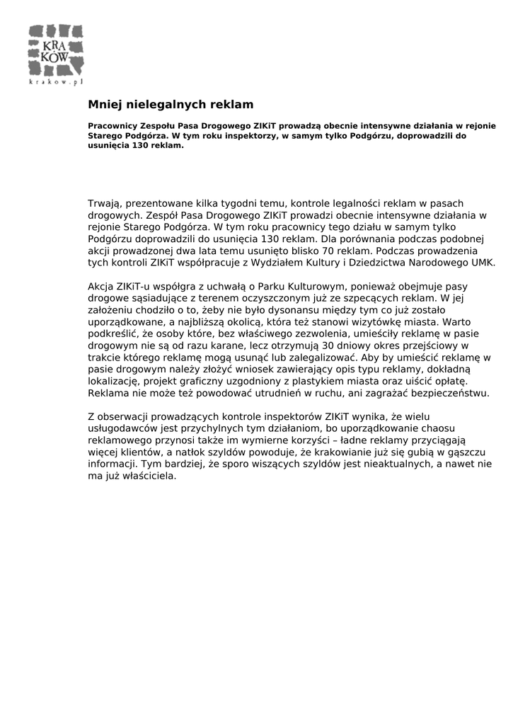 Mniej nielegalnych reklam Pracownicy Zespołu Pasa Drogowego ZIKiT prowadzą obecnie intensywne działania w rejonie Starego Podgórza. W tym roku inspektorzy, w samym tylko Podgórzu, doprowadzili do usunięcia 130 reklam. Trwają, prezentowane kilka tygodni temu, kontrole legalności reklam w pasach drogowych. Zespół Pasa Drogowego ZIKiT prowadzi obecnie intensywne działania w rejonie Starego Podgórza. W tym roku pracownicy tego działu w samym tylko Podgórzu doprowadzili do usunięcia 130 reklam. Dla porównania podczas podobnej akcji prowadzonej dwa lata temu usunięto blisko 70 reklam. Podczas prowadzenia tych kontroli ZIKiT współpracuje z Wydziałem Kultury i Dziedzictwa Narodowego UMK. Akcja ZIKiT-u współgra z uchwałą o Parku Kulturowym, ponieważ obejmuje pasy drogowe sąsiadujące z terenem oczyszczonym już ze szpecących reklam. W jej założeniu chodziło o to, żeby nie było dysonansu między tym co już zostało uporządkowane, a najbliższą okolicą, która też stanowi wizytówkę miasta. Warto podkreślić, że osoby które, bez właściwego zezwolenia, umieściły reklamę w pasie drogowym nie są od razu karane, lecz otrzymują 30 dniowy okres przejściowy w trakcie którego reklamę mogą usunąć lub zalegalizować. Aby by umieścić reklamę w pasie drogowym należy złożyć wniosek zawierający opis typu reklamy, dokładną lokalizację, projekt graficzny uzgodniony z plastykiem miasta oraz uiścić opłatę. Reklama nie może też powodować utrudnień w ruchu, ani zagrażać bezpieczeństwu. Z obserwacji prowadzących kontrole inspektorów ZIKiT wynika, że wielu usługodawców jest przychylnych tym działaniom, bo uporządkowanie chaosu reklamowego przynosi także im wymierne korzyści – ładne reklamy przyciągają więcej klientów, a natłok szyldów powoduje, że krakowianie już się gubią w gąszczu informacji. Tym bardziej, że sporo wiszących szyldów jest nieaktualnych, a nawet nie ma już właściciela. Powered by TCPDF (www.tcpdf.org)